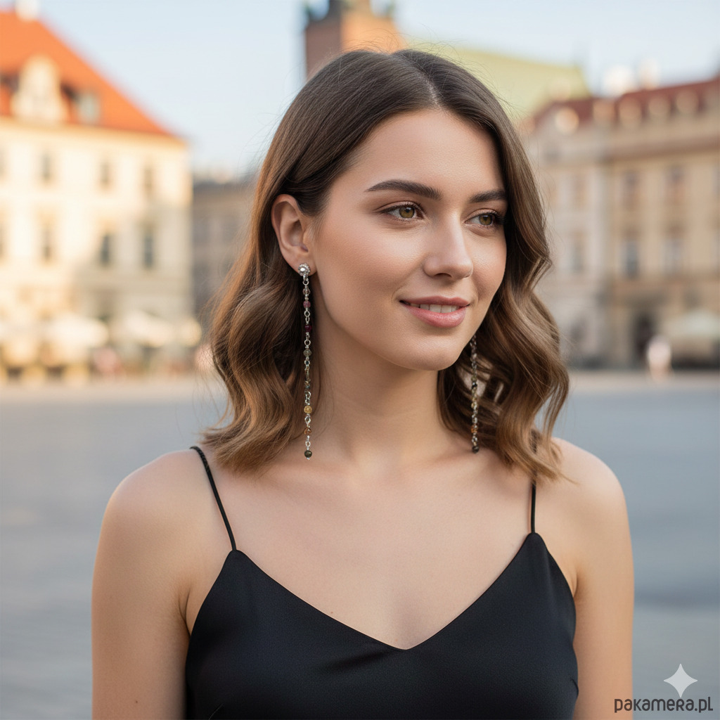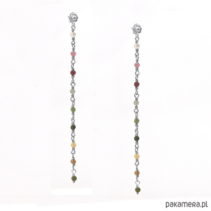 Długie, delikatne kolczyki ze srebra próby 925 z kolorowymi turmalinami. Na wygodnych biglach, sztyftach