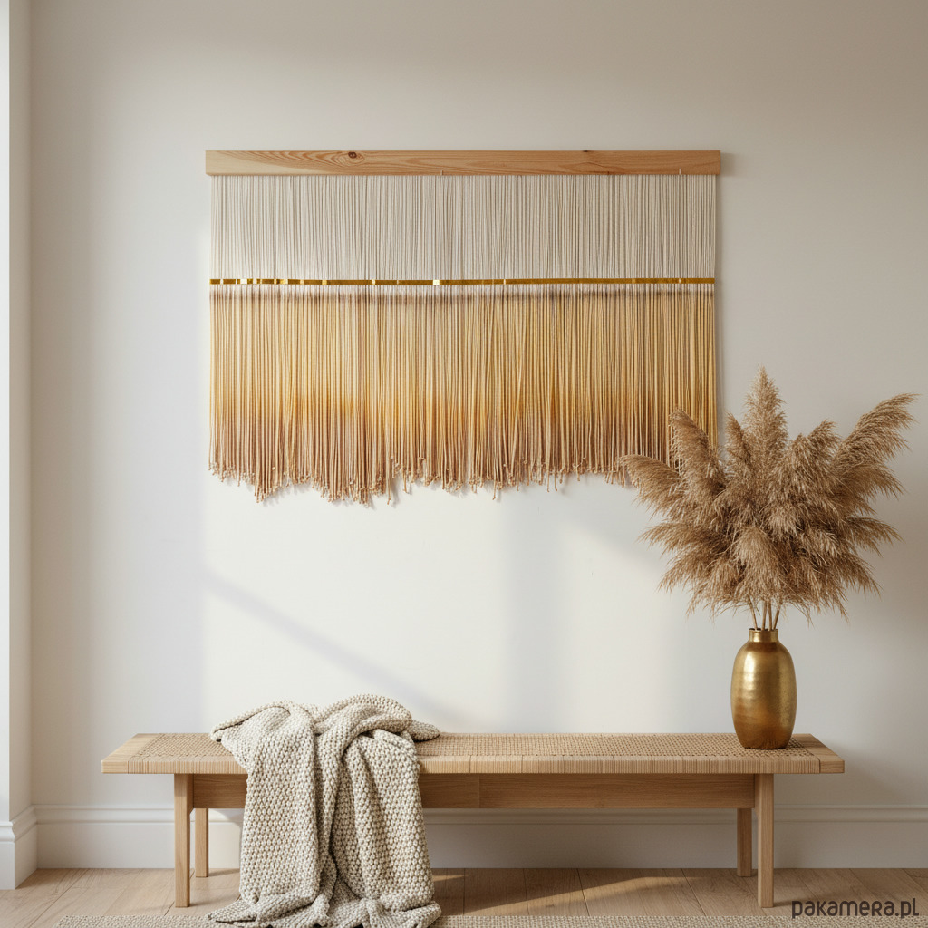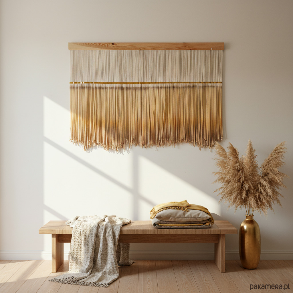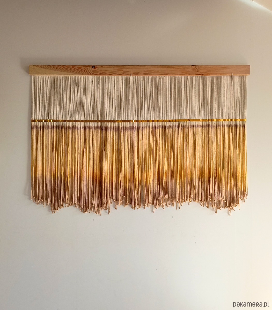 Nowoczesna makrama GOLDEN SAND to piękna dekoracja wnętrz, która przyciąga wzrok swoją unikalną estetyką. Barwiona w odcieniach żółci, piaskowego brązu, tworzy efekt gradientu, który dodaje ciepła i przytulności przestrzeni. Zdobiona złotym paskiem. Wykonana z naturalnych materiałów, idealnie wpisuje się w styl boho lub skandynawski. Drewniany element na górze nadaje całości stabilności i stylowego wykończenia. Tego typu dekoracja doskonale komponuje się z roślinnością, wprowadzając harmonię i spokój do wnętrza.
