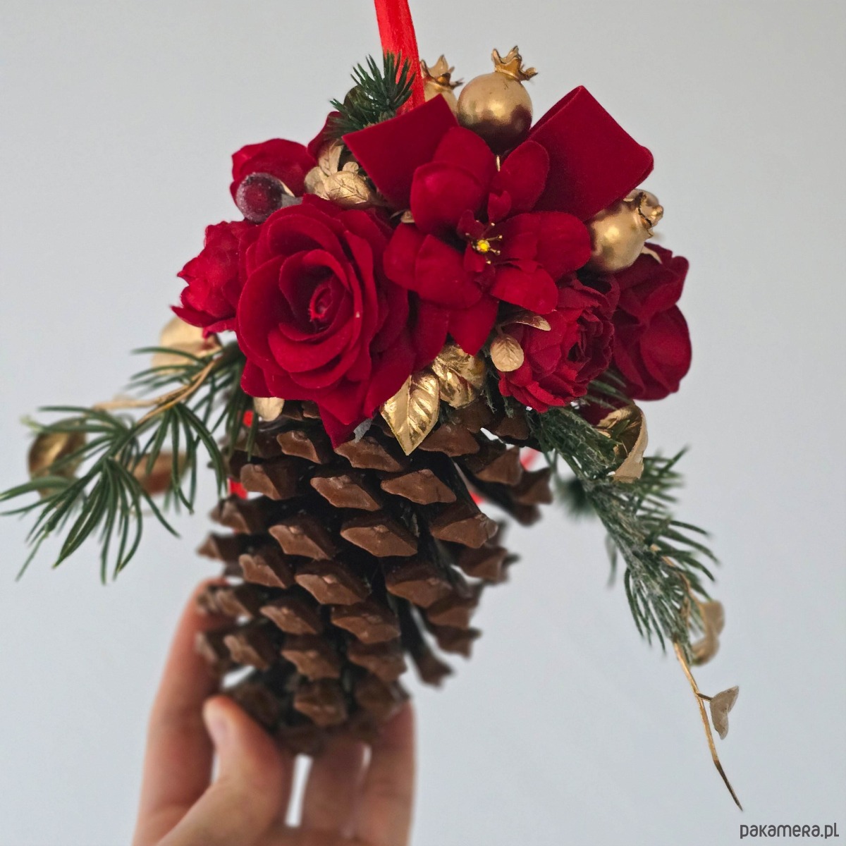 Bardzo duża, przepięknie zdobiona, naturalna szyszka. Ta nietypowa dekoracja będzie uroczym dodatkiem do świątecznego wystroju. Ozdoba przetrwa w doskonałym stanie kilka sezonów. Polecam również jako niezobowiązujący świąteczny prezent. Wykonana ręcznie, z najwyższą starannością, w pracowni "Lola White" w Polsce.