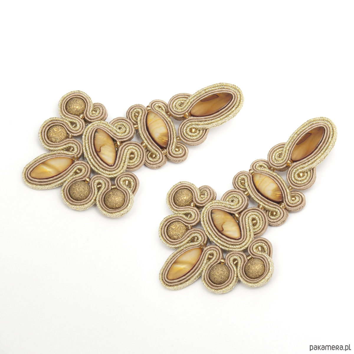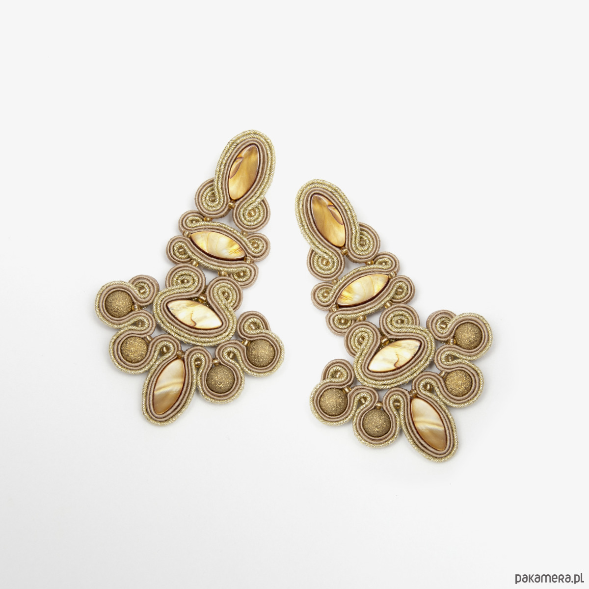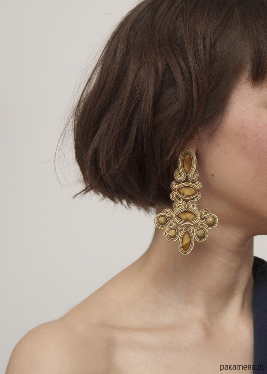 Kolczyki wykonane są techniką haftu soutache. Zrobione z pereł masy perłowej, metalowych tzw. "diamentowych" koralików, sznurków sutasz i sztyftów ze srebrnej stali chirurgicznej (antyalergiczna). Tył kolczyków stanowi cienki, delikatny filc. Długość kolczyka to około 9 cm, szerokość w najszerszym miejscu wynosi około 5,5 cm.