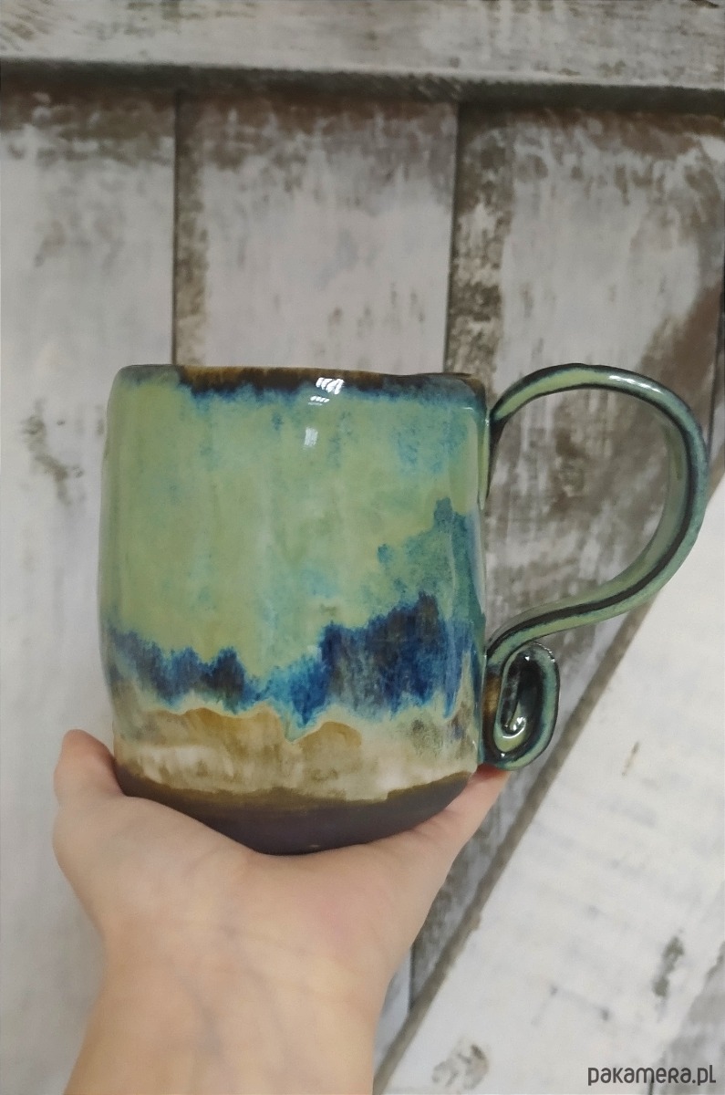 Unikatowy kubek ceramiczny ręcznie tworzony w odcieniach morskich tj. turkus ,zieleń , brąz oraz zawiniętym uchem .