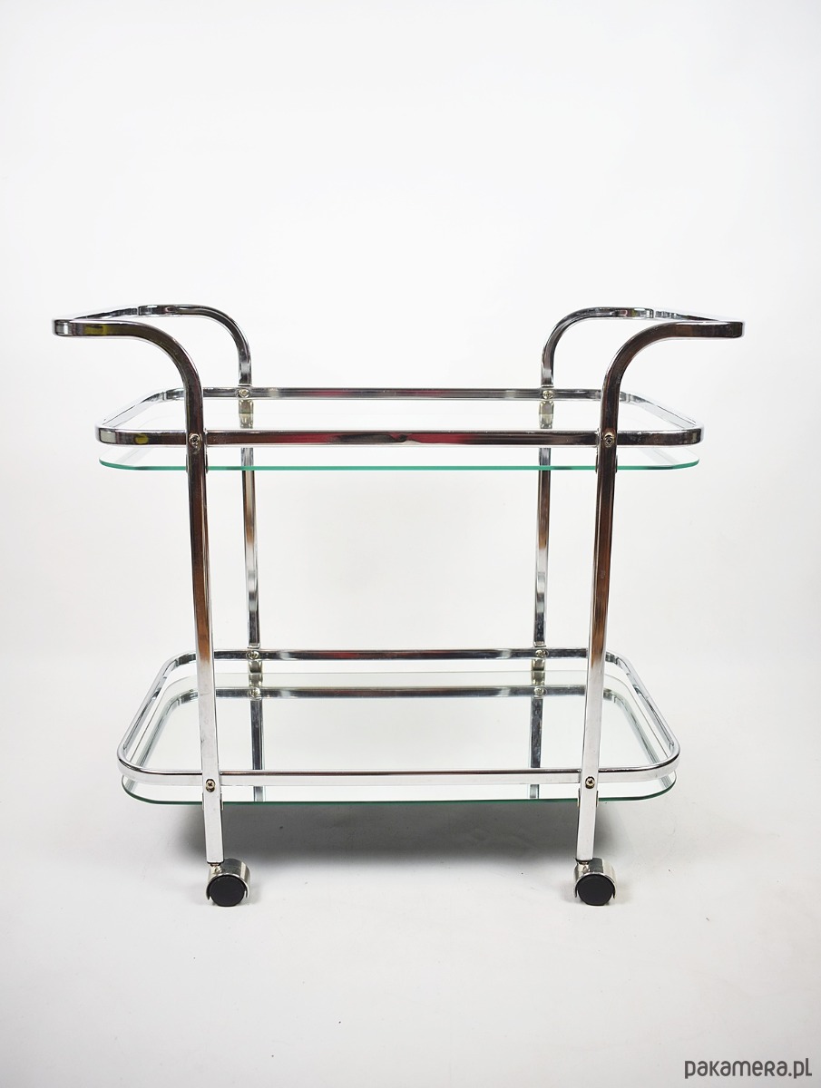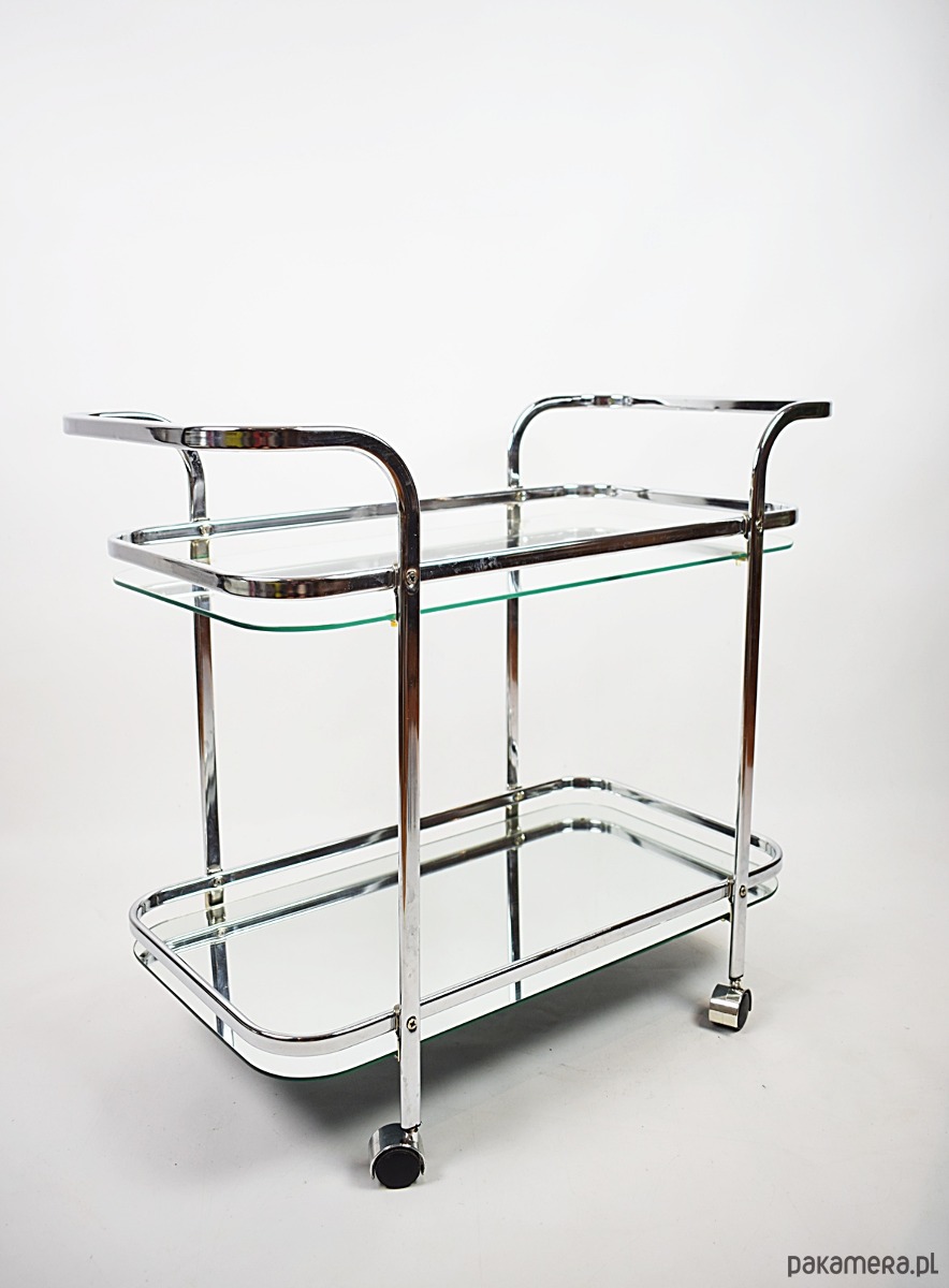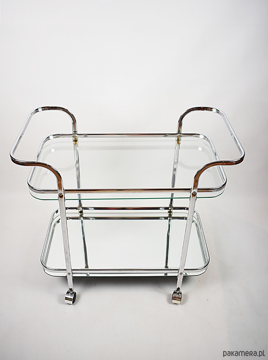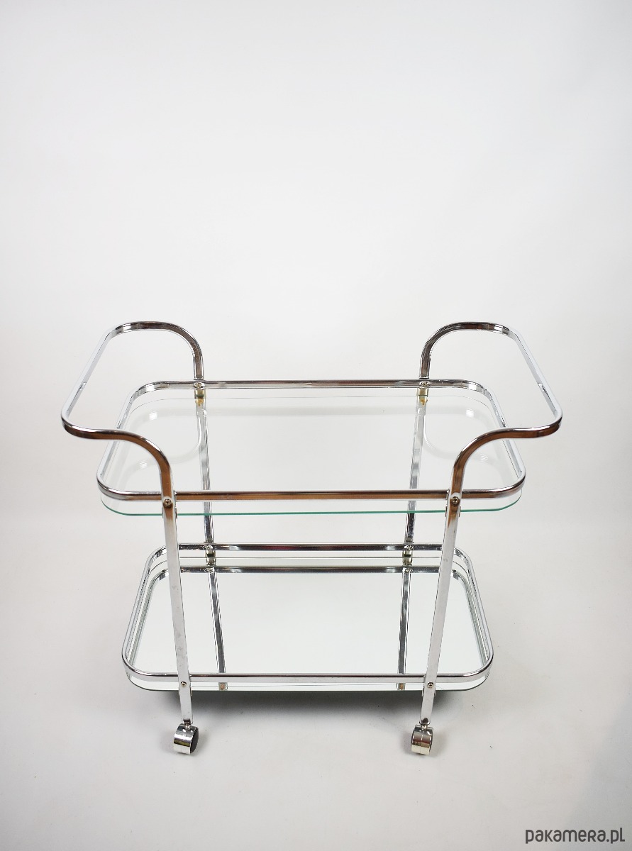 Wózek świetnie sprawdzi się jako mobilny minibar, pomocnik salonowy lub efektowny element dekoracyjny. Chromowany metal nadaje mu luksusowego wykończenia, a lustrzane półki podkreślają klimat retro, jednocześnie dodając wnętrzu blasku.Mebel w stanie dobrym posiada minimalne ślady czasu.