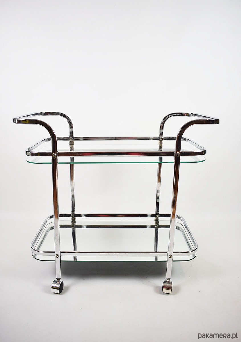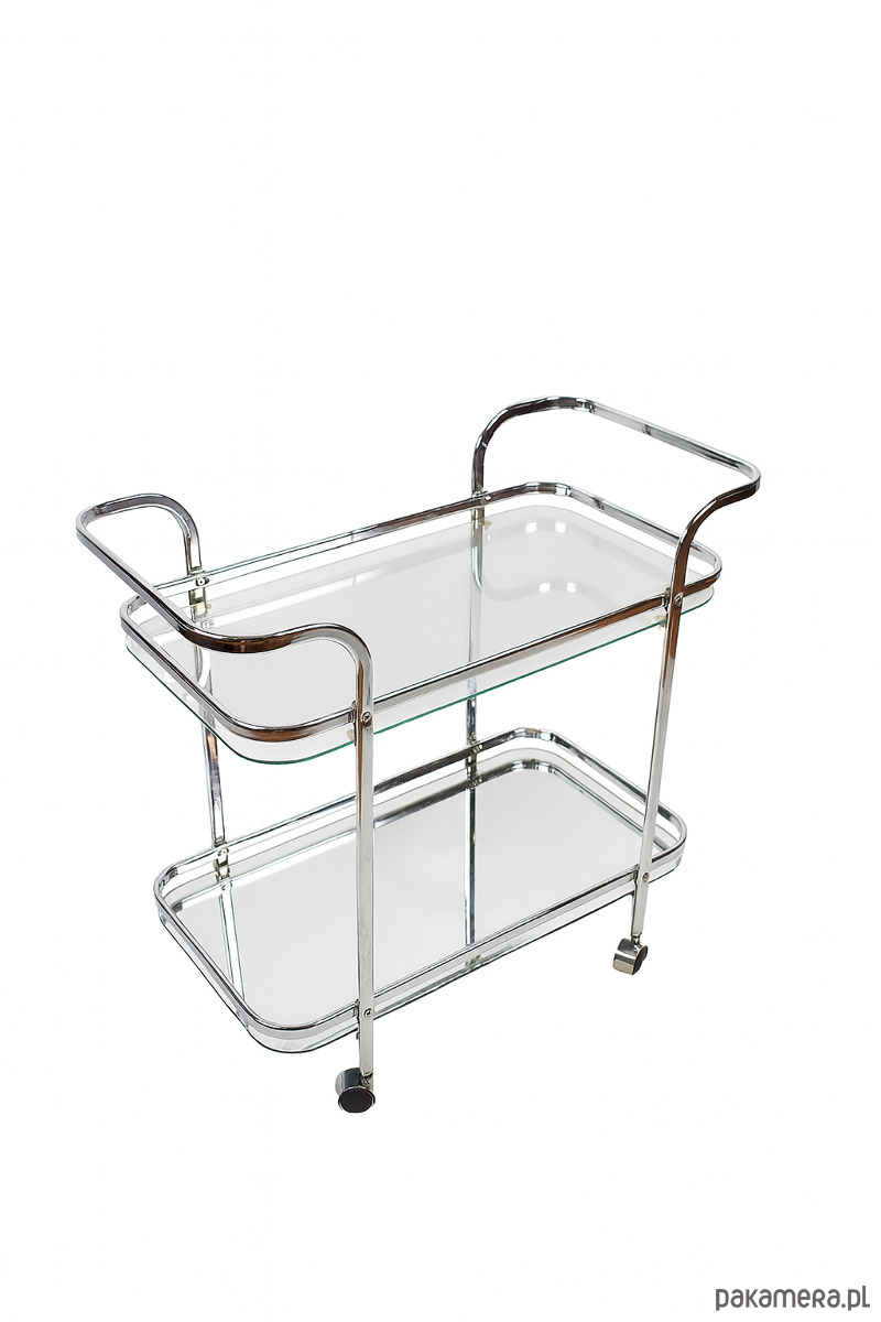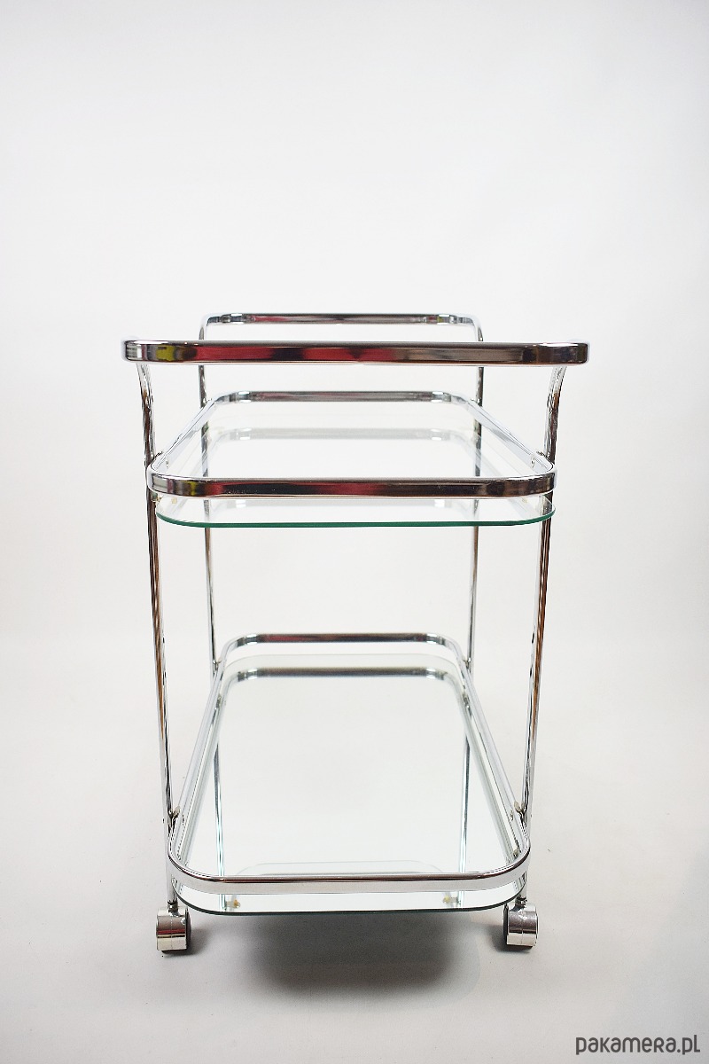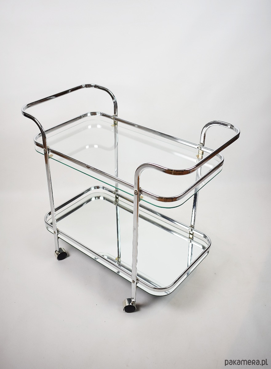 Wózek świetnie sprawdzi się jako mobilny minibar, pomocnik salonowy lub efektowny element dekoracyjny. Chromowany metal nadaje mu luksusowego wykończenia, a lustrzane półki podkreślają klimat retro, jednocześnie dodając wnętrzu blasku.Mebel w stanie dobrym posiada minimalne ślady czasu.