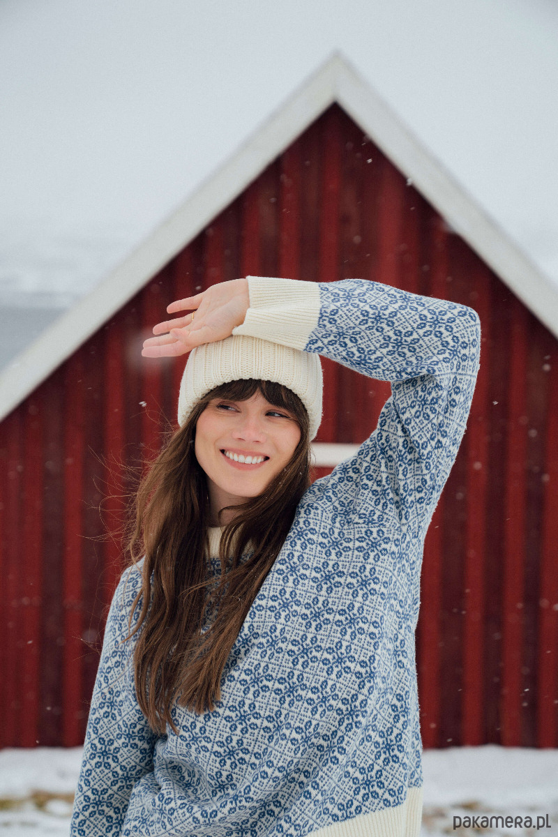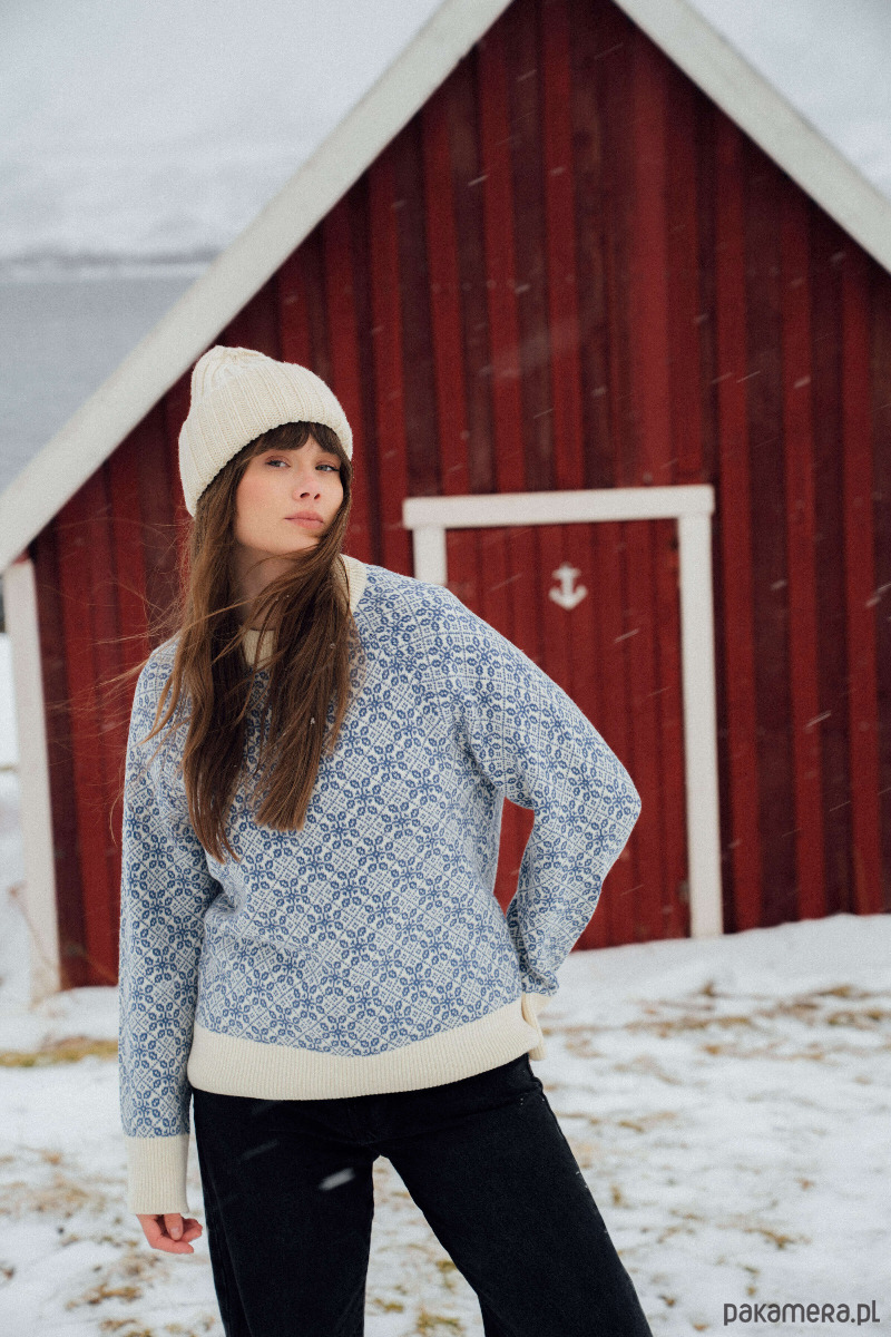 Oversize’owy wełniany sweter w kremowo-chabrowe wzory inspirowane kulturą regionu Beskidów. Ciepły, przytulny, o luźnym fasonie i raglanowych rękawach o lekko dzwonowatym kroju. Bardzo wygodny i ciepły, będzie cieszyć oko swoim oryginalnym wyglądem.