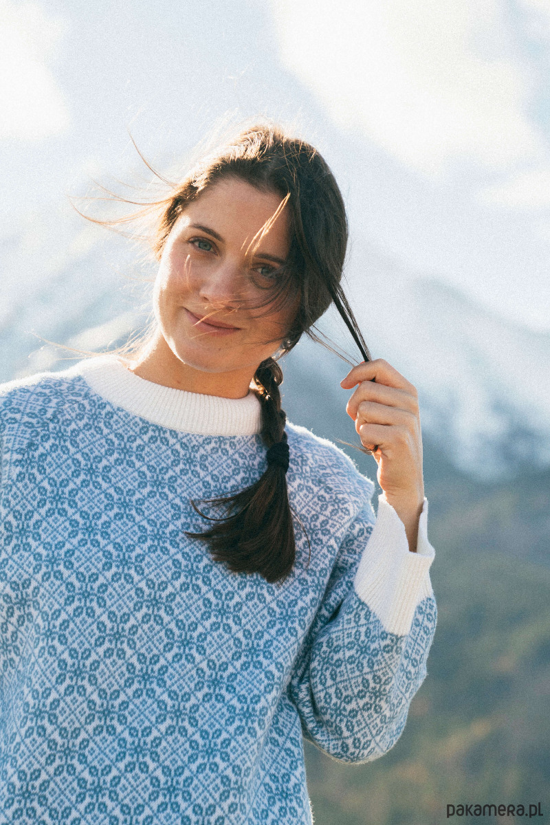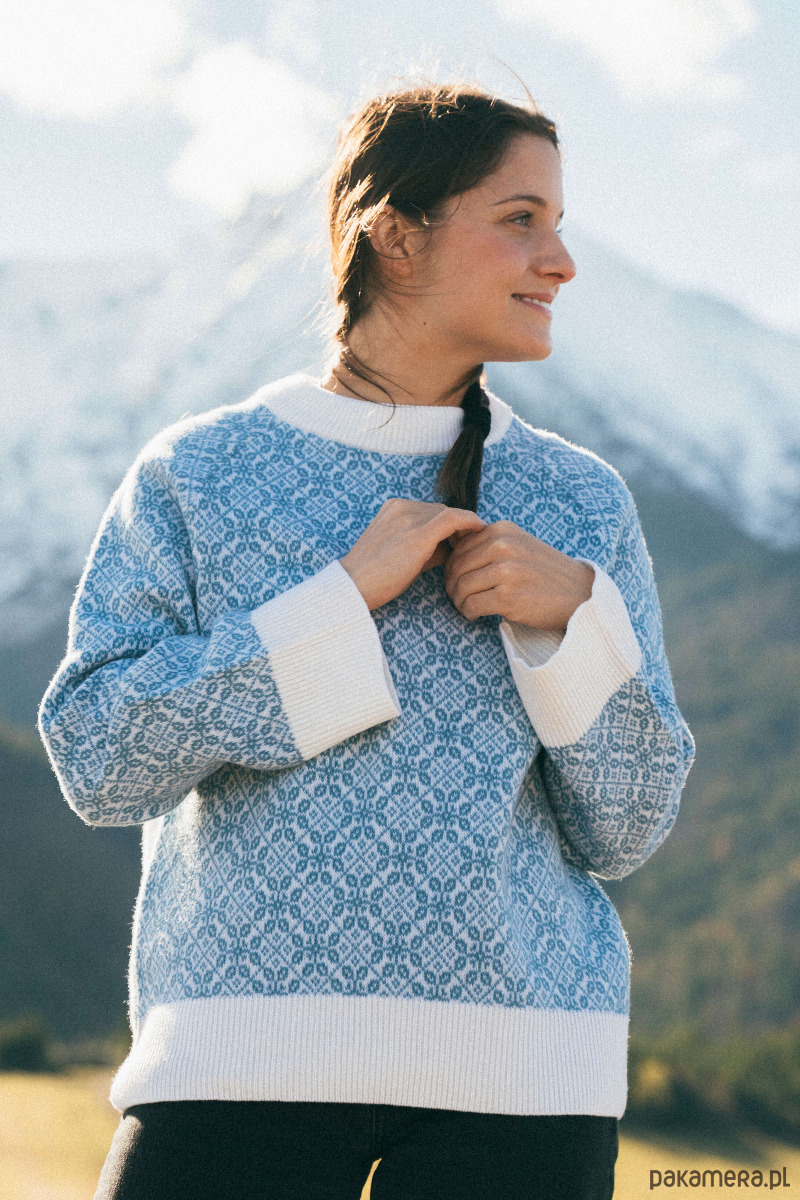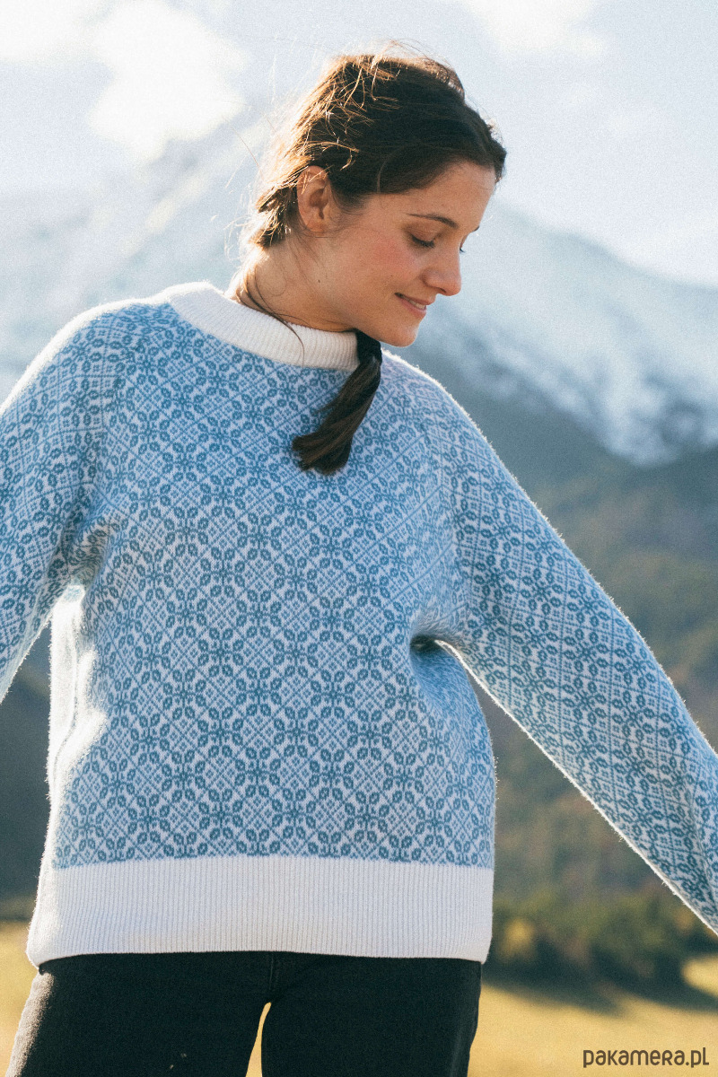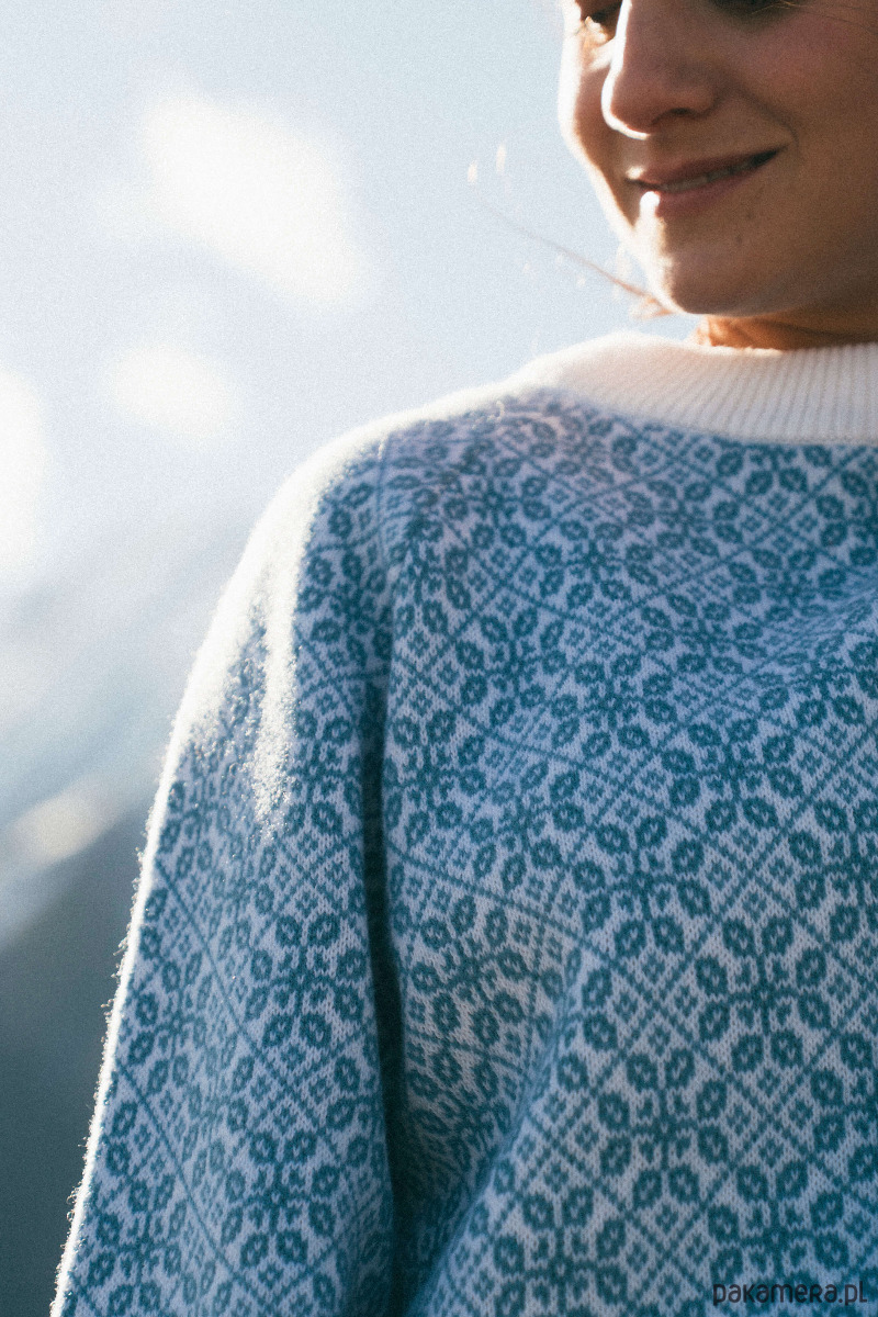 Oversize’owy wełniany sweter w biało-niebieskie (zgaszony niebieski) wzory inspirowane kulturą regionu Beskidów.