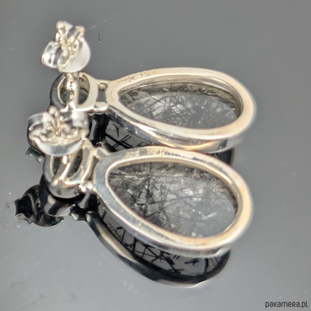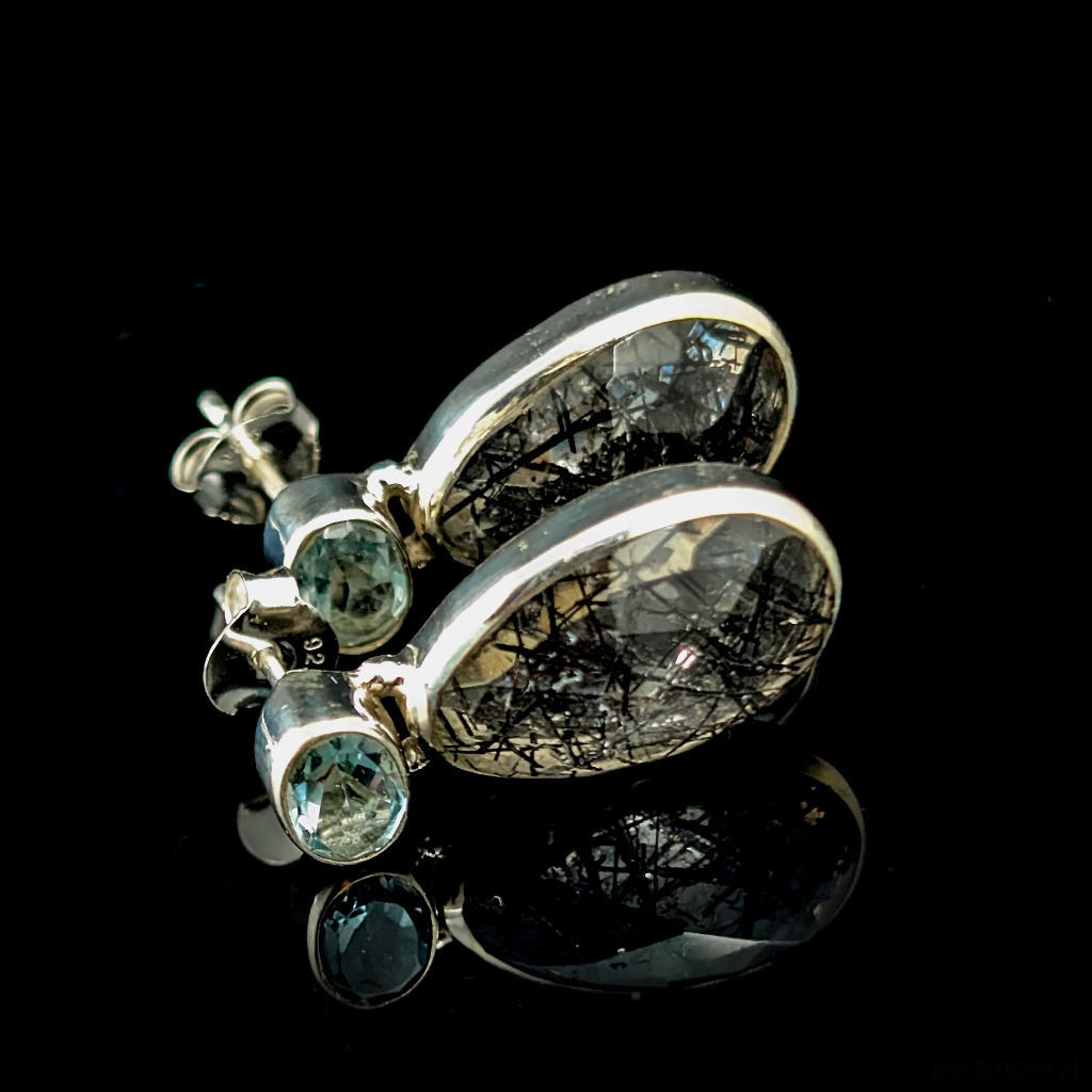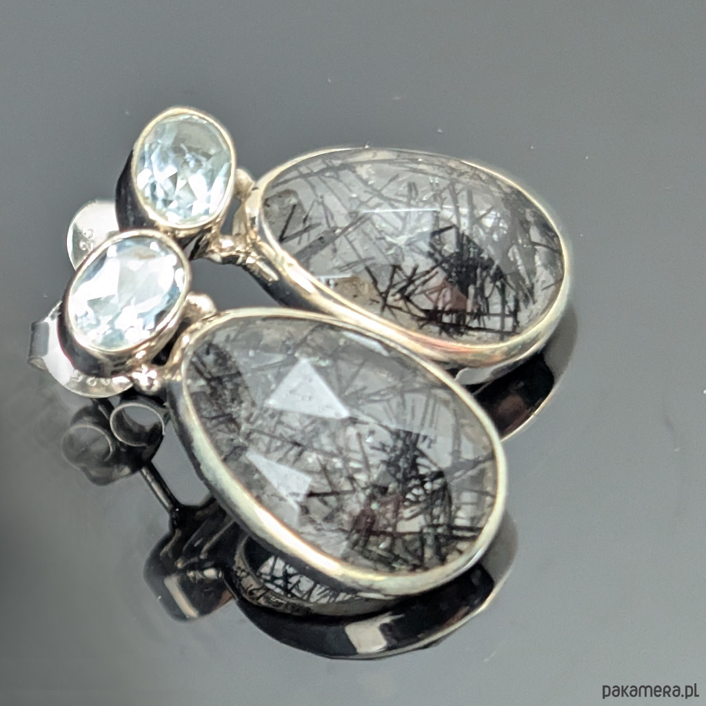 Kolczyki sztyfty z fasetowanym, okazałym kwarcem z inkluzjami czarnego turmalinu oraz delikatnymi błękitnymi topazami - wymiary 8 x 6 mm, oprawa kwarców 18 x 12 mm, całość o długości 25 mm, oprawa srebro 925, wykonane przez dostawcę kamieni. Waga jednego kolczyka3,4 g. Polecam, piękne.
