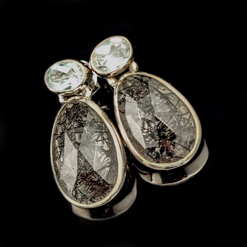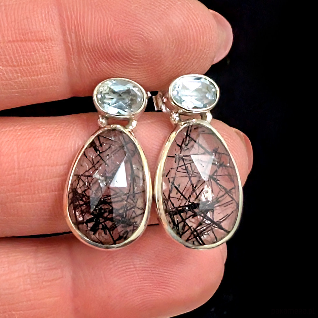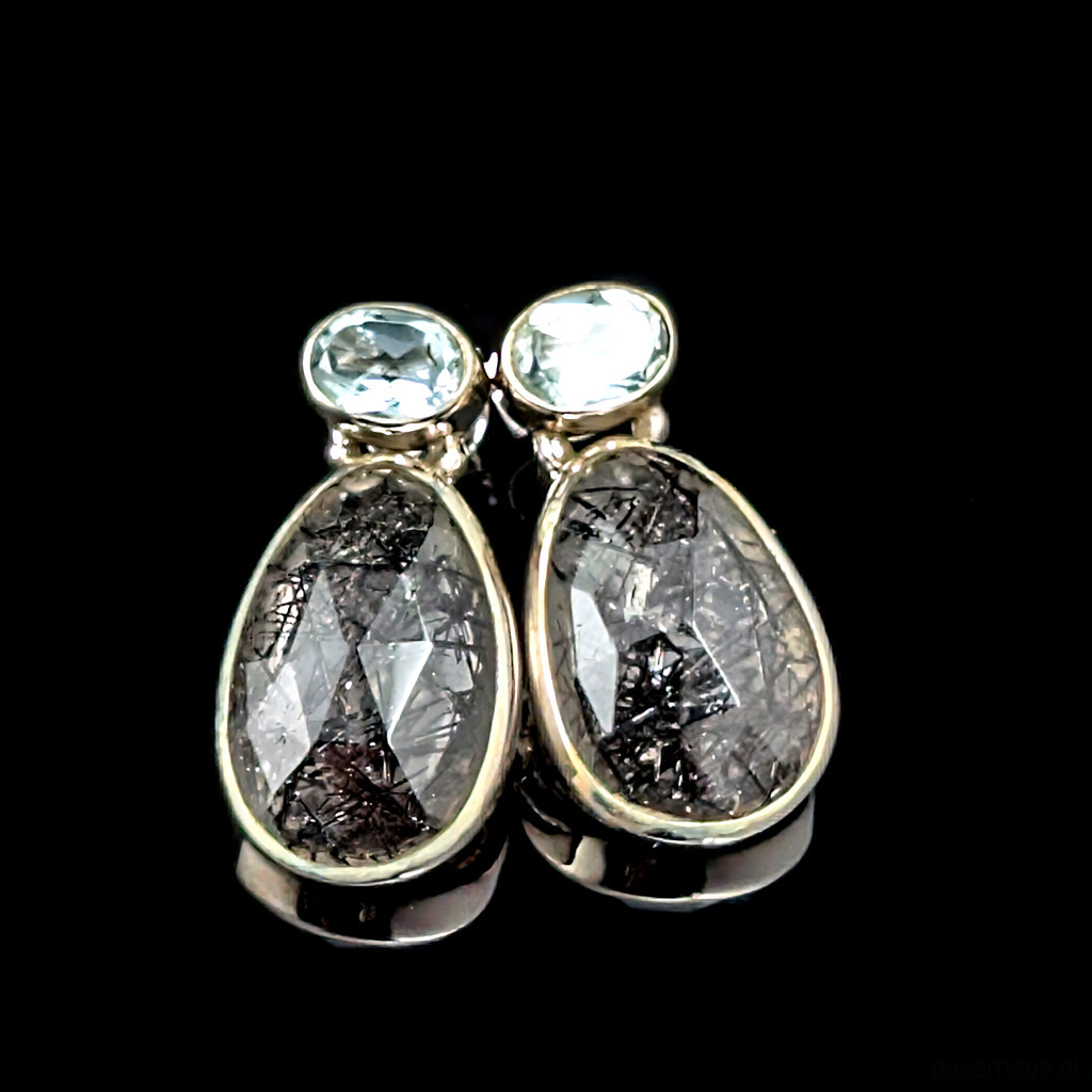 Kolczyki sztyfty z fasetowanym, okazałym kwarcem z inkluzjami czarnego turmalinu oraz delikatnymi błękitnymi topazami - wymiary 8 x 6 mm, oprawa kwarców 18 x 12 mm, całość o długości 25 mm, oprawa srebro 925, wykonane przez dostawcę kamieni. Waga jednego kolczyka3,4 g. Polecam, piękne.