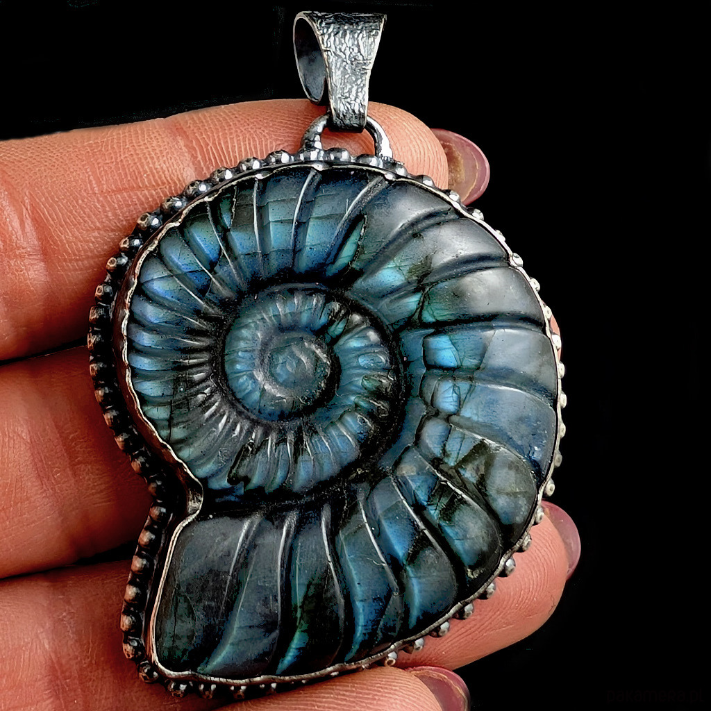 Bardzo okazały, pełen elegancji wisior z oksydowanego srebra próby 925 oraz labradorytu z wyrzeźbionym wzorem amonitu. Długość 65 mm. Wymiary 50 x 40 mm. Waga 36 g.Polecam, piękny kamien