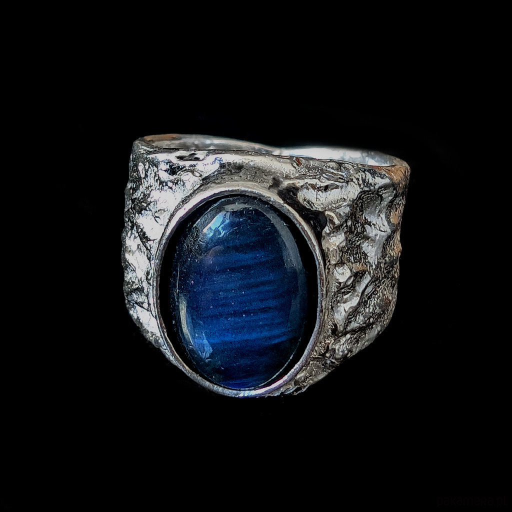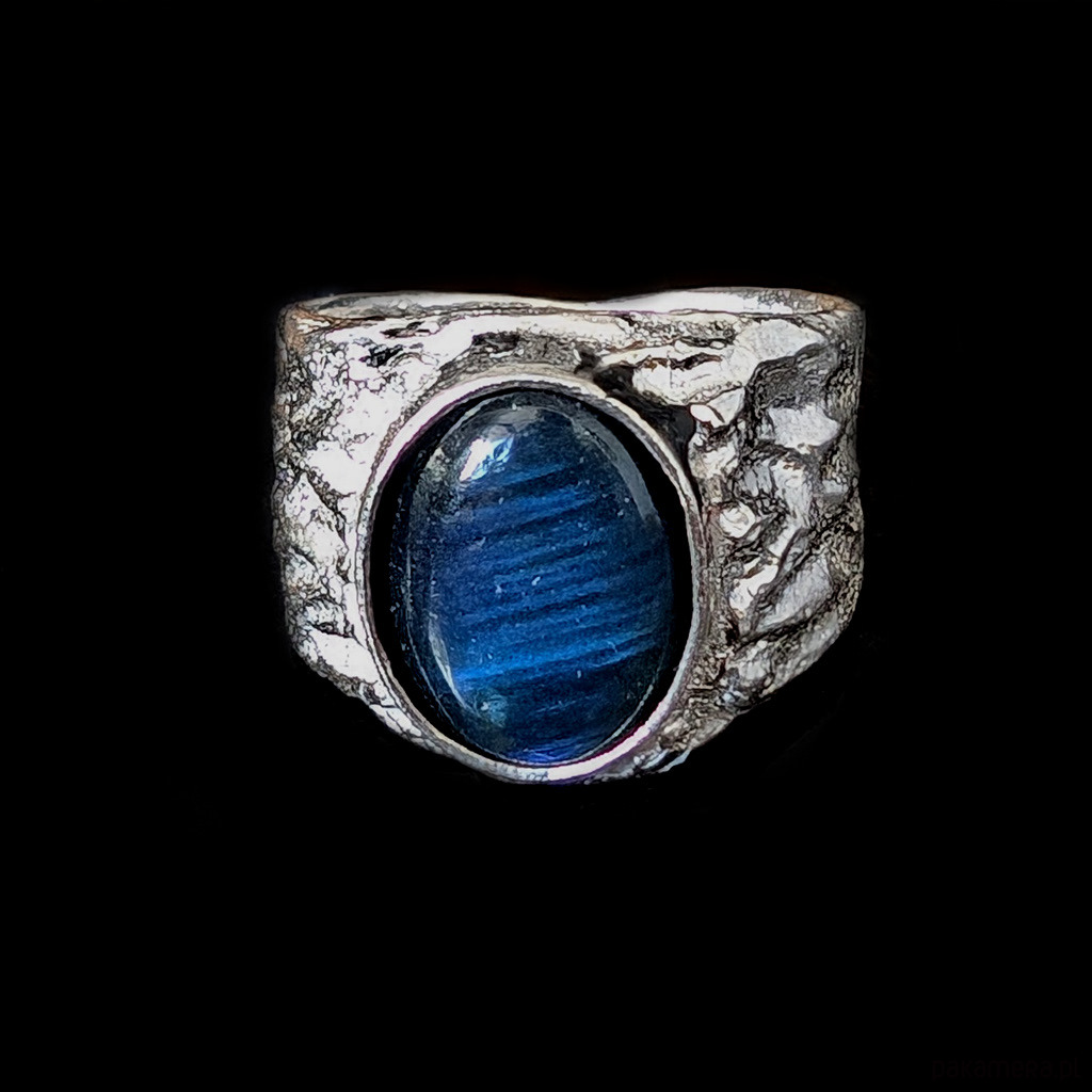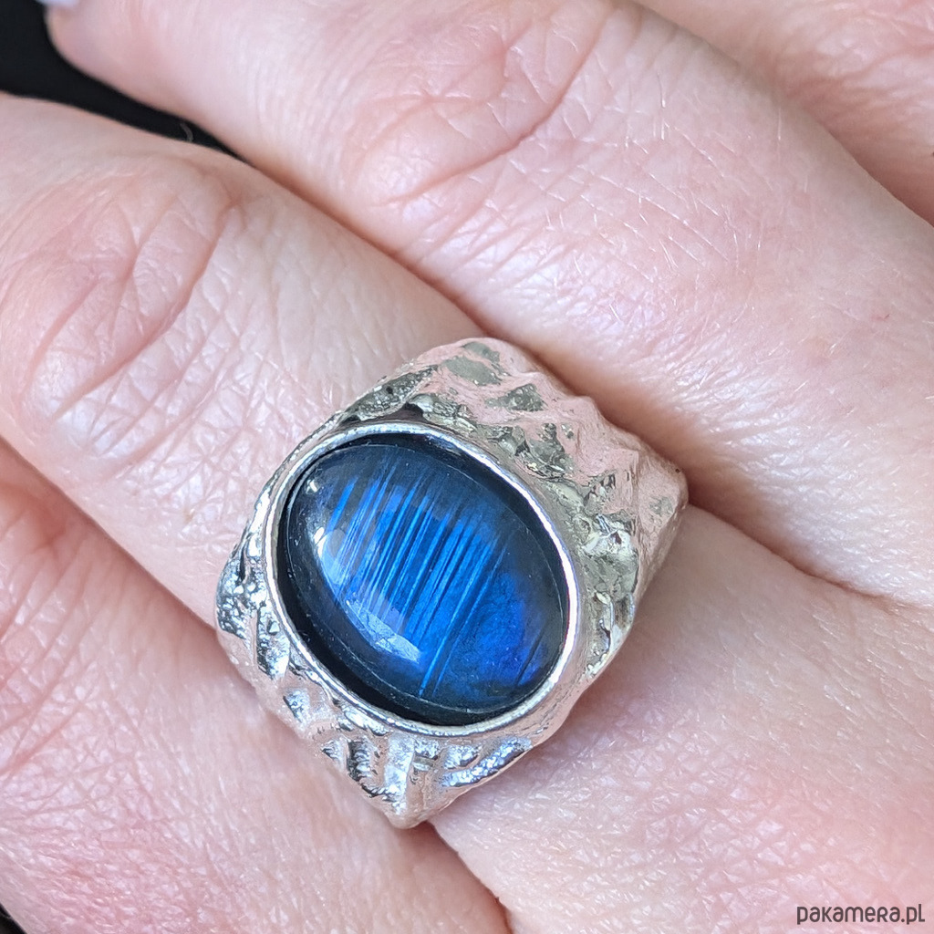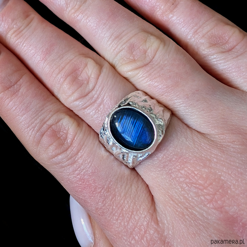 Pierścień z oprawionym w srebrną ramę próby 925 pięknym, naturalnym labradorytem w niebieskim kolorze. Wymiary oprawy kamienia 15 x 12 mm, w najszerszym miejscu obrączka ma 16 mm. Waga 12,8 g. Rozmiar jubilerski 19, mogę powiększyć do rozmiaru max 20. Pierścień zapakowany zostanie w ozdobne pudełeczko.