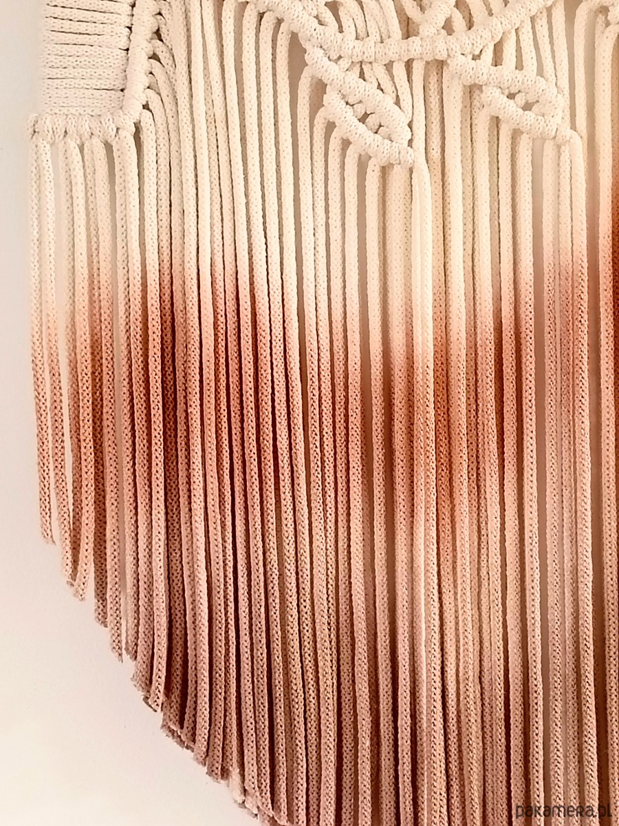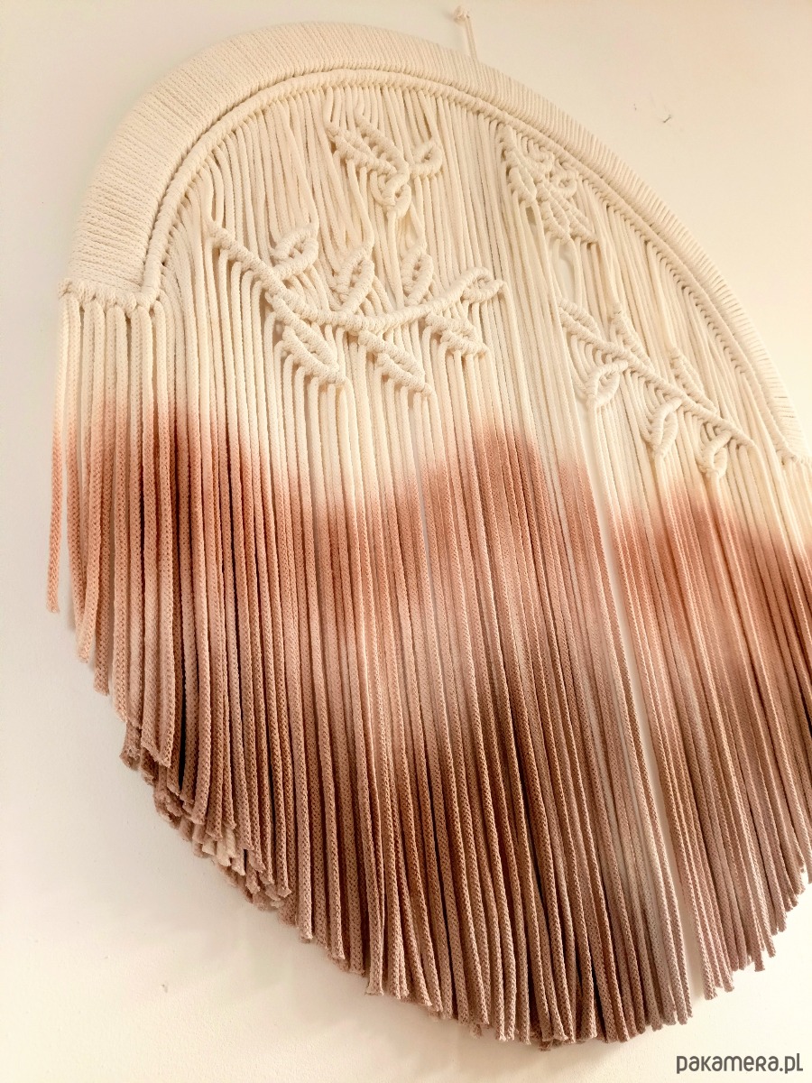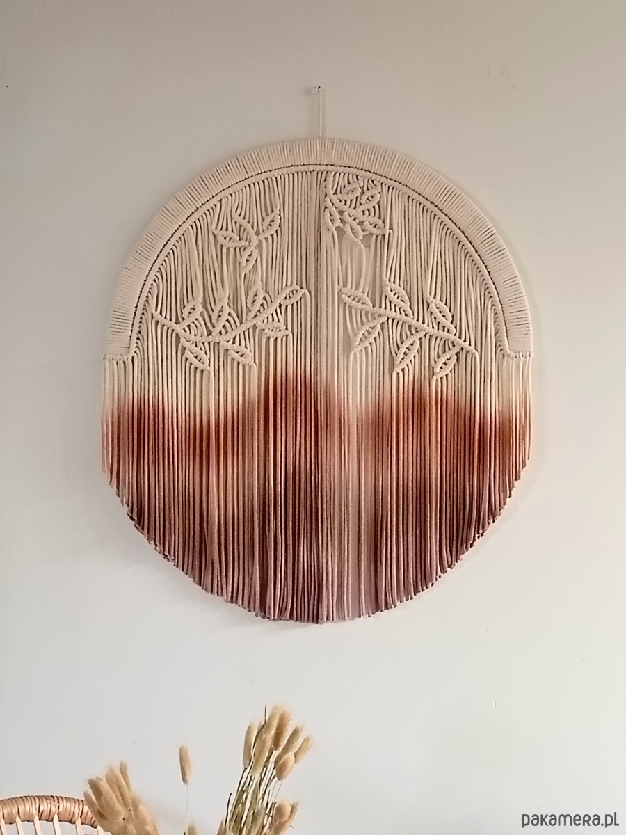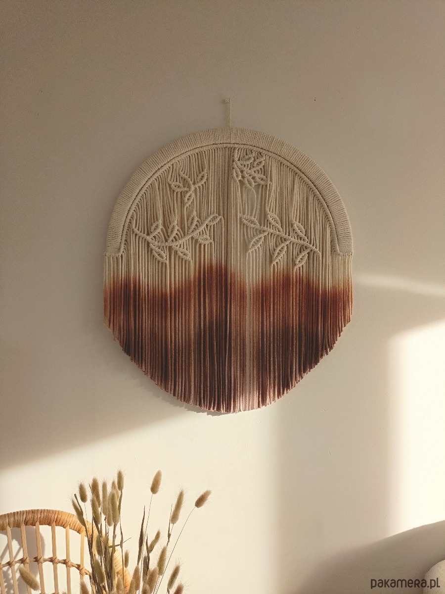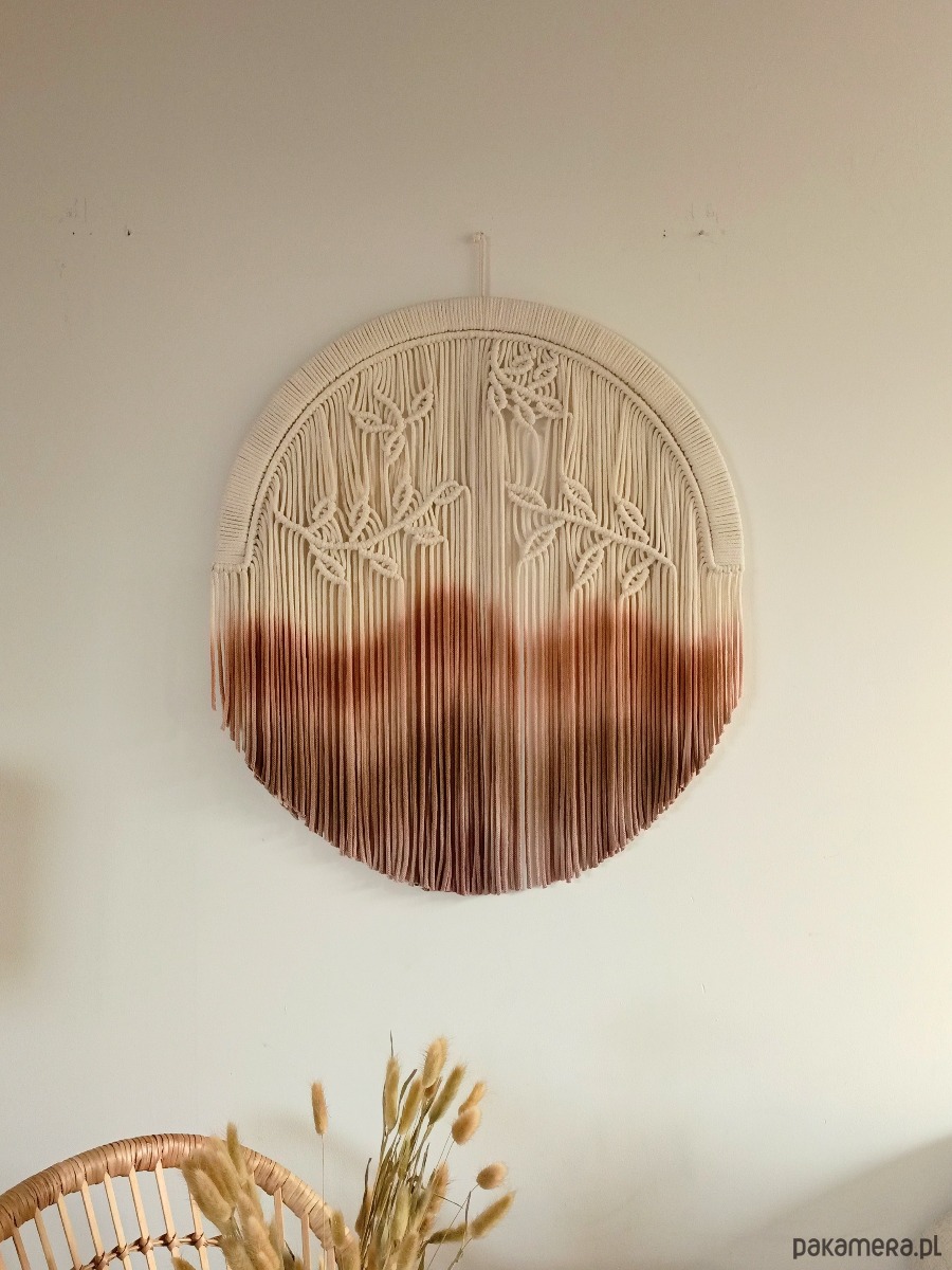 Ta wyjątkowa dekoracja ścienna łączy w sobie naturalne materiały oraz ręczne barwienie, które nadaje jej niepowtarzalny charakter. Delikatne sploty przedstawiające liście harmonijnie przeplatają się z gradientem kolorów, od jasnego beżu po głębokie odcienie brązu. Idealna do każdego wnętrza, dodaje ciepła i przytulności, wprowadzając do przestrzeni elementy natury. Ręcznie wykonana, stanowi doskonały przykład rzemiosła artystycznego, które łączy tradycję z nowoczesnym designem.