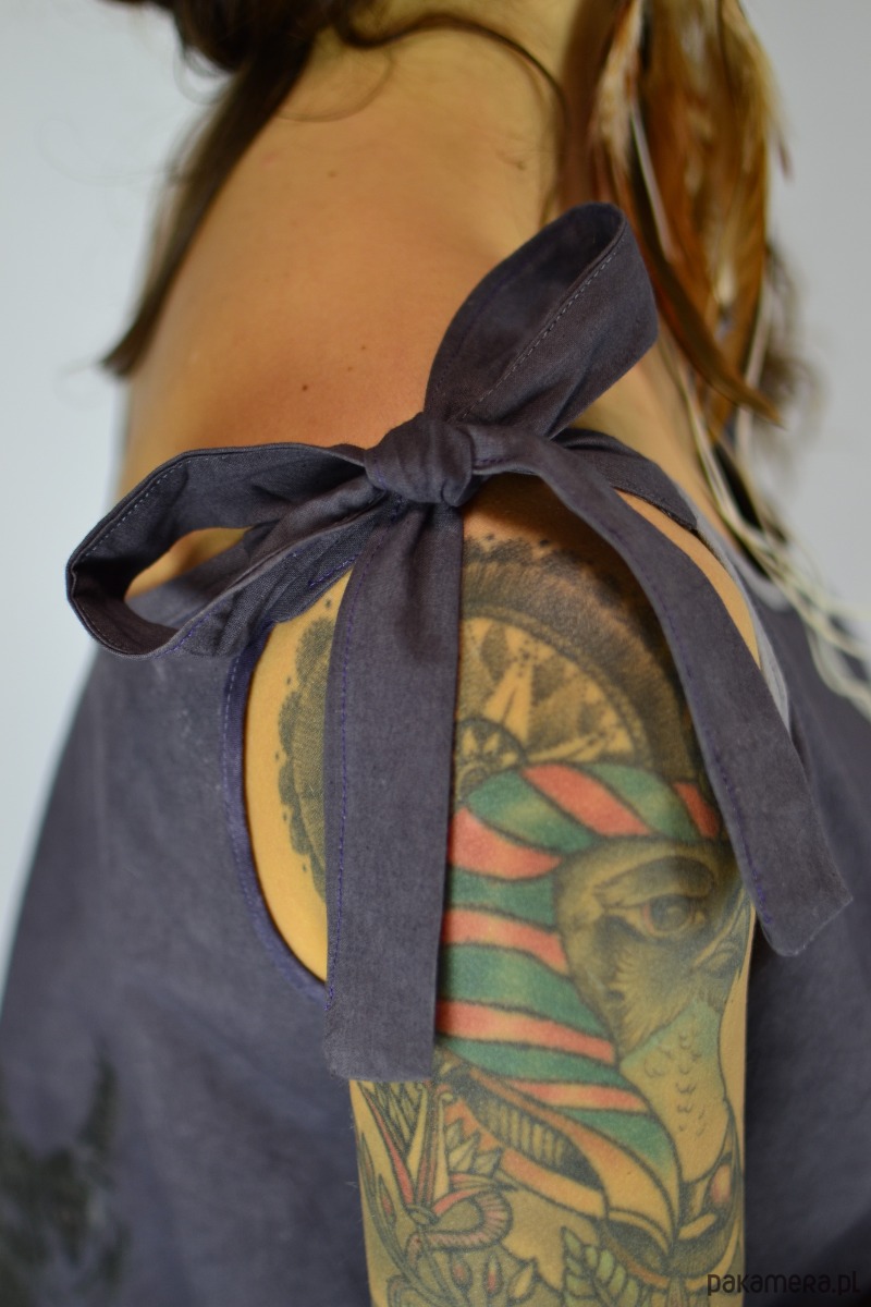 Uszyliśmy ją z miękkiej bawełny 100%, która jest tkaniną bardzo delikatną i przyjemną w dotyku. Bluzka jest wiązana na ramionach – pozwala dopasować długość do sylwetki i nastroju.