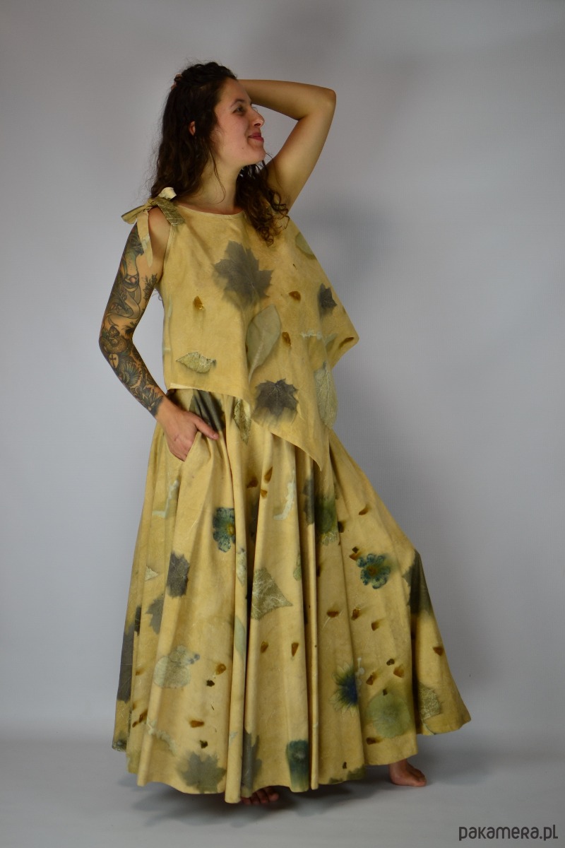 Barwiona w pełni naturalnie – każda roślina, którą położono na tkaninie, zostawiła swój prawdziwy ślad. Technika ecoprint (druk kontaktowy) pozwala zachować autentyczny kształt i esencję liści, tworząc niepowtarzalny wzór, który nie jest nadrukiem, a odbiciem natury.
