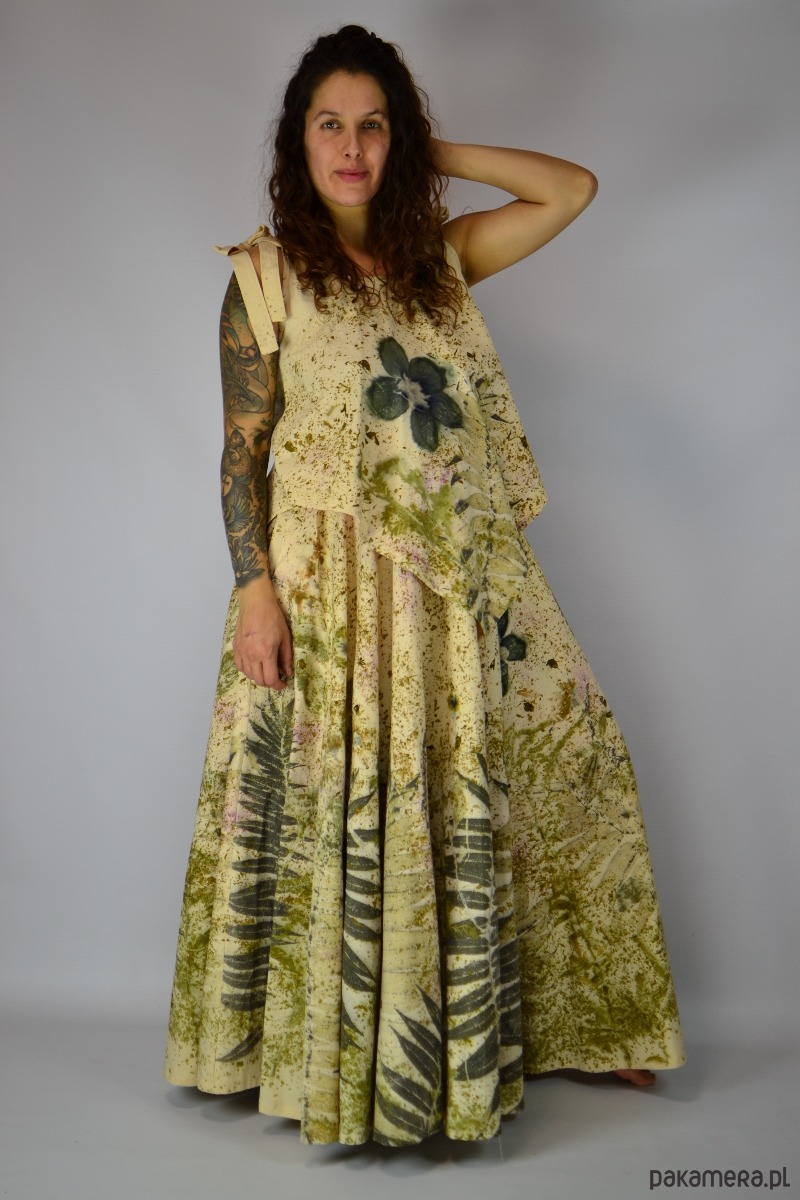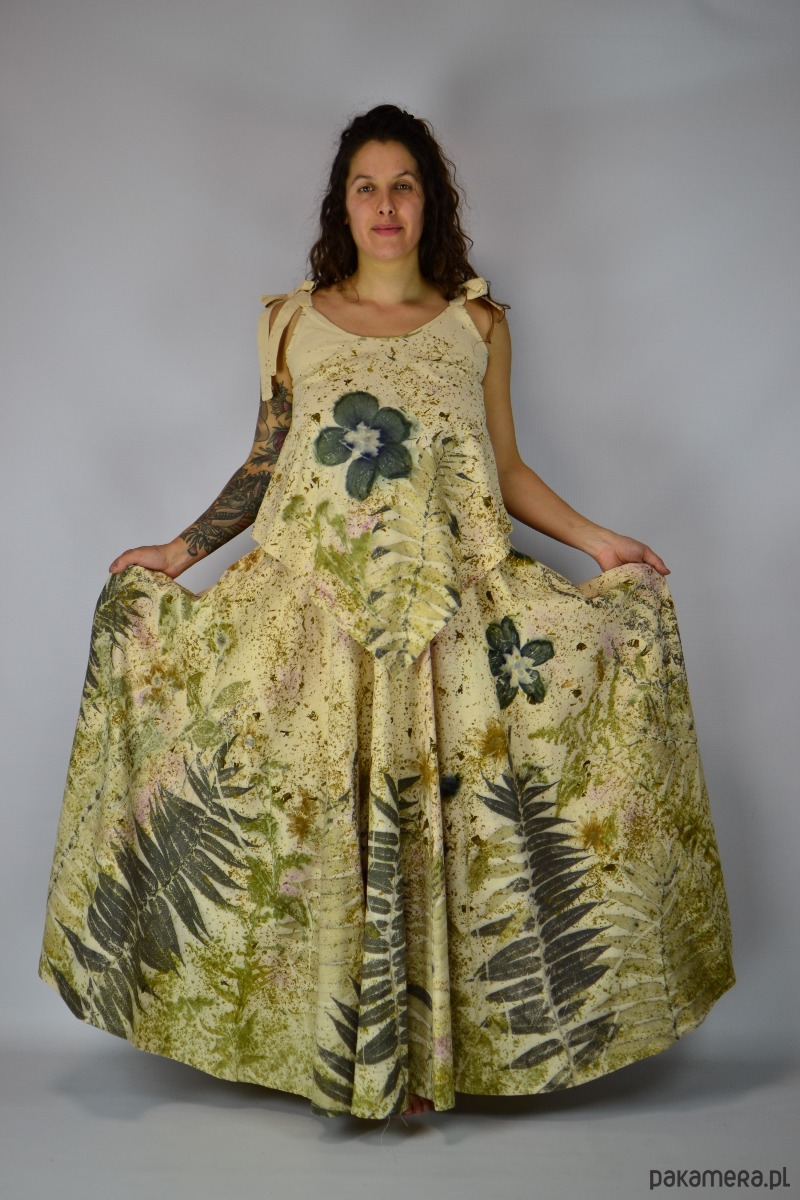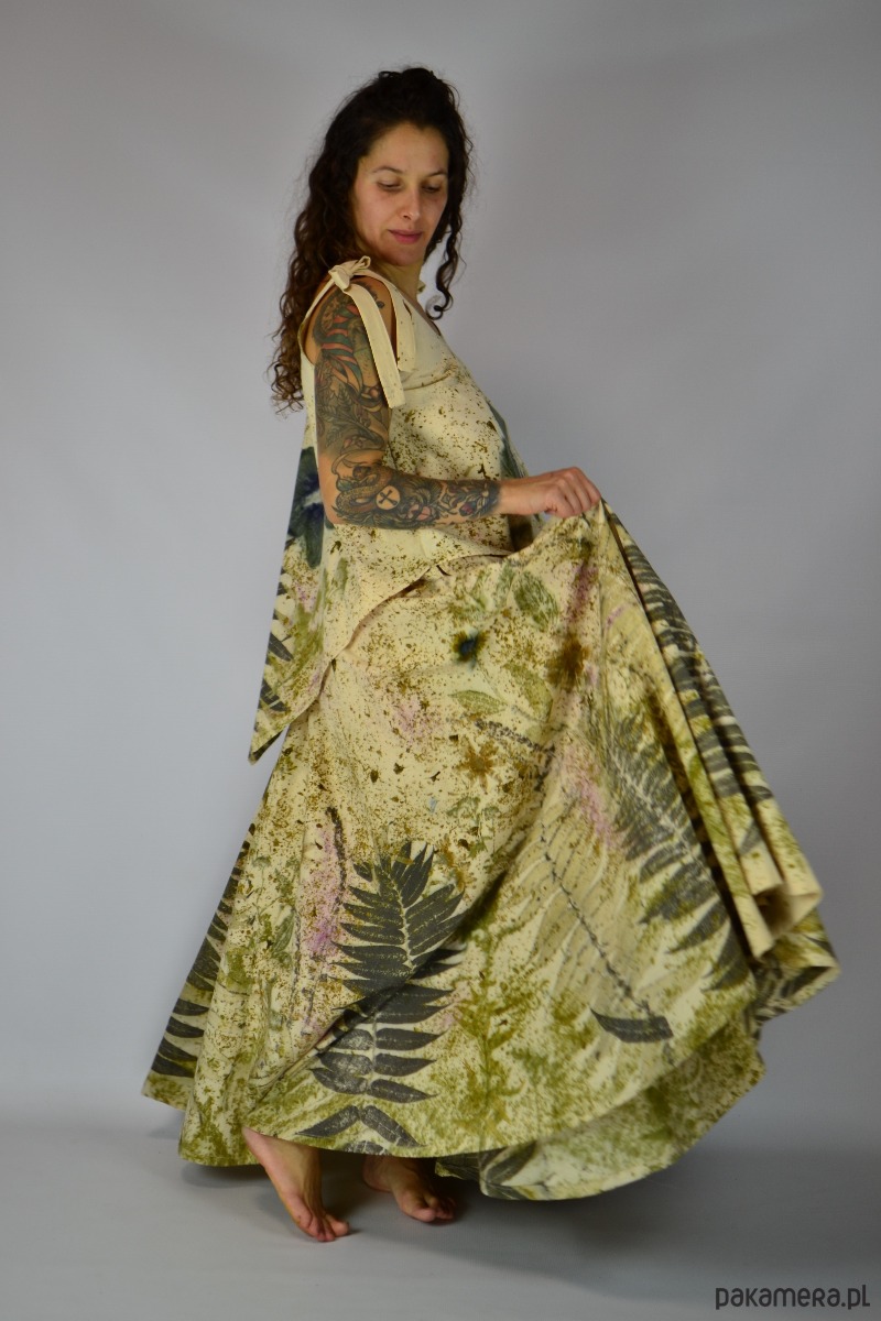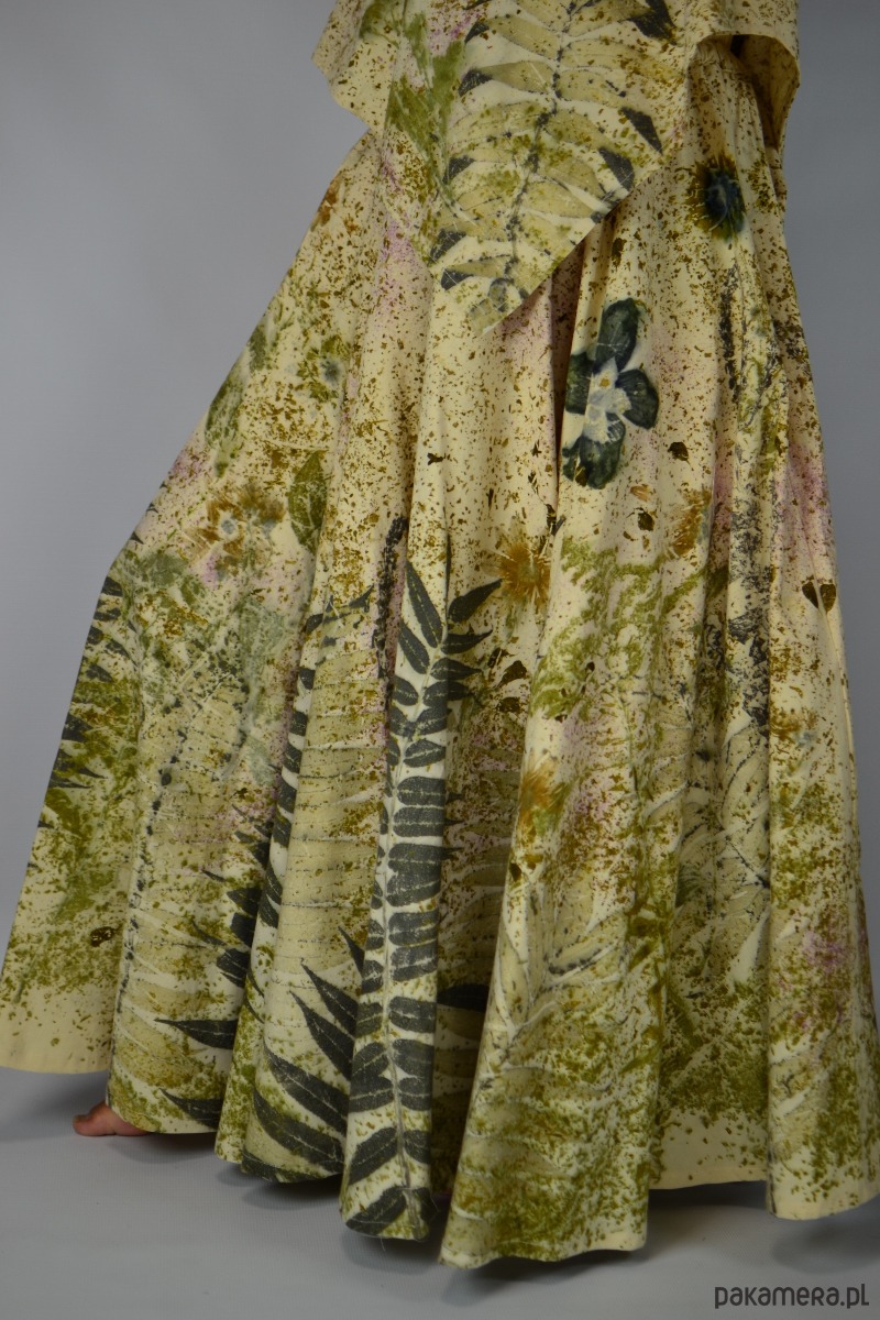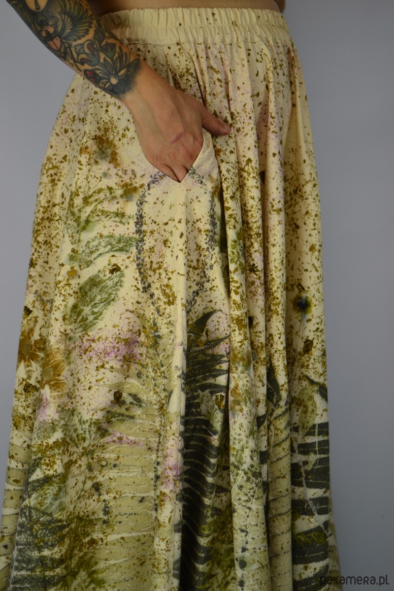 Spódnica powstała w procesie naturalnego barwienia roślinami techniką ecoprintu – druku kontaktowego. Do jej stworzenia użyłam liści sumaka, ziela nawłoci, wrotyczu, krwawnicy i płatków aksamitki, które oddały swoje kształty i esencję tkaninie.