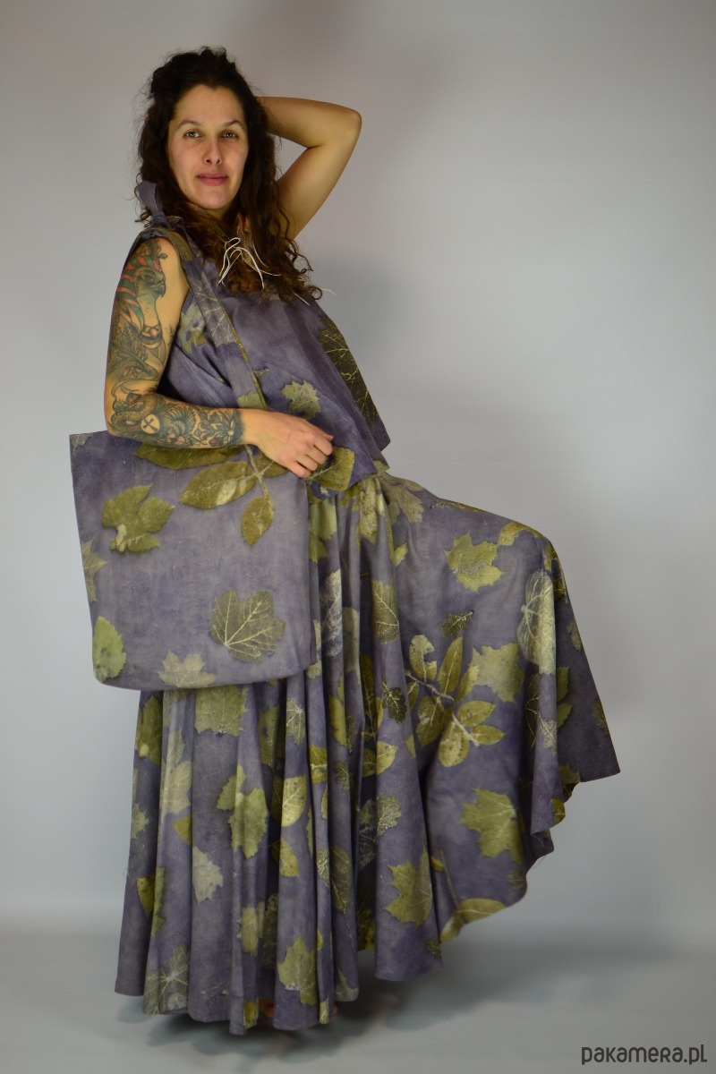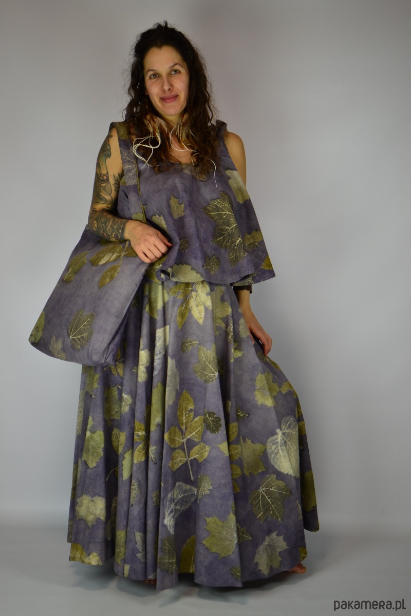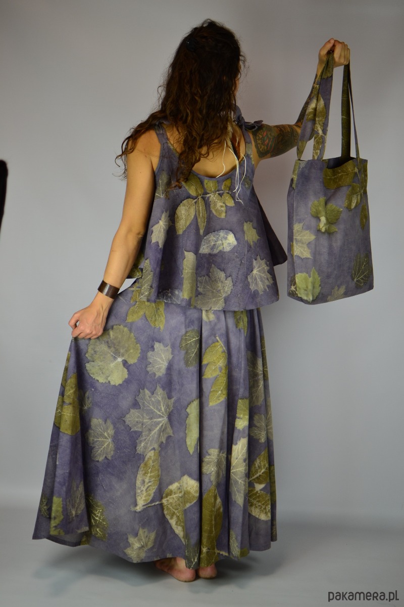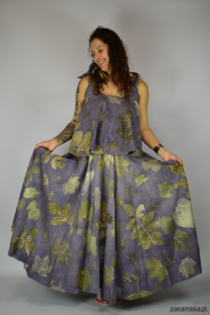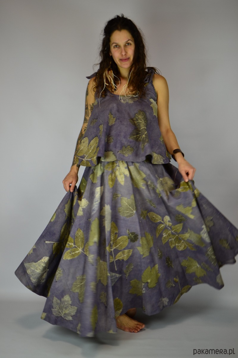 Spódnicę stworzyłam w procesie naturalnego barwienia roślinami techniką ecoprintu – druku kontaktowego. Do jej stworzenia użyłam liści orzecha, winorośli i klonu, które oddały swoje kształty i esencję tkaninie. Wyjątkowe tło barwione wywarem z owoców sumaka.