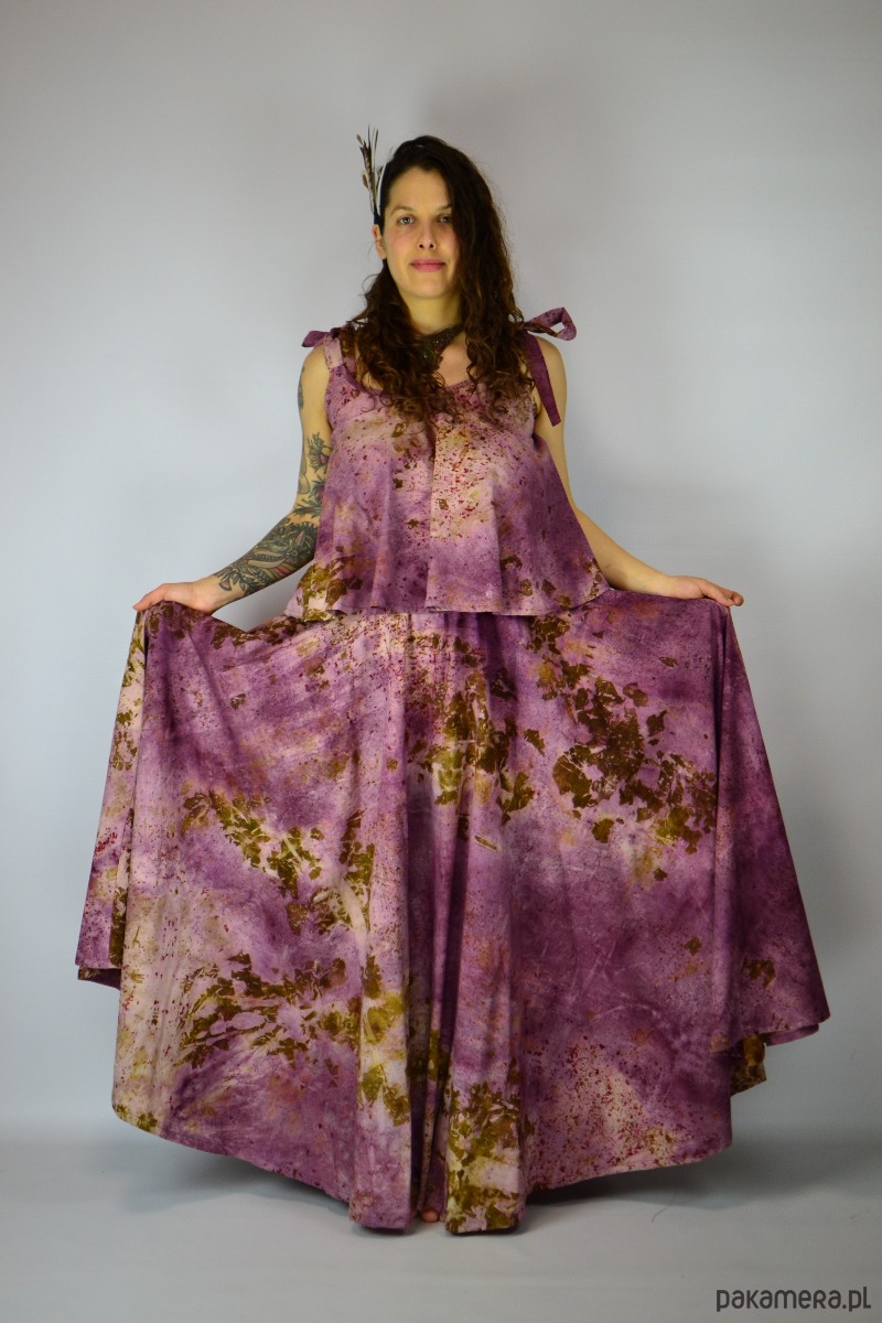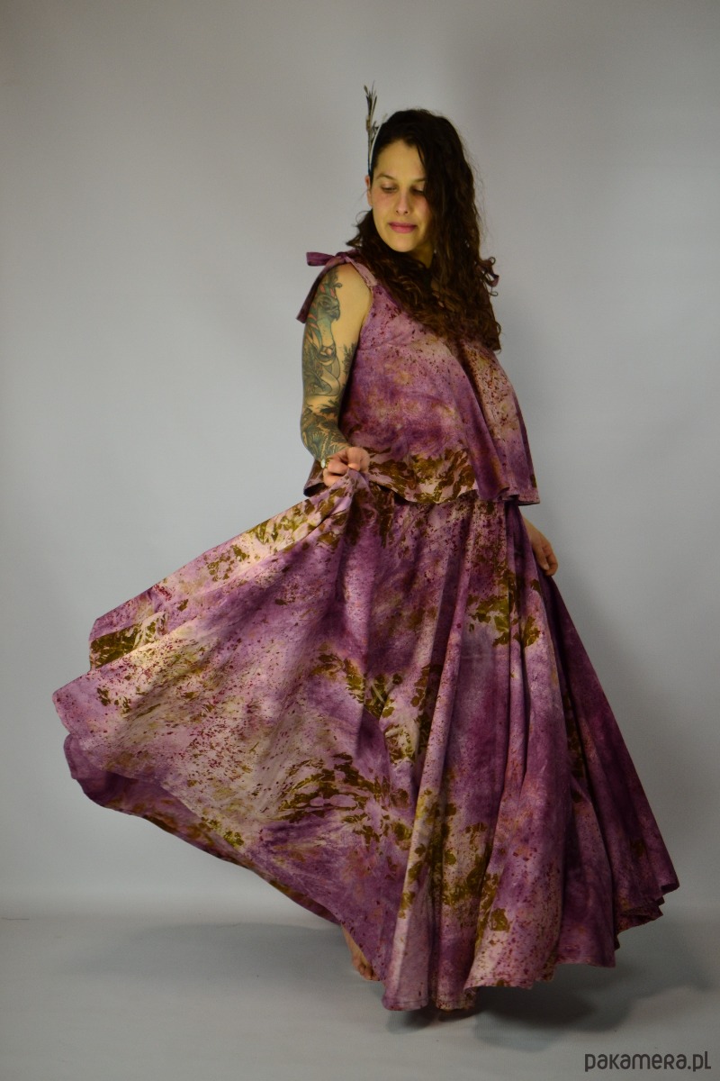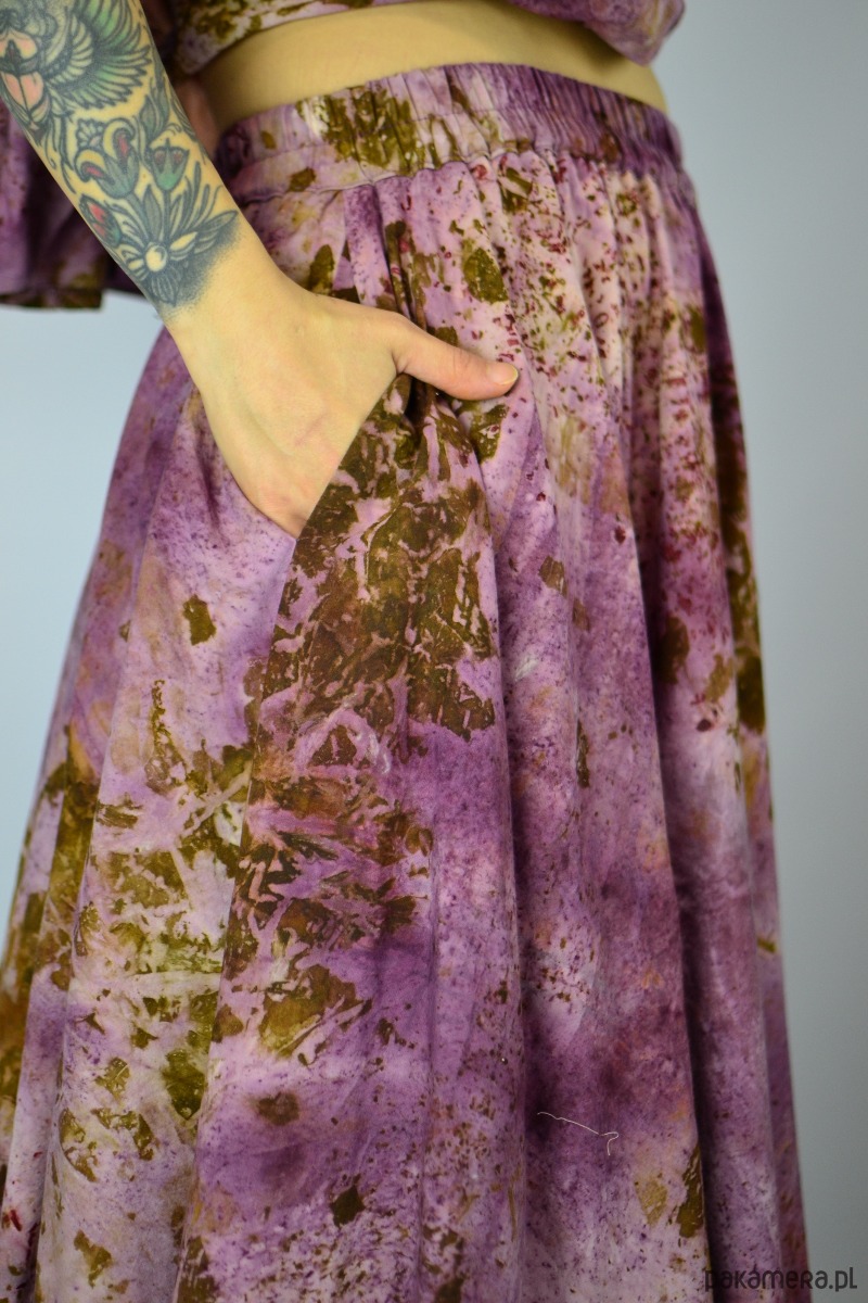 Spódnicę stworzyłam w procesie naturalnego barwienia roślinami techniką ecoprintu – druku kontaktowego. Do jej stworzenia użyłam kłącza marzanny, łupki cebuli i brezylki, które oddały swoje kształty i esencję tkaninie.