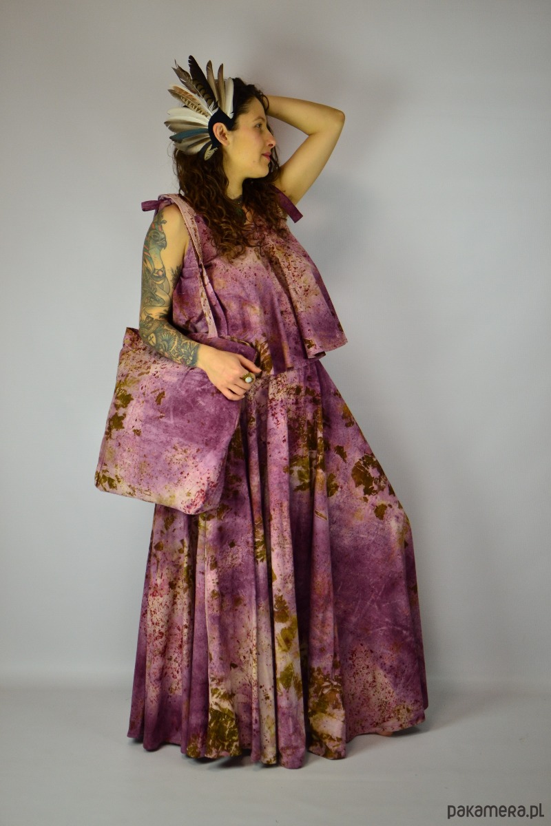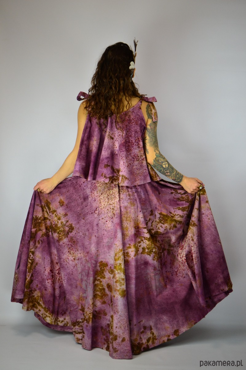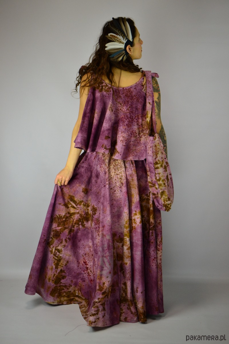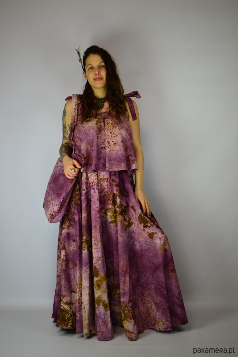 Spódnicę stworzyłam w procesie naturalnego barwienia roślinami techniką ecoprintu – druku kontaktowego. Do jej stworzenia użyłam kłącza marzanny, łupki cebuli i brezylki, które oddały swoje kształty i esencję tkaninie.