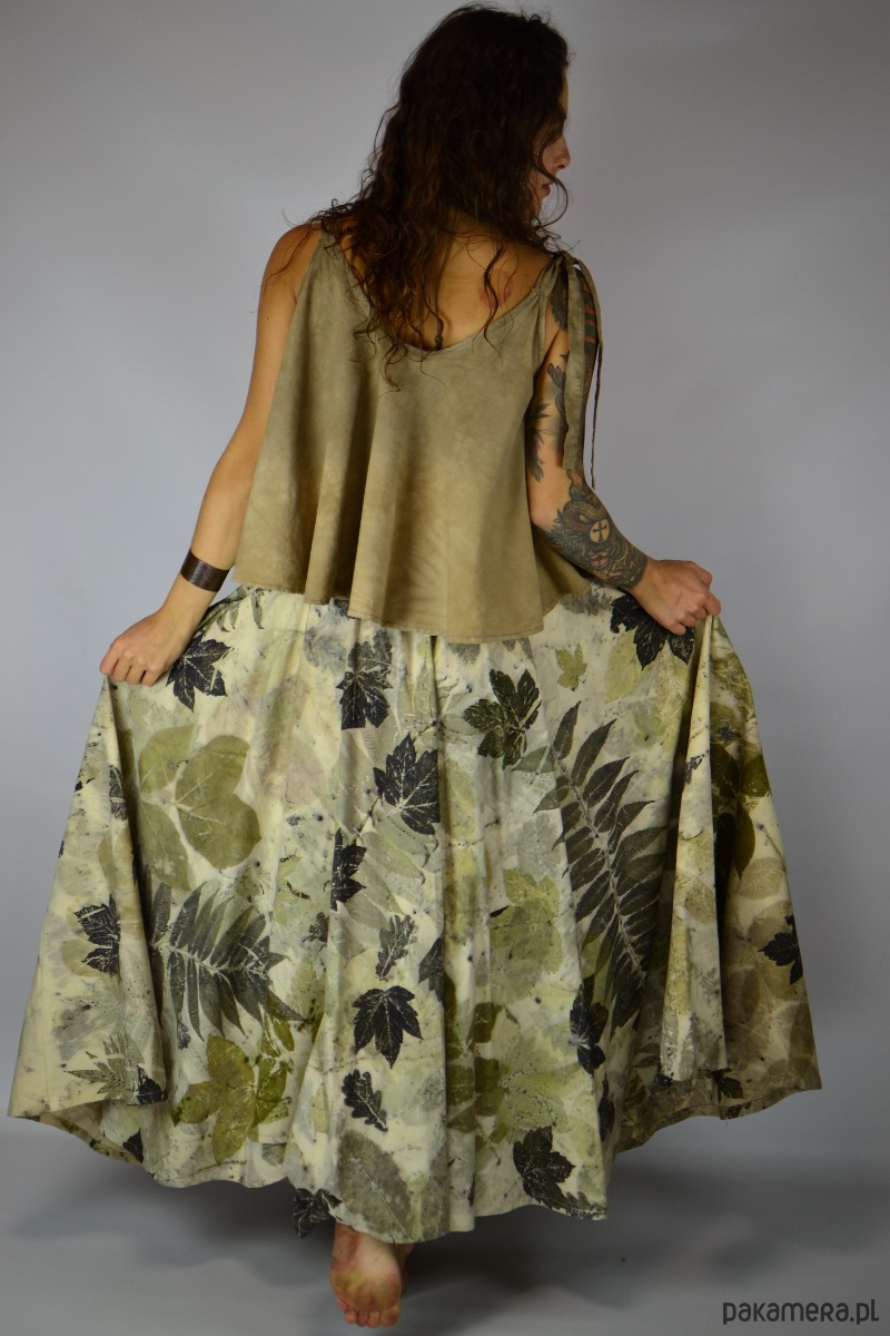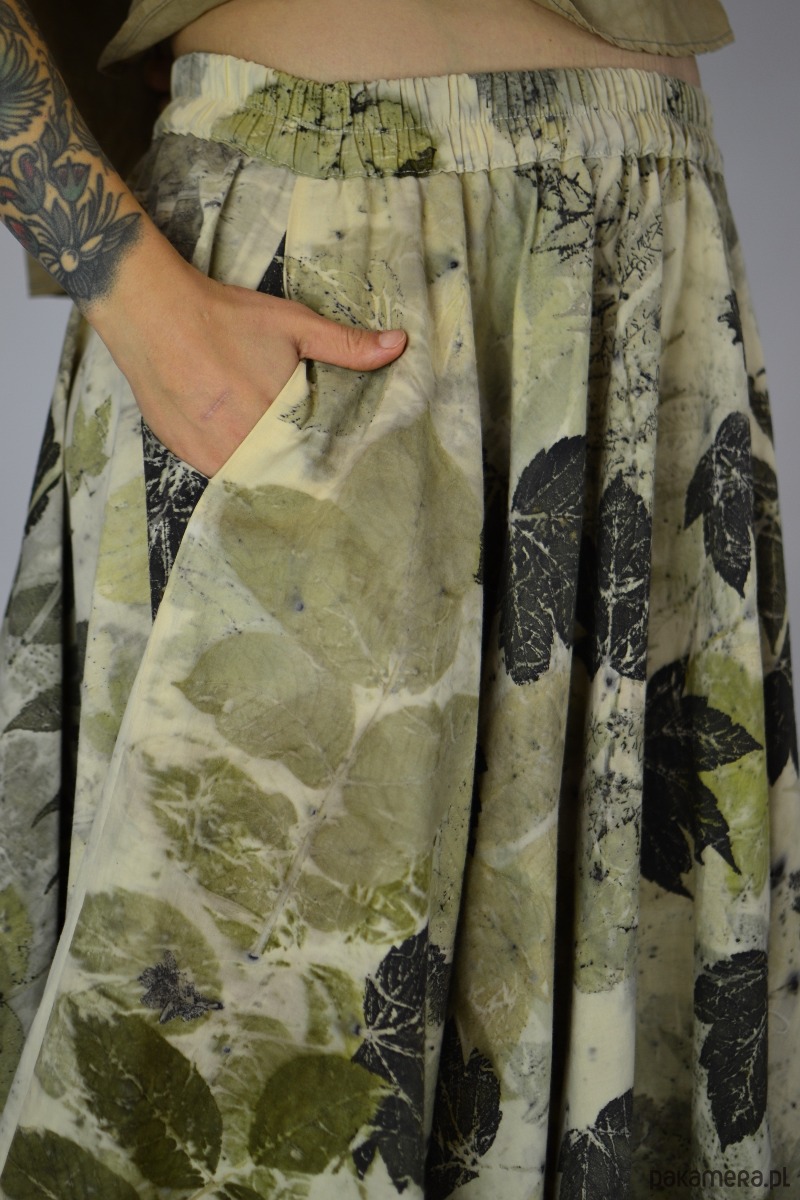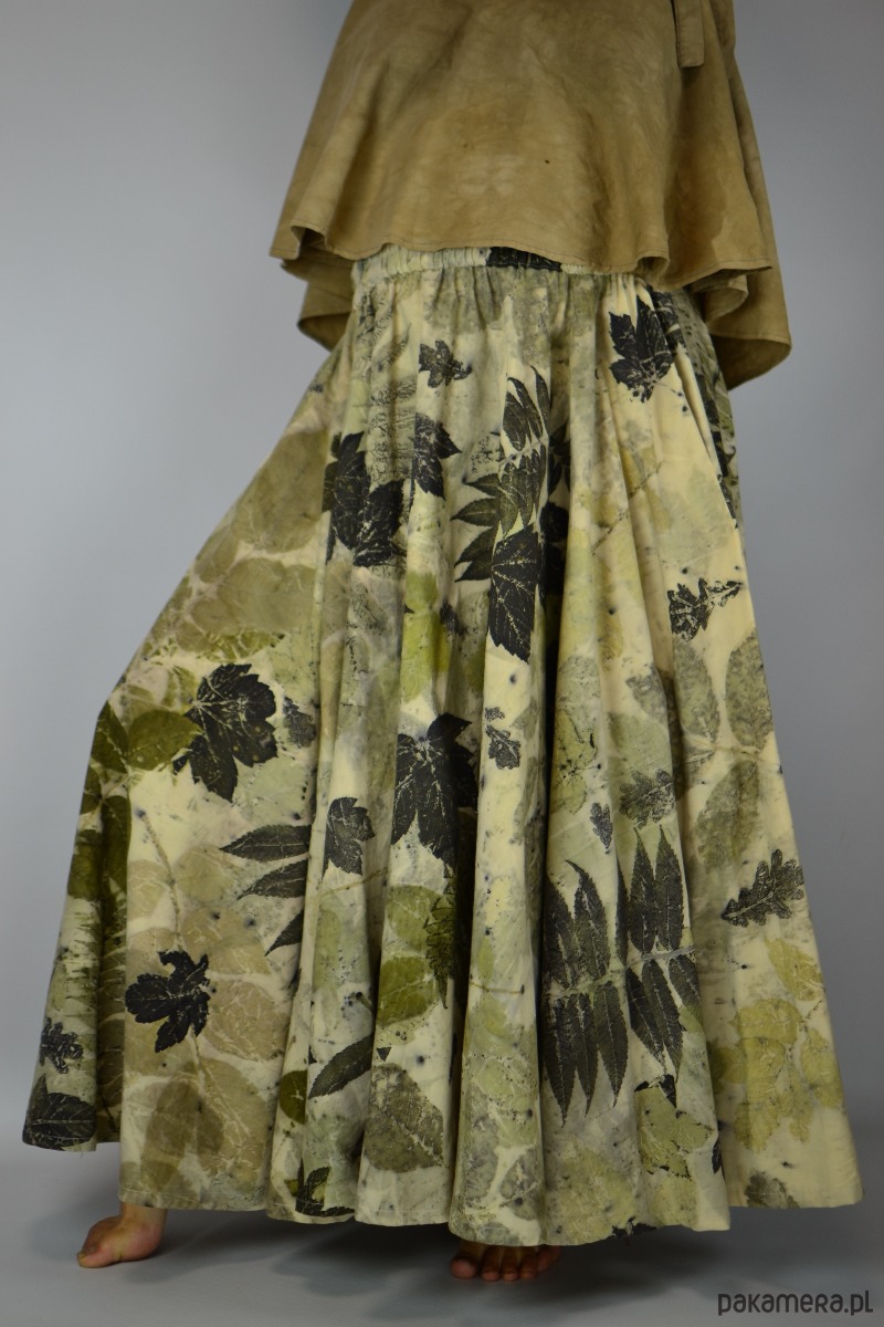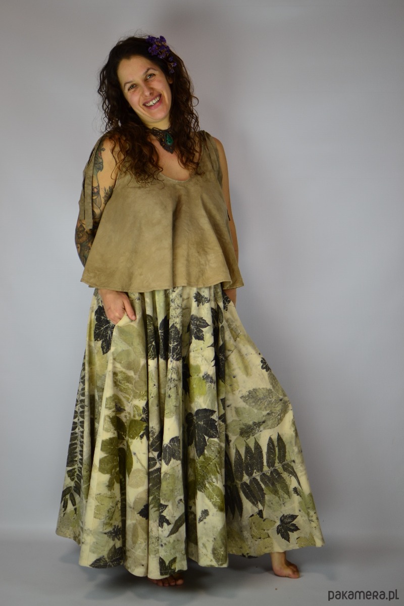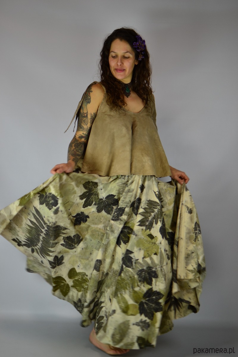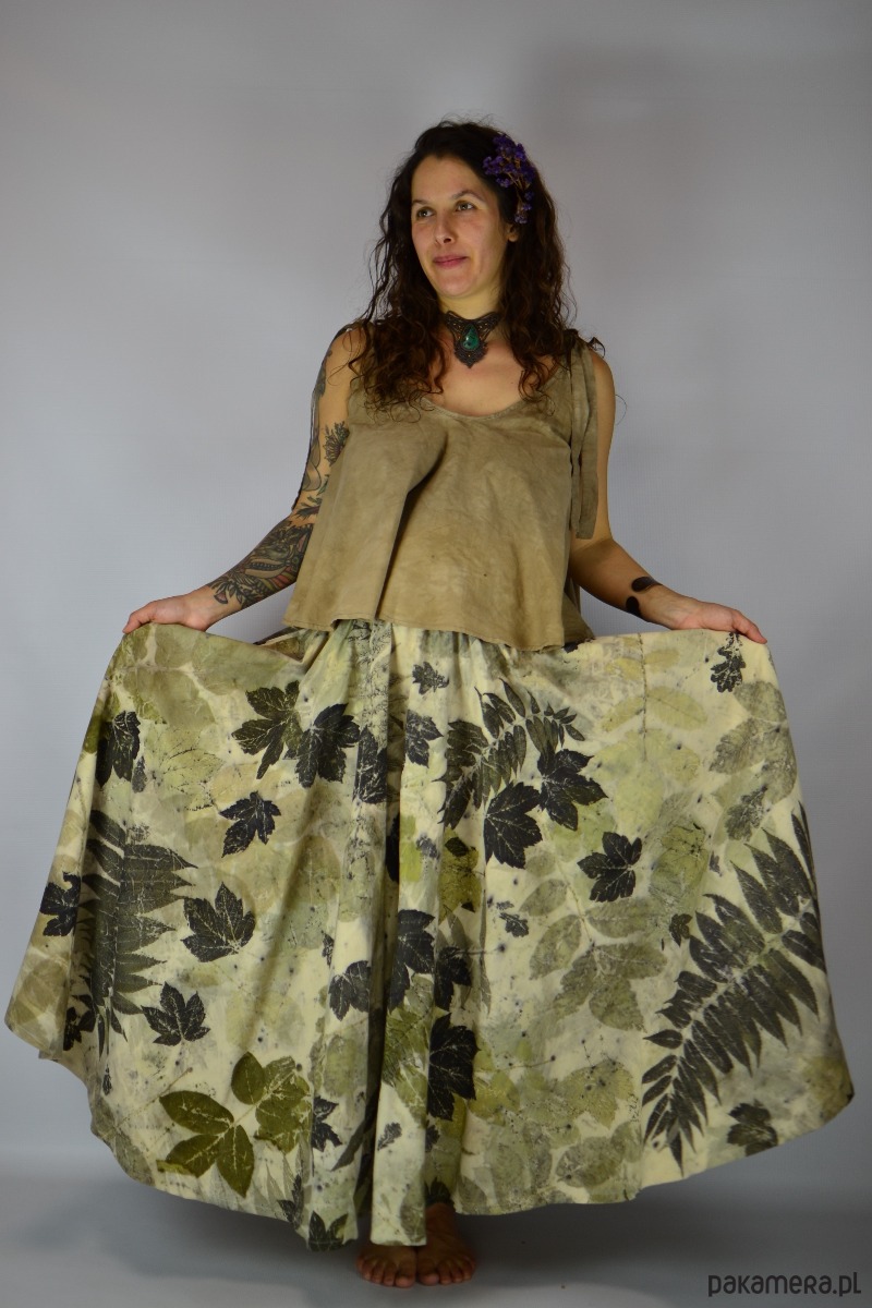 Spódnicę stworzyłam w procesie naturalnego barwienia roślinami techniką ecoprintu – druku kontaktowego. Do jej stworzenia użyłam liści orzecha, sumaka i klonu, które oddały swoje kształty i esencję tkaninie.