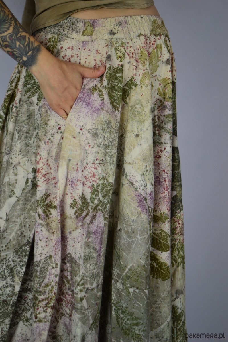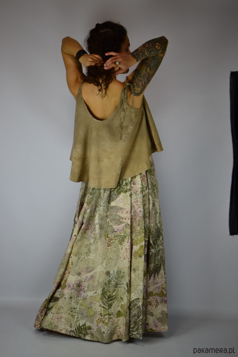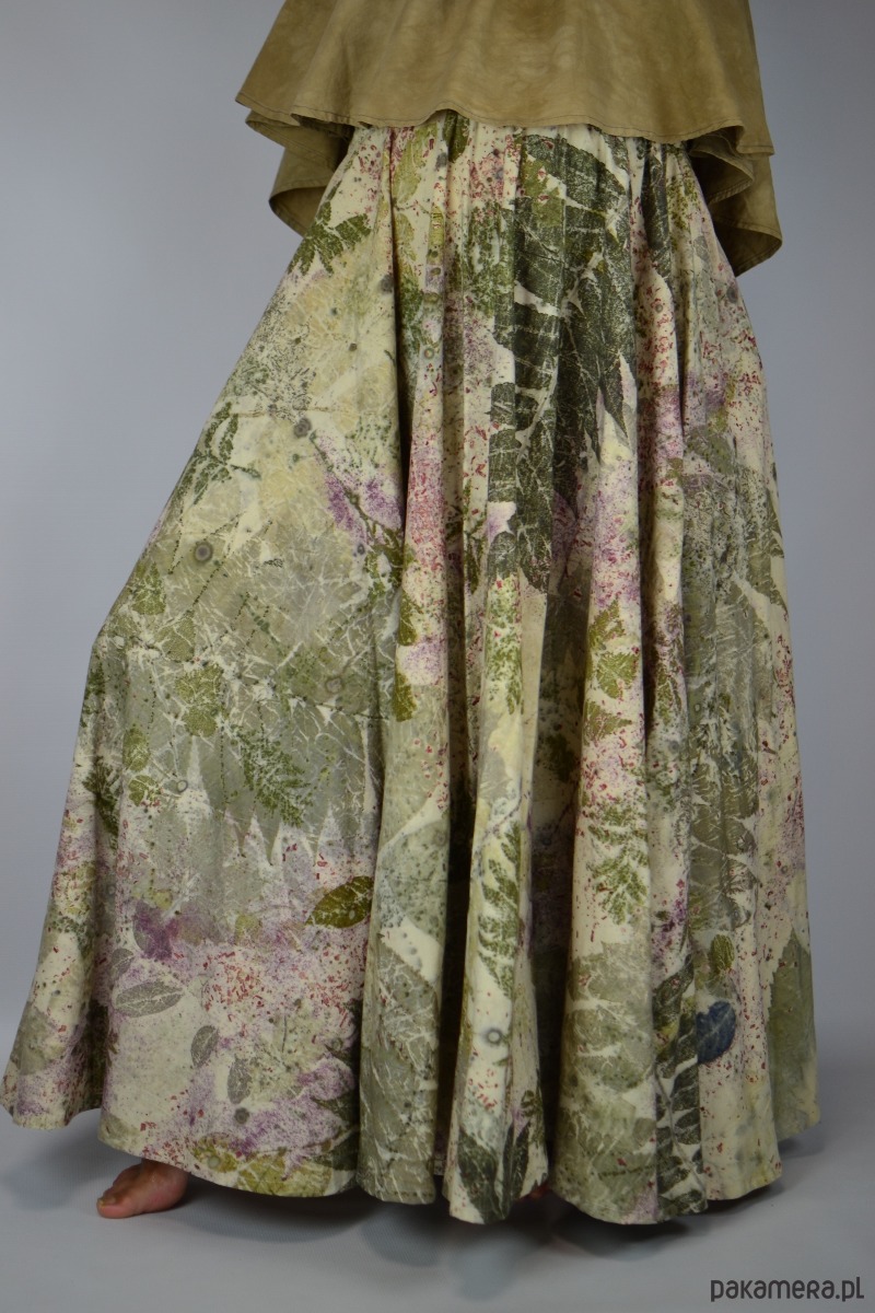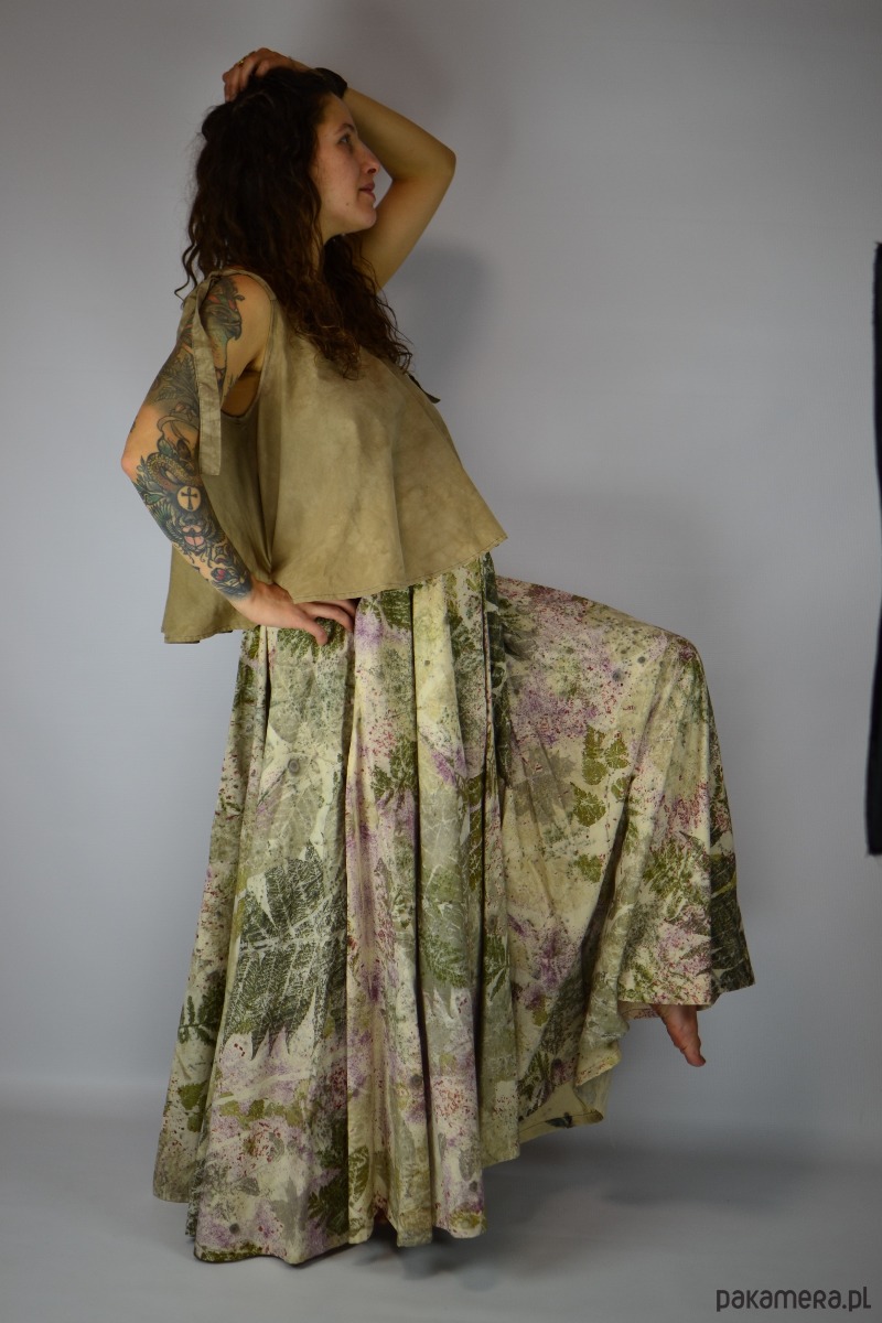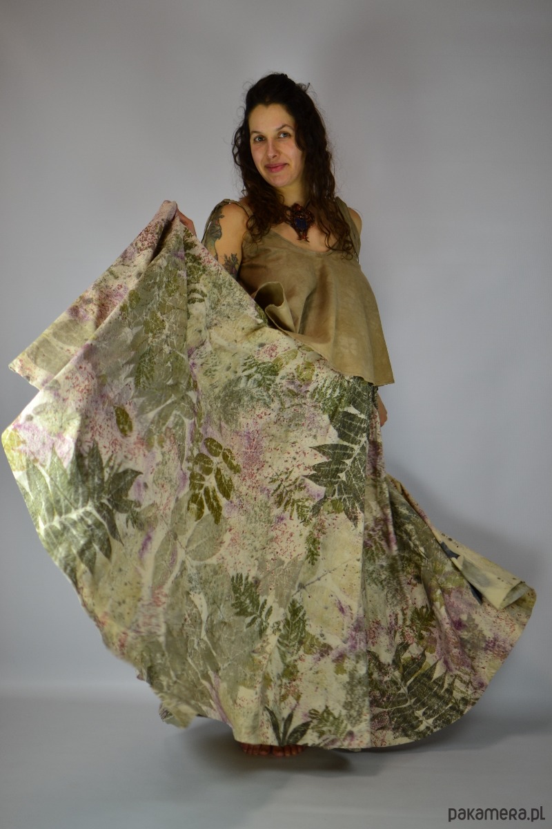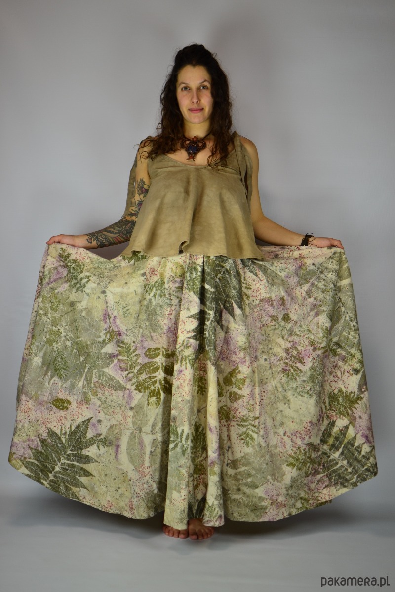 Spódnicę stworzyłam w procesie naturalnego barwienia roślinami techniką ecoprintu – druku kontaktowego. Do jej stworzenia użyłam liści sumaka, wrotyczu, orzecha, klona, robinii, brzozy i kłącza marzanny, które oddały swoje kształty i esencję tkaninie.
