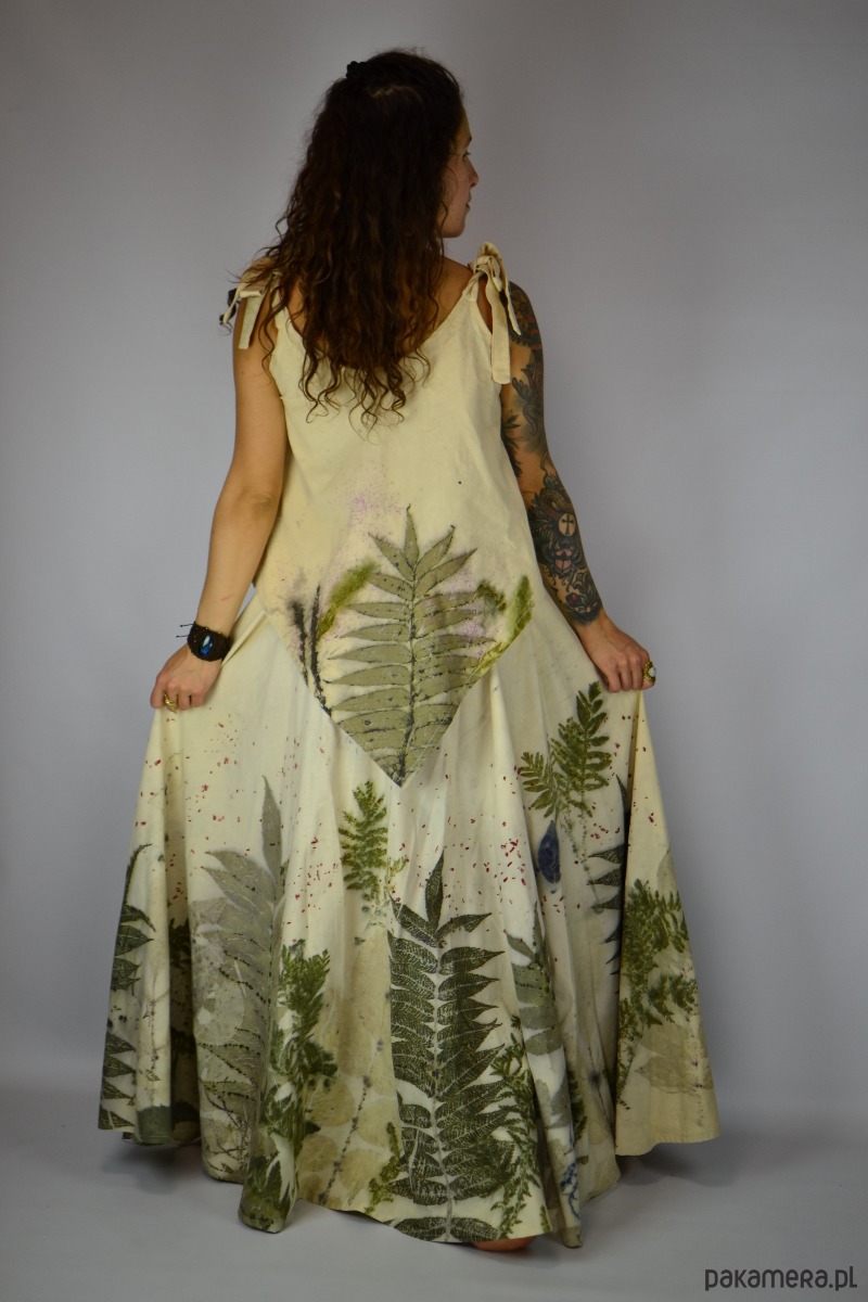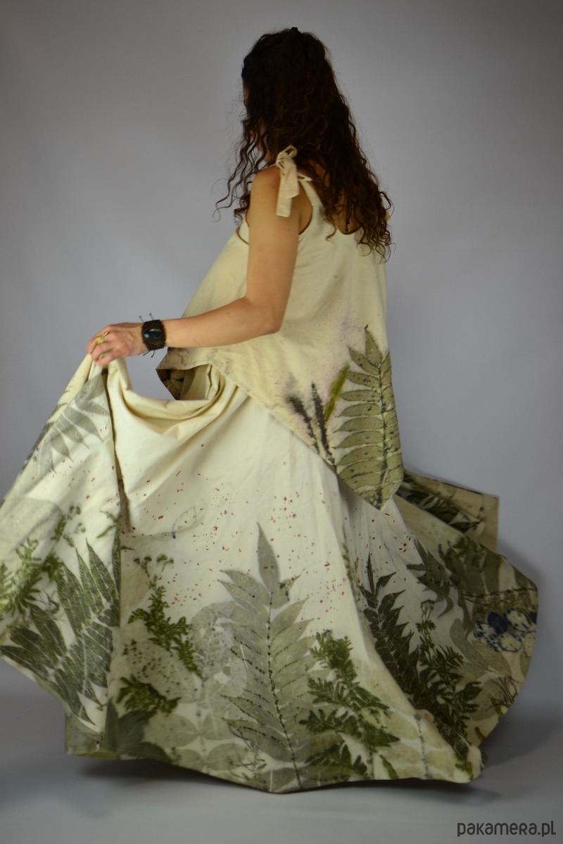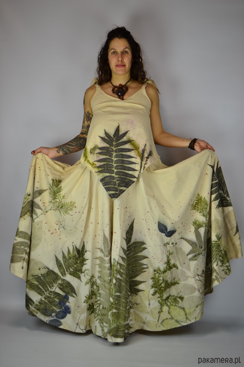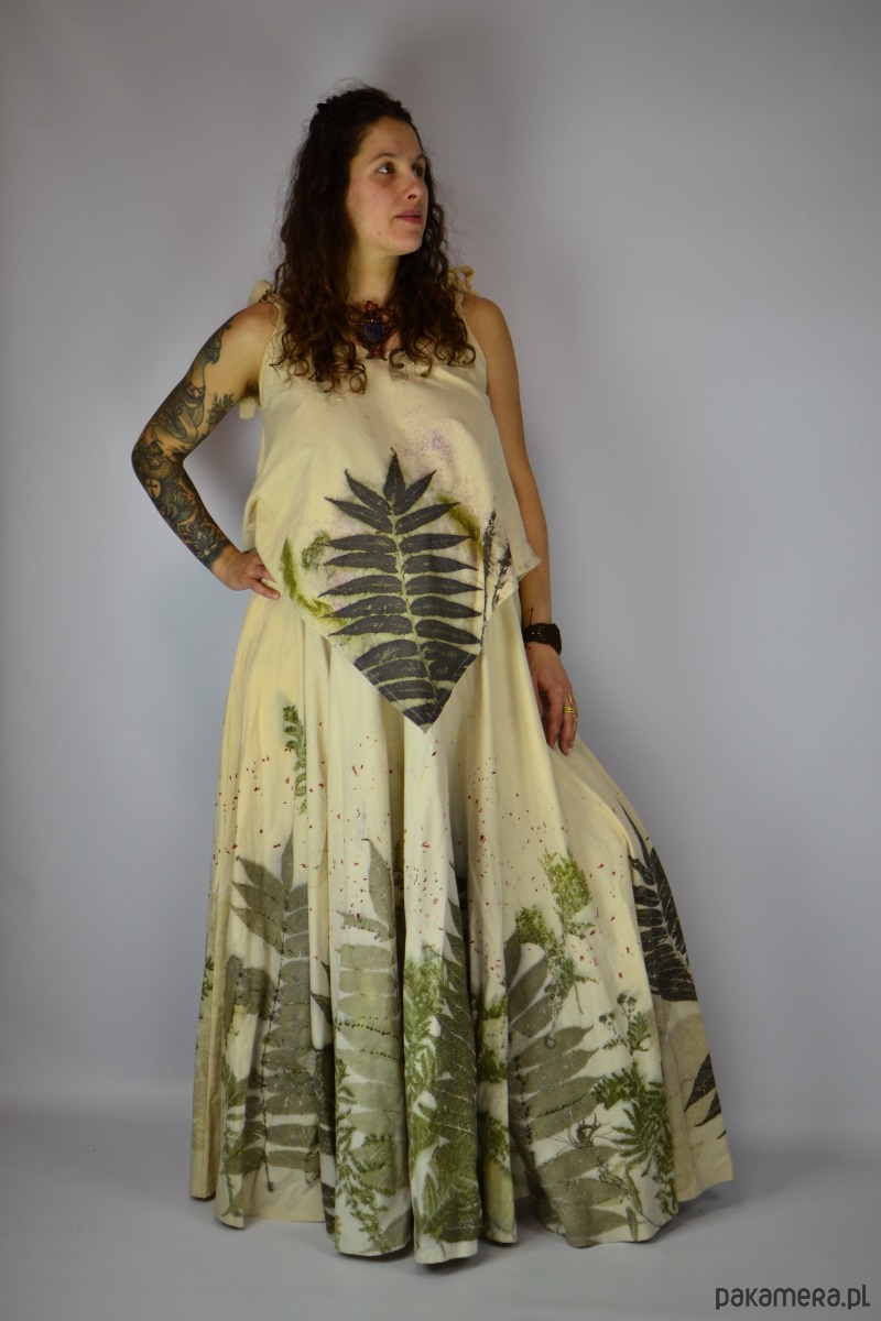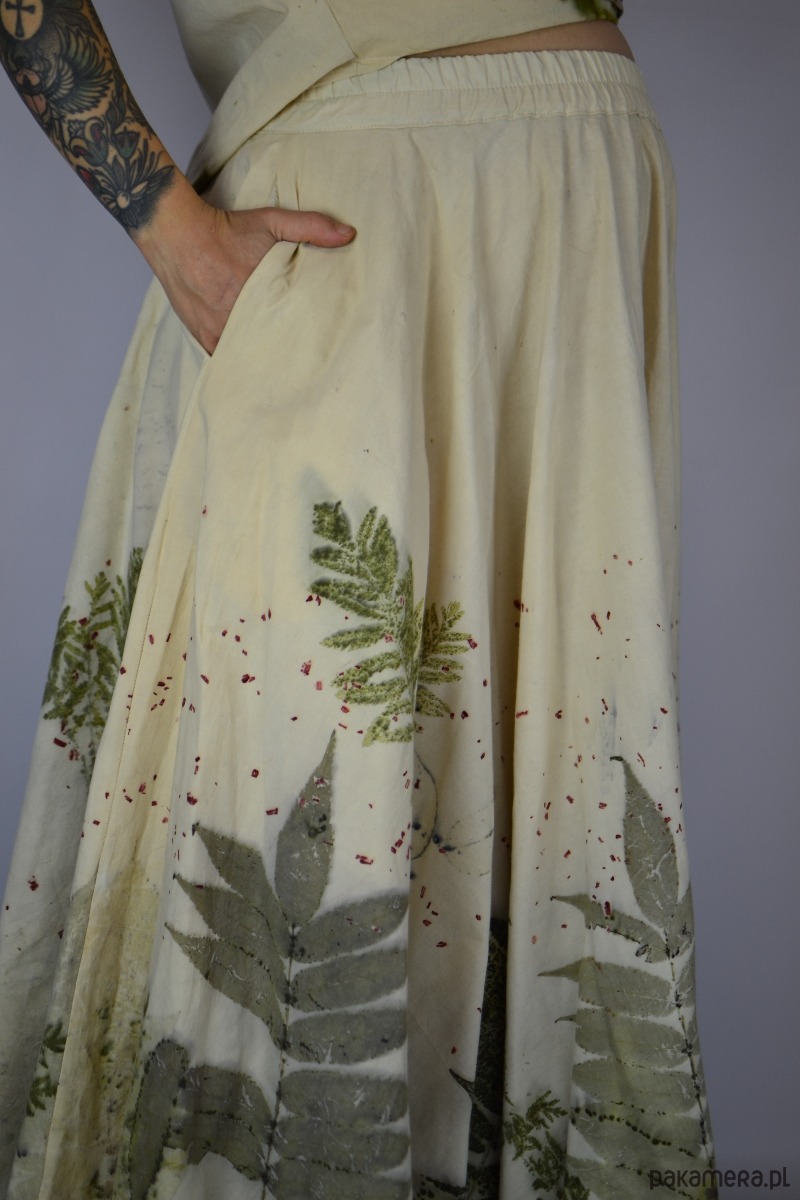 Spódnicę stworzyłam w procesie naturalnego barwienia roślinami techniką ecoprintu – druku kontaktowego. Do jej stworzenia użyłam liści sumaka, orzecha, wrotyczu i kłącza marzanny, które oddały swoje kształty i esencję tkaninie.