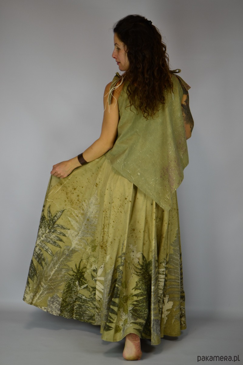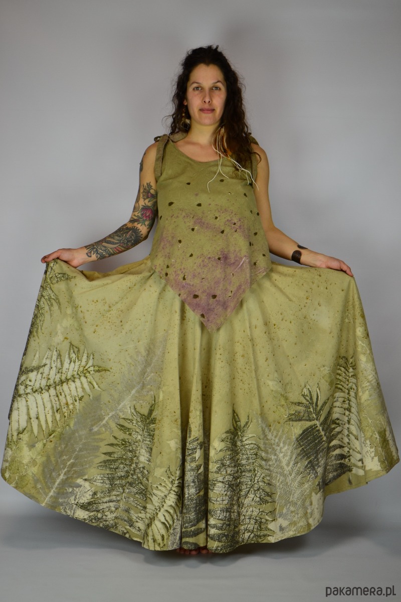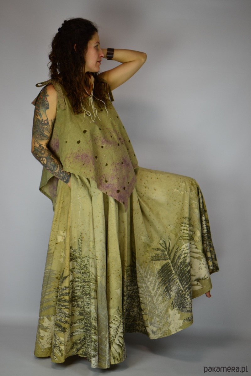 Spódnicę stworzyłam w procesie naturalnego barwienia roślinami techniką ecoprintu – druku kontaktowego. Do jej stworzenia użyłam liści sumaka, które oddały swoje kształty i esencję tkaninie. Leśne tło barwione wywarem z ziela nawłoci.