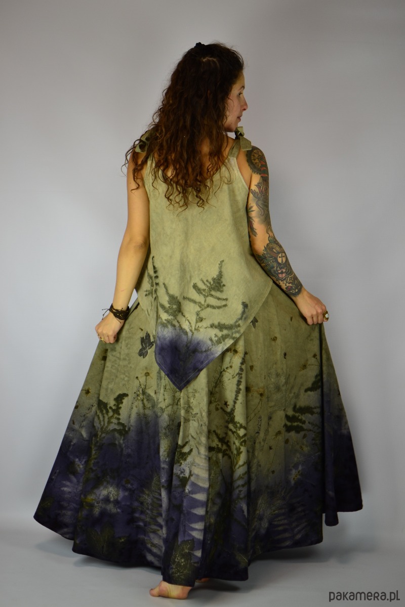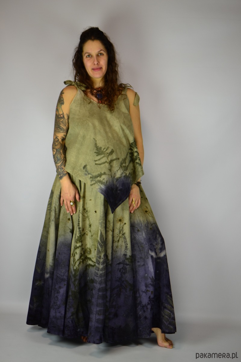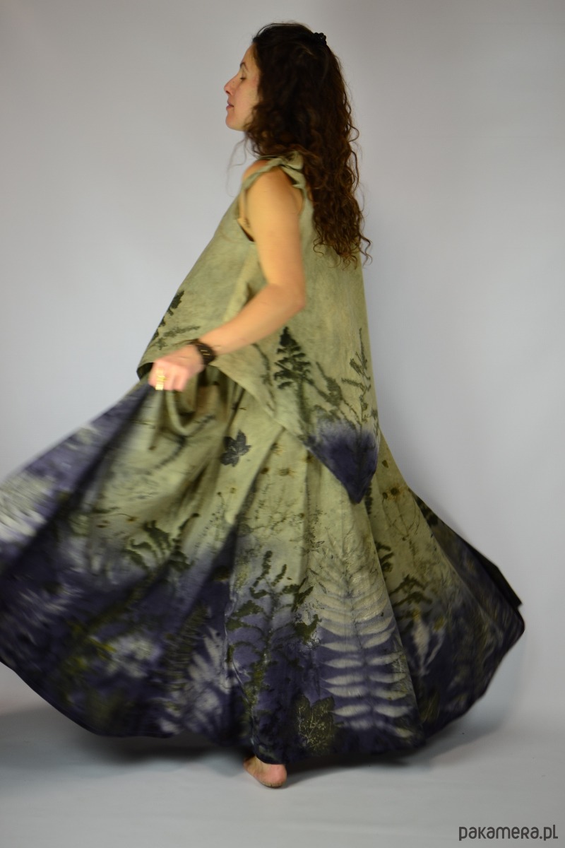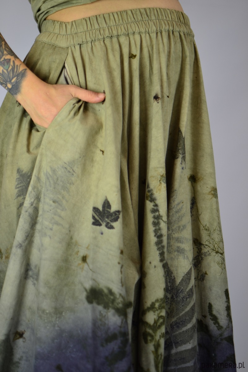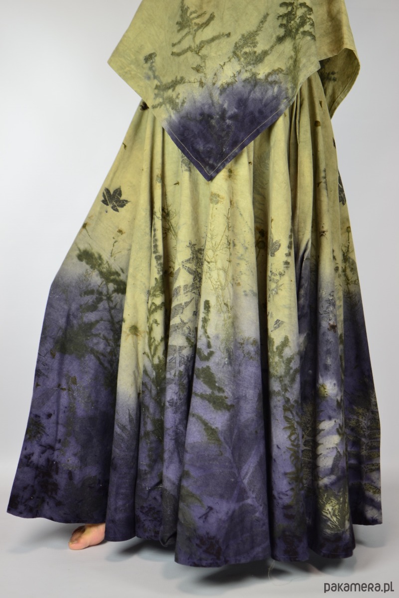 Spódnicę stworzyłam w procesie naturalnego barwienia roślinami techniką ecoprintu – druku kontaktowego. Do jej stworzenia użyłam ziela nawłoci, krwawnicy, paproci, liści sumaka i klonu. Wyjątkowe łąkowe tło stworzone z wywarów z drewna modrzejca i ziela wrotyczu.