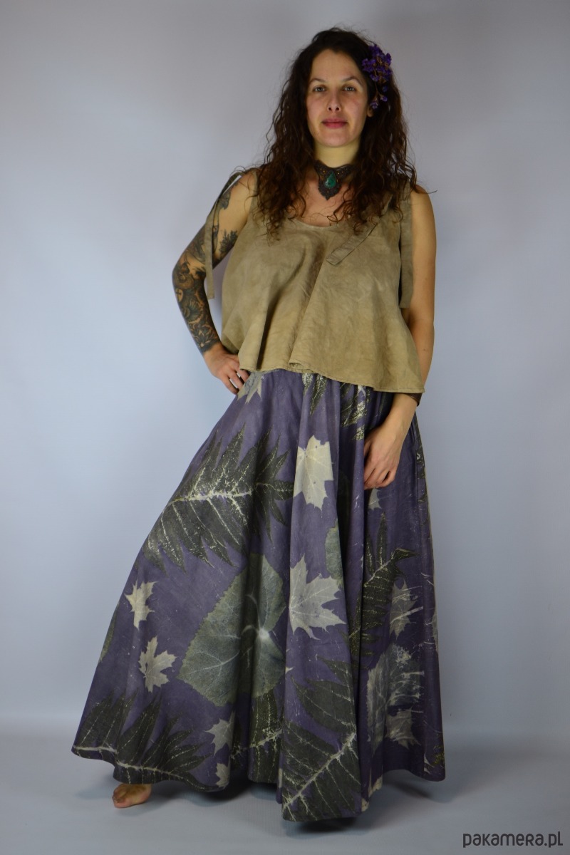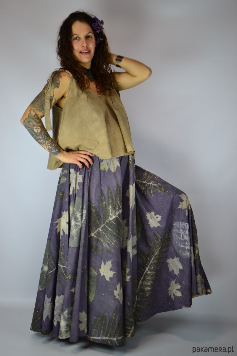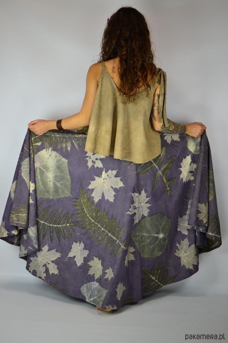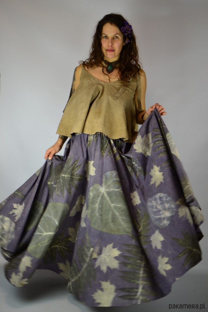 Spódnicę stworzyłam w procesie naturalnego barwienia roślinami techniką ecoprintu – druku kontaktowego. Do jej stworzenia użyłam liści sumaka, klonu i katalpy, które oddały swoje kształty i esencję tkaninie. Tło barwiłam wywarem z drewna modrzejca.
