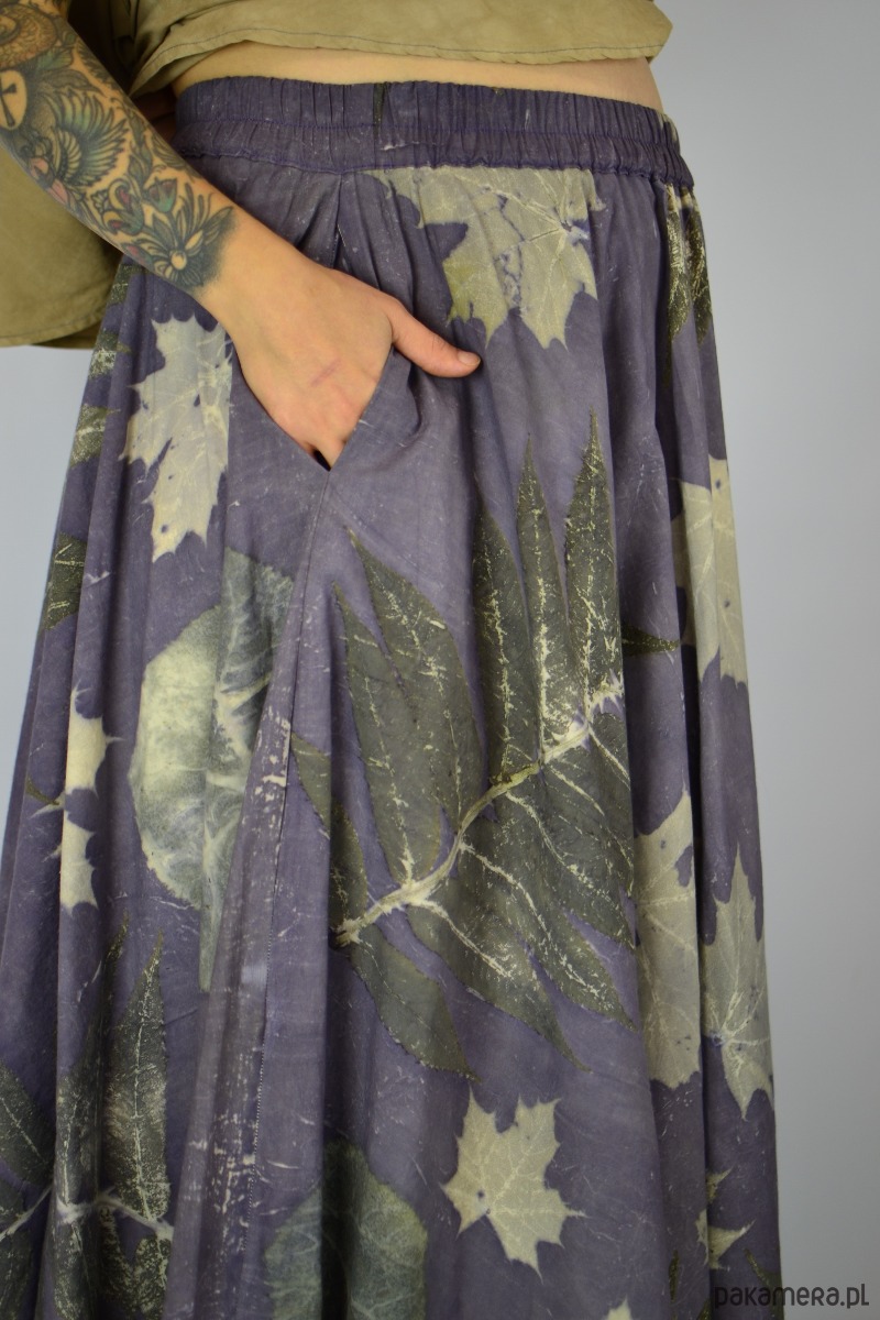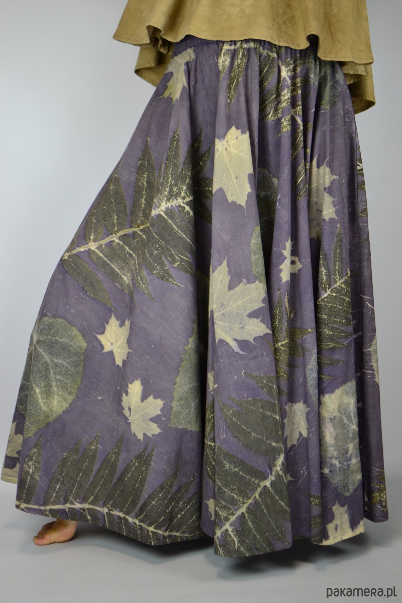 Spódnicę z koła „Nocny Las”, barwiłam techniką ecoprint -każdy liść zostawił swój prawdziwy ślad.