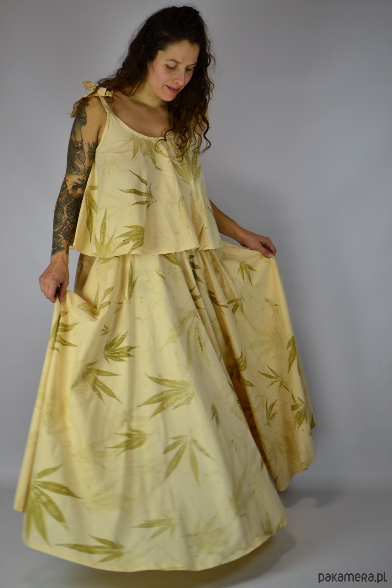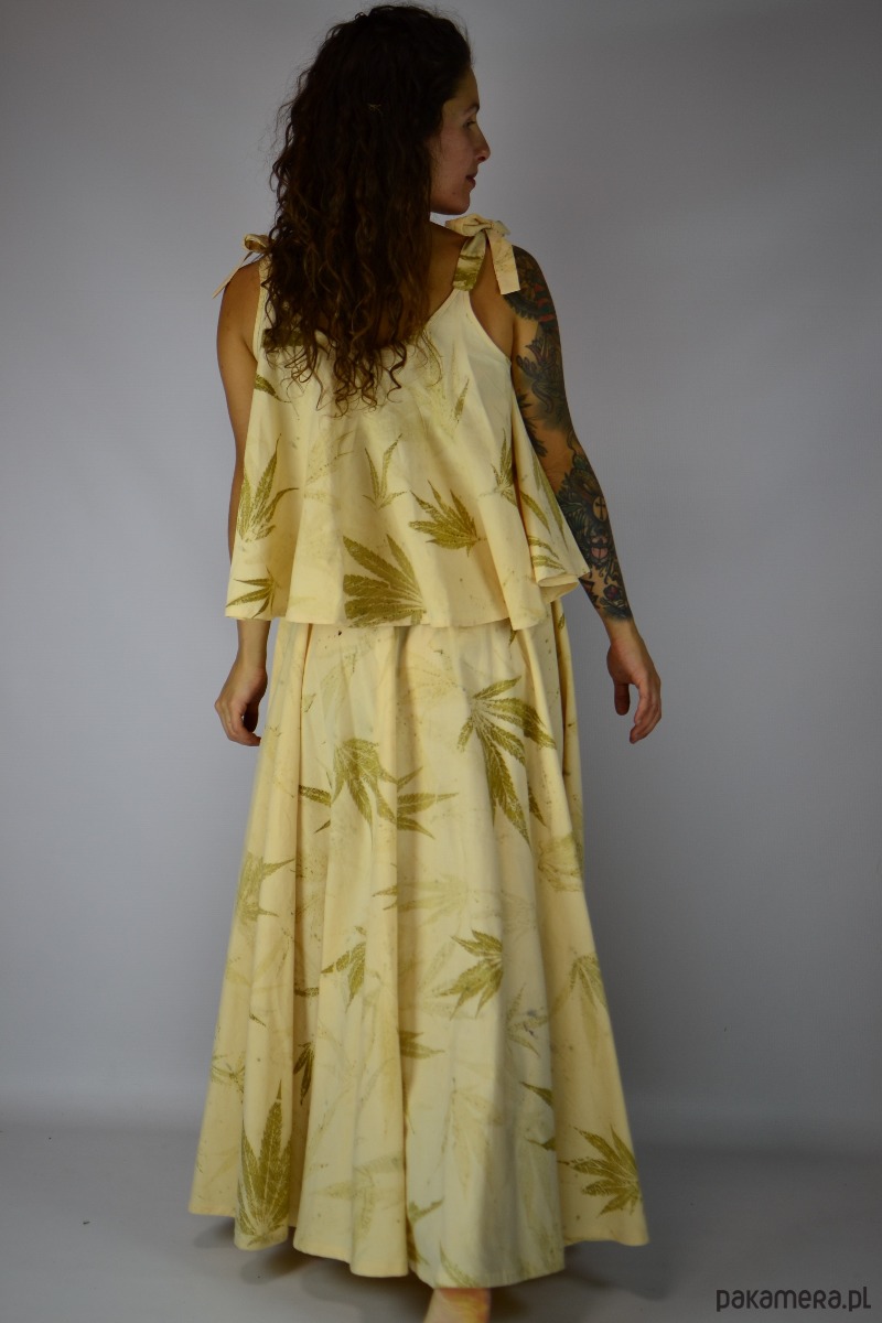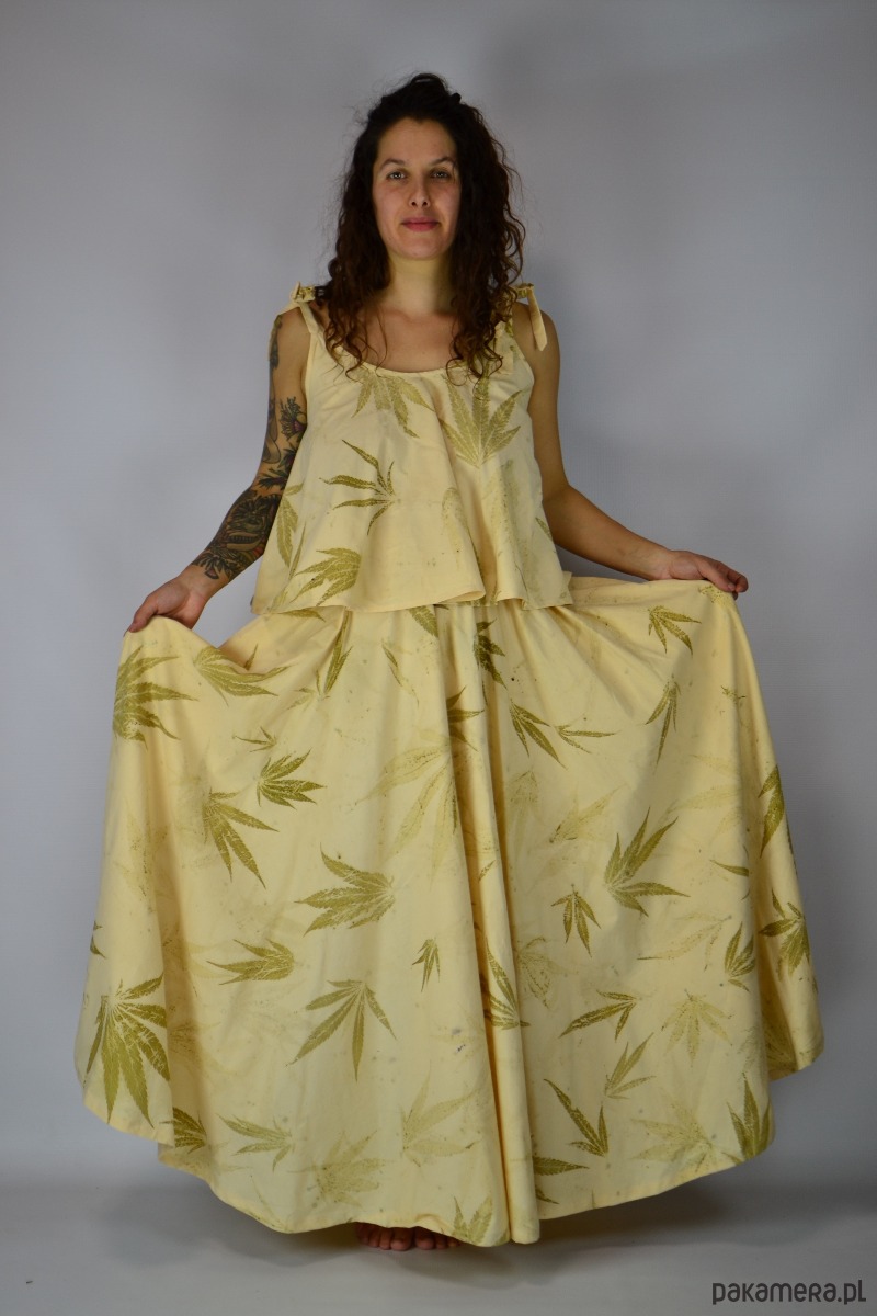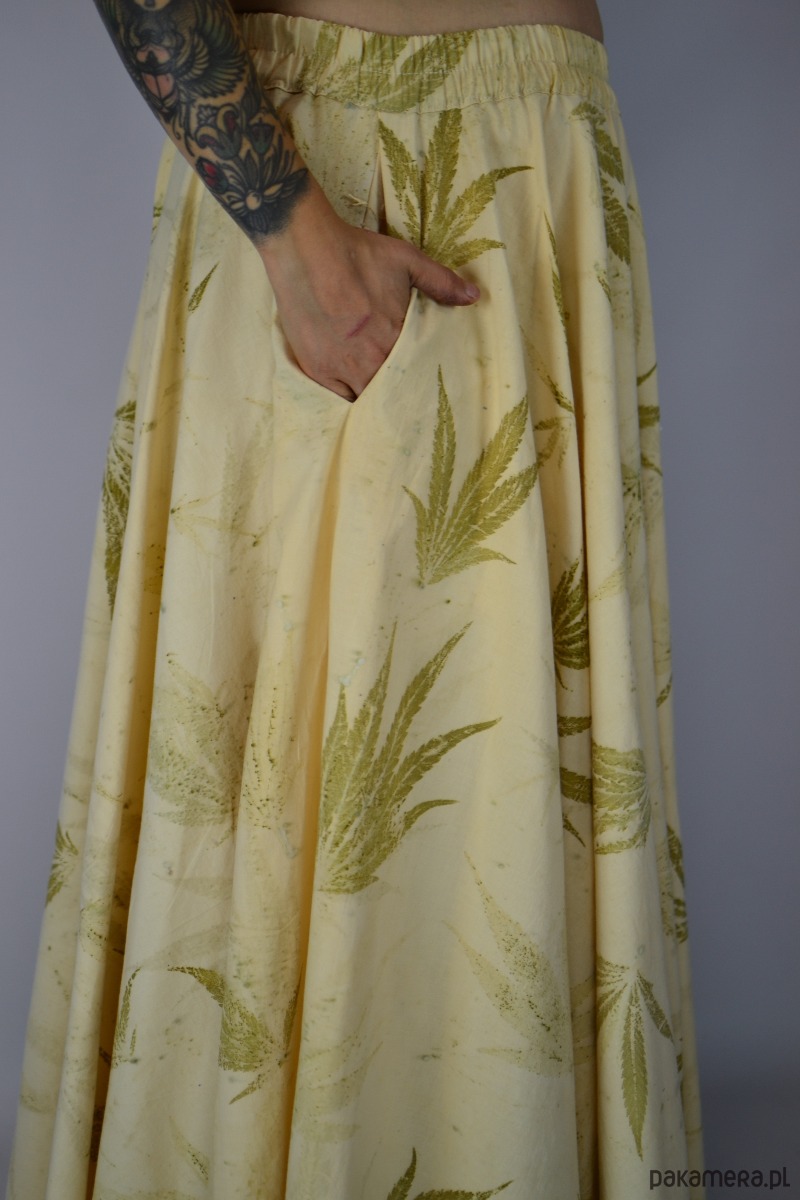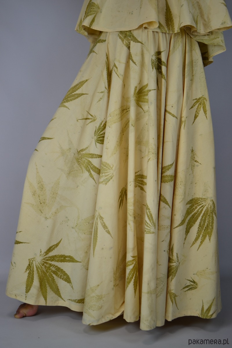 Spódnicę stworzyłam w procesie naturalnego barwienia roślinami techniką ecoprintu – druku kontaktowego. Do jej stworzenia użyłam liści konopii.