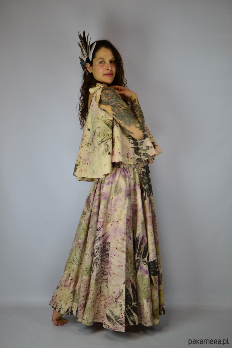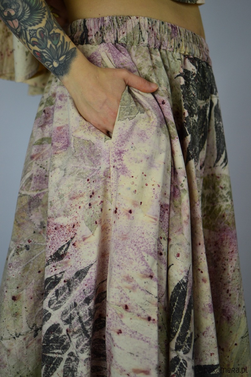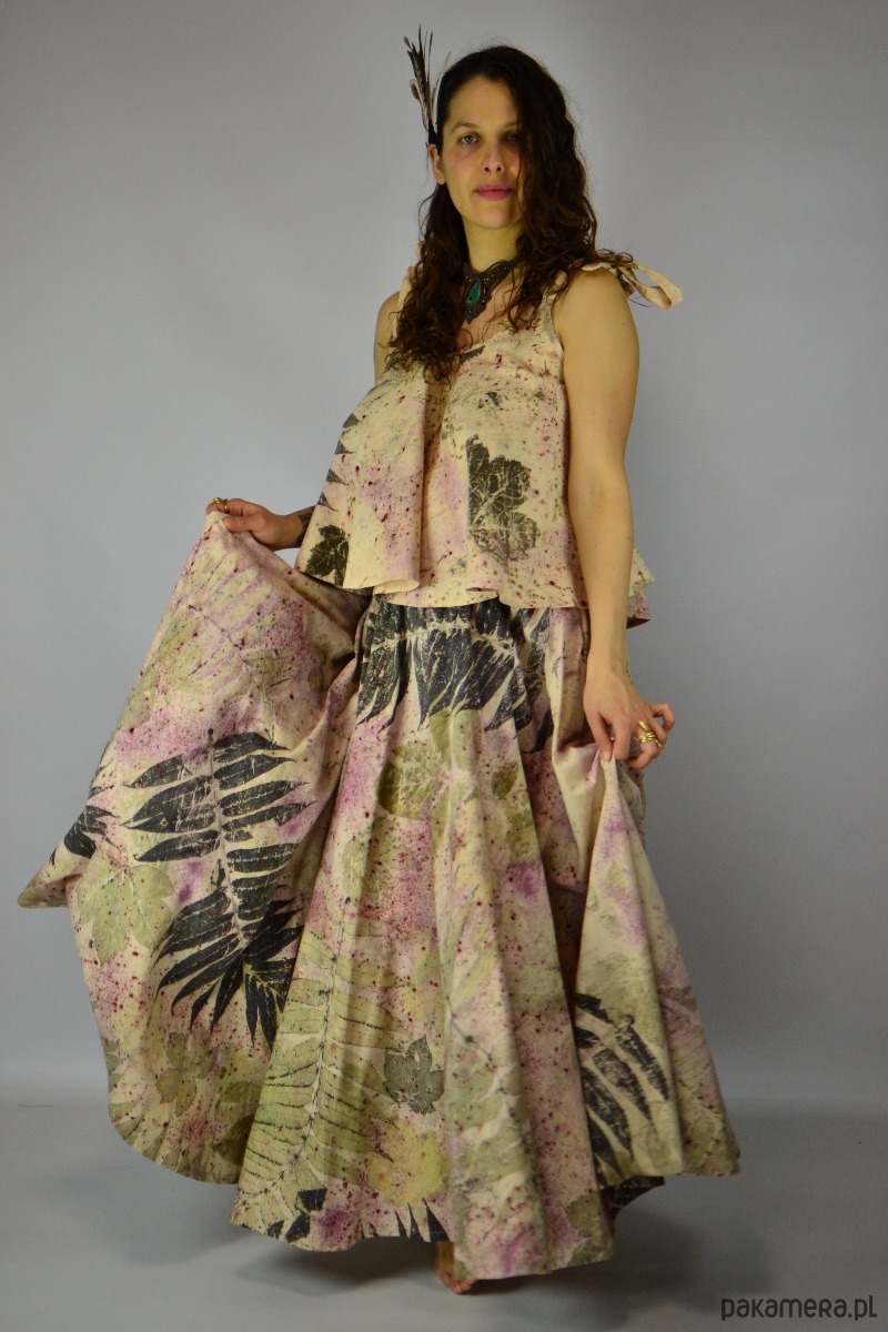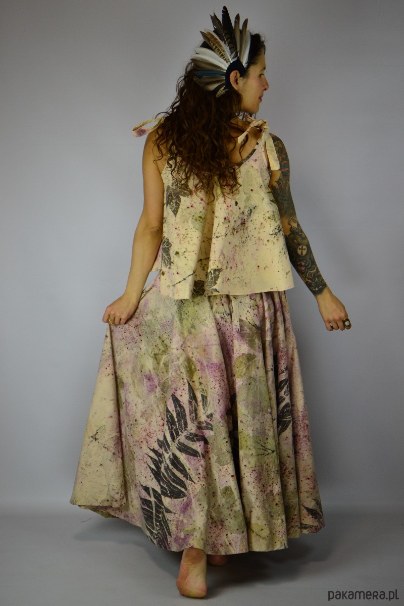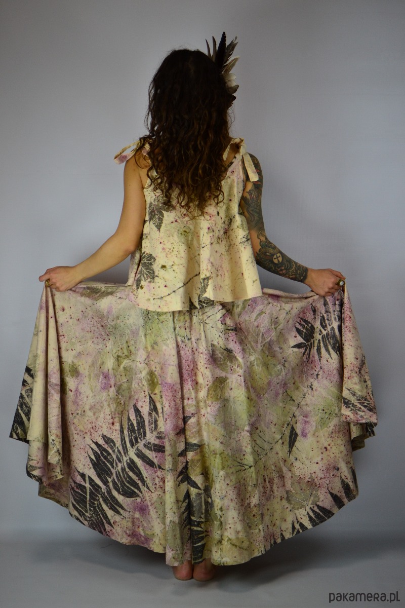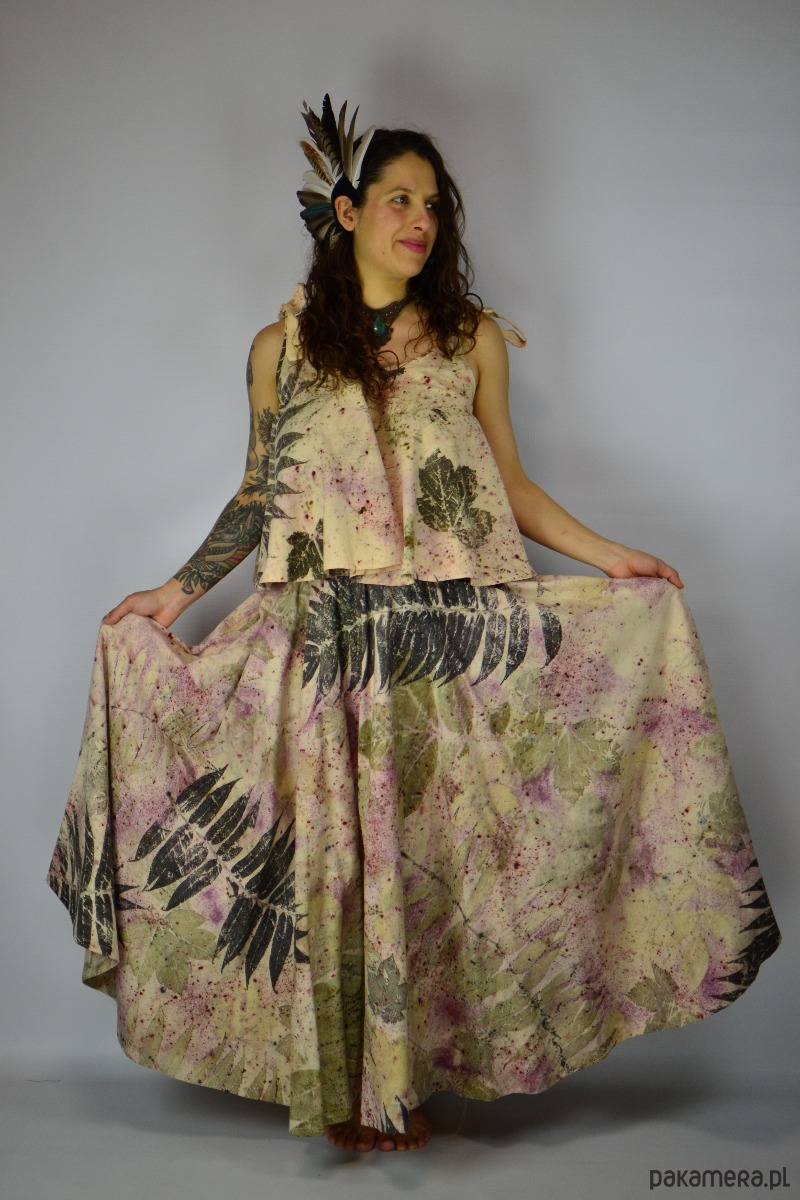 Spódnicę stworzyłam w procesie naturalnego barwienia roślinami techniką ecoprintu – druku kontaktowego. Do jej stworzenia użyłam liści klonu , orzecha, sumaka, kłącza marzanny i brezylki, które oddały swoje kształty i esencję tkaninie..