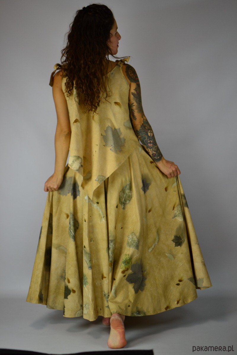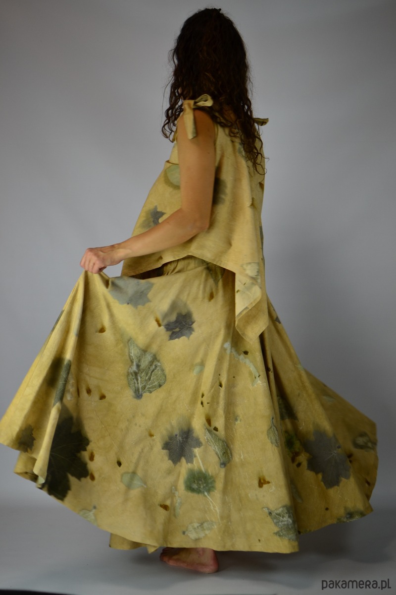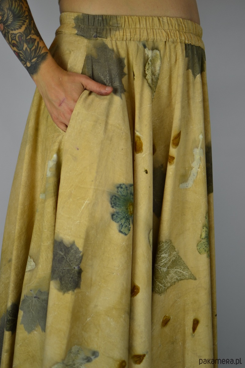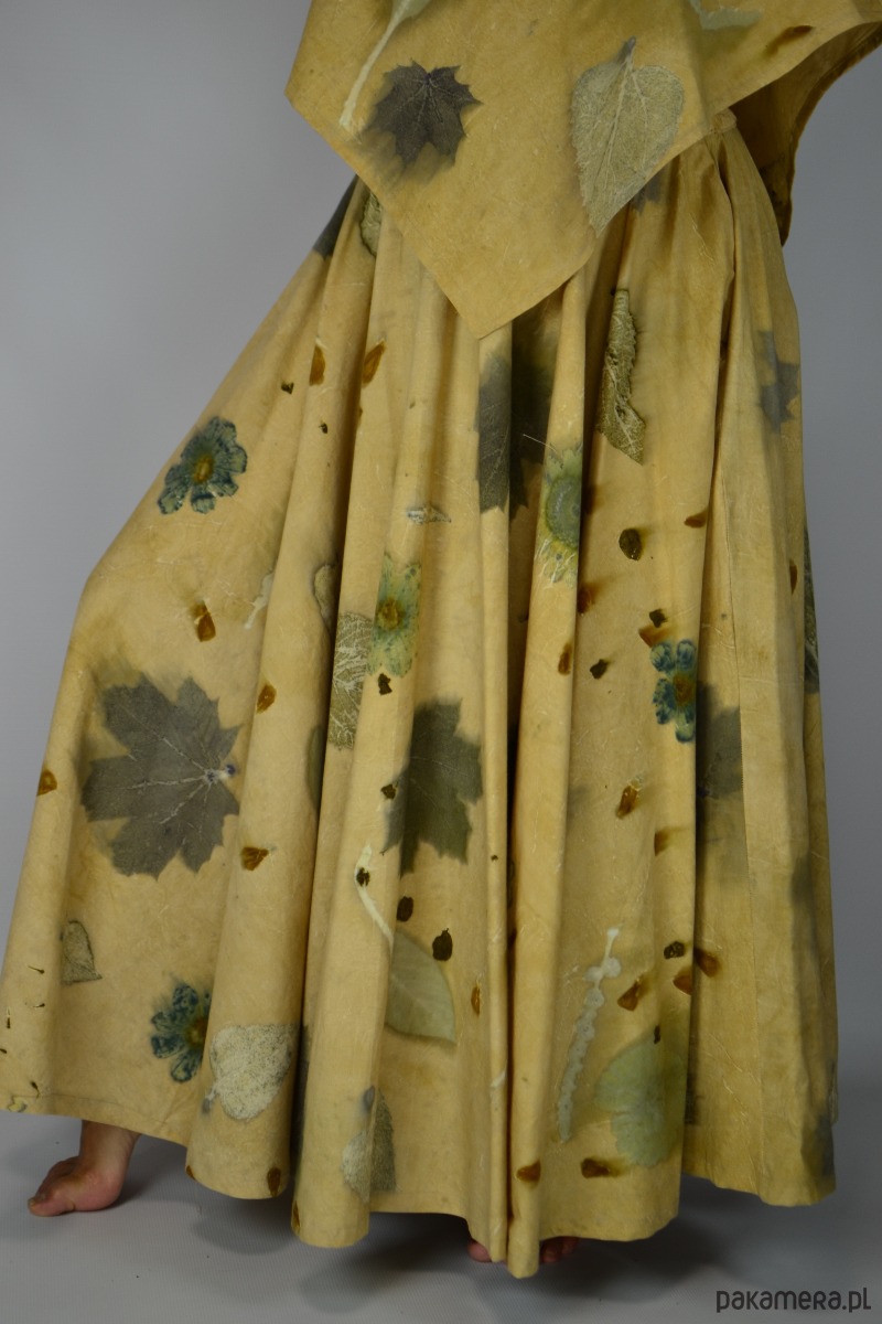 Spódnica powstała w procesie naturalnego barwienia roślinami techniką ecoprintu – druku kontaktowego. Do jej stworzenia użyłam liści klonu, brzozy, kwiatów słonecznika i kosmosów, które oddały swoje kształty i esencję tkaninie. Tło kąpane w wywarze z łupki cebuli.