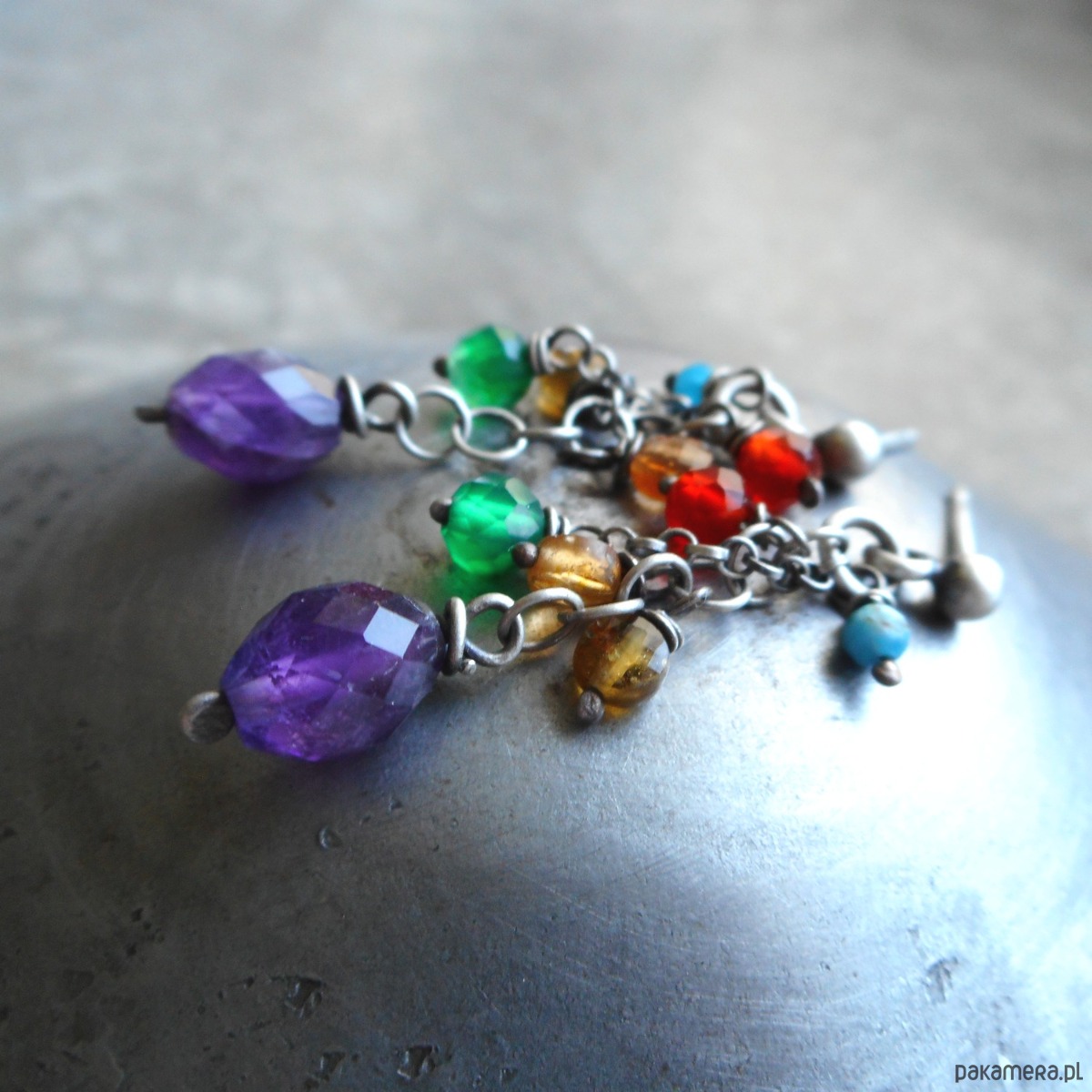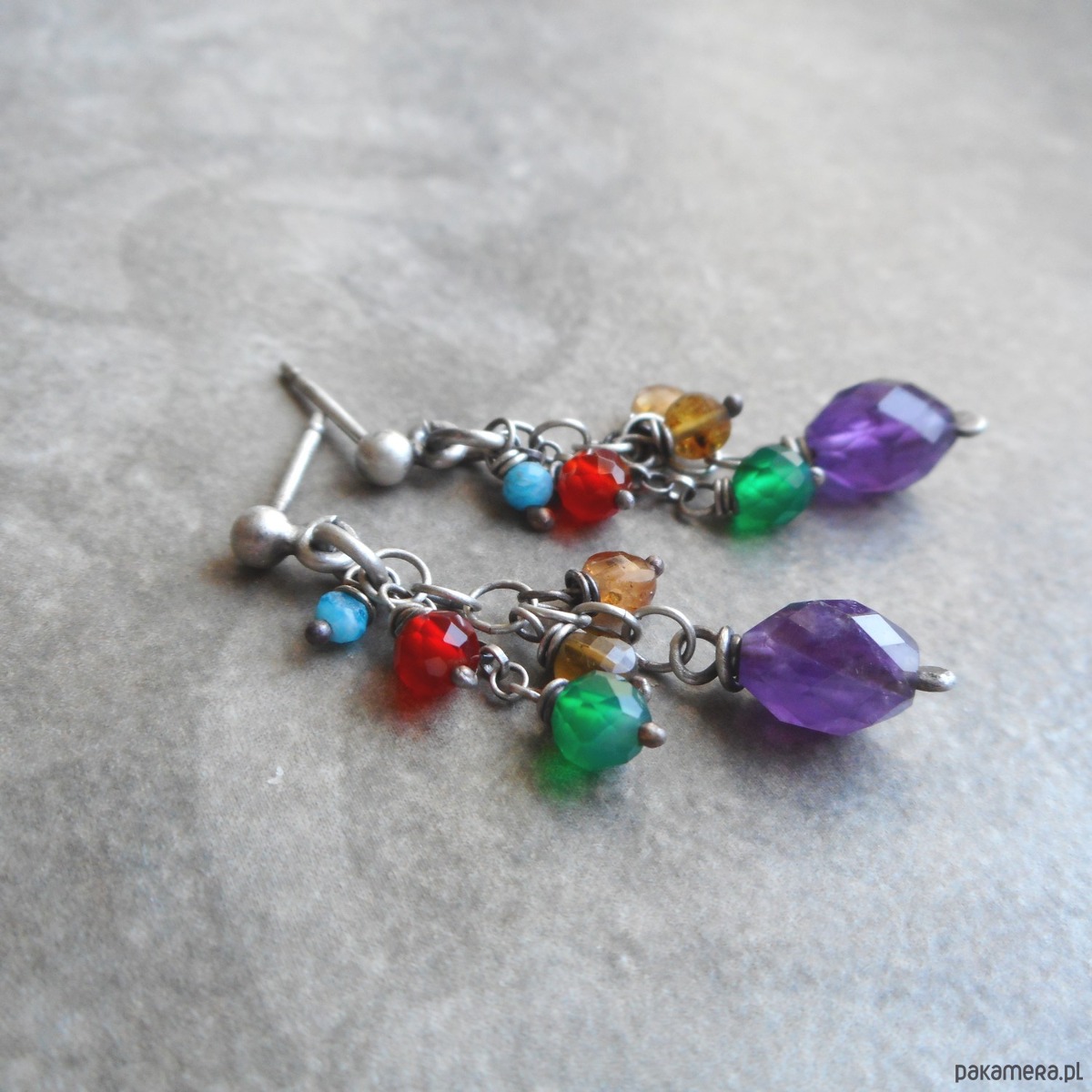 Niewielkie kolczyki z kamieni naturalnych i szlachetnego srebra, wygodne, wiszące, połączenie o srebra i kolorowych, fasetowanych minerałów nadaje biżuterii niepowtarzalnego charakteru.