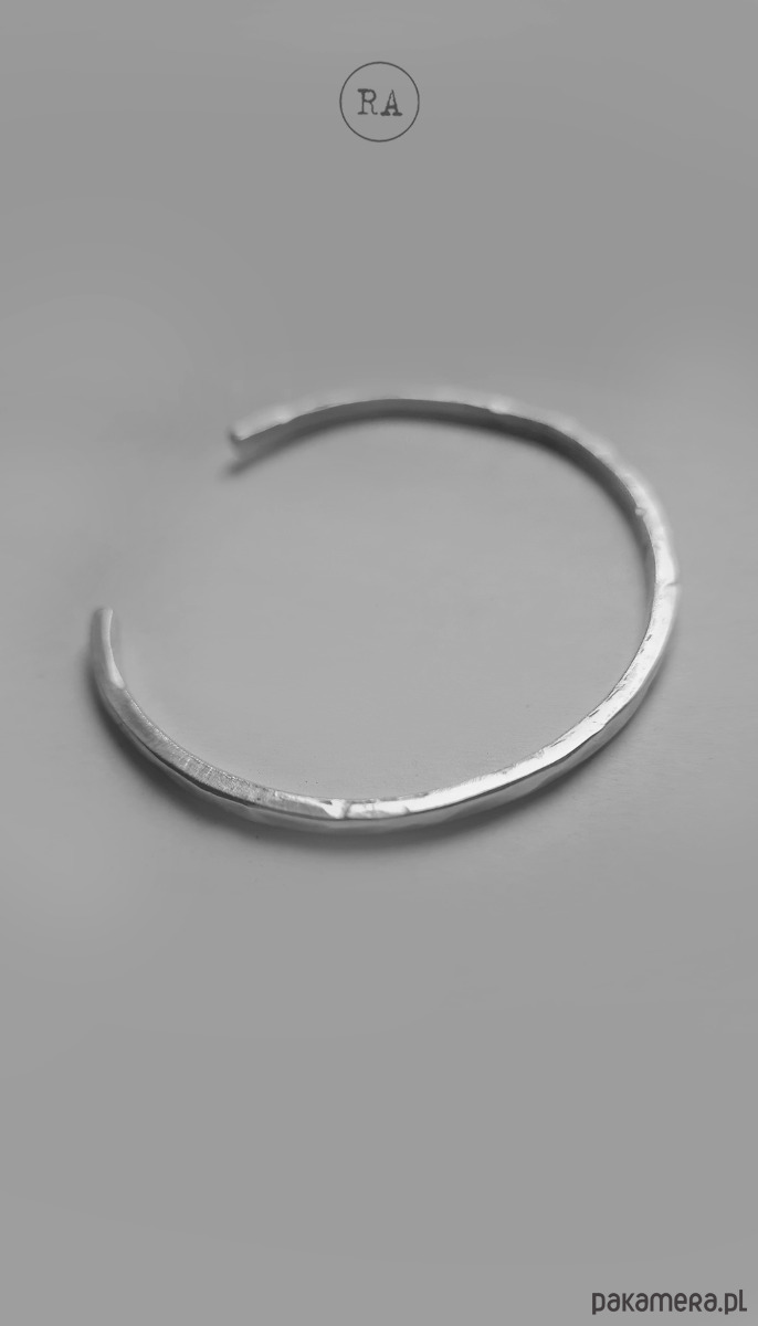 Srebrna bransoleta otwarta, o szerokości ok. 3 mm, młotkowana, lekko oksydowana.