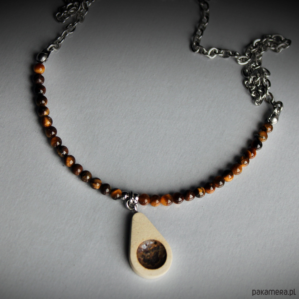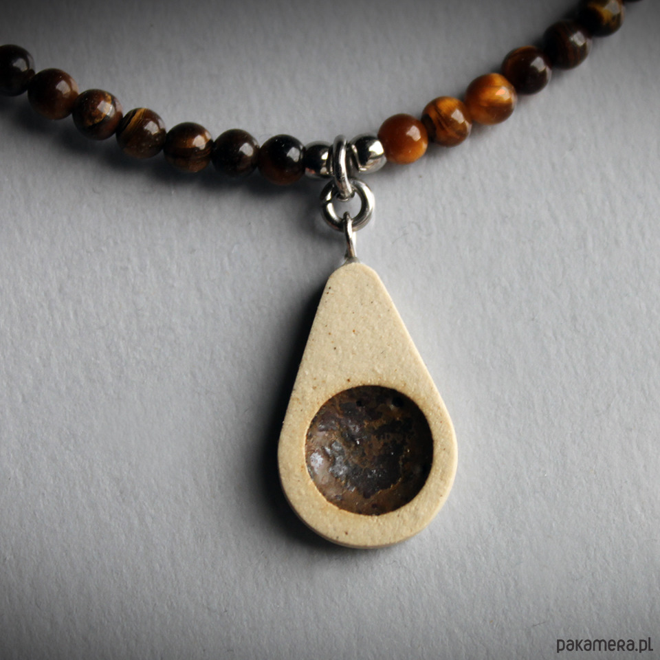 Ceramiczny naszyjnik, ręcznie wykonany z delikatnej barwionej porcelany, częściowo pokryty szkliwem pozyskanym z bazaltu, pochodzącego ze Strzelina na Dolnym Śląsku, zawieszony na łańcuszku ze stali chirurgicznej w kolorze jasnego srebra, wraz z kuleczkami tygrysiego oka. Długość zawieszki ok.22mm, długość łańcuszka 42cm. Polecam