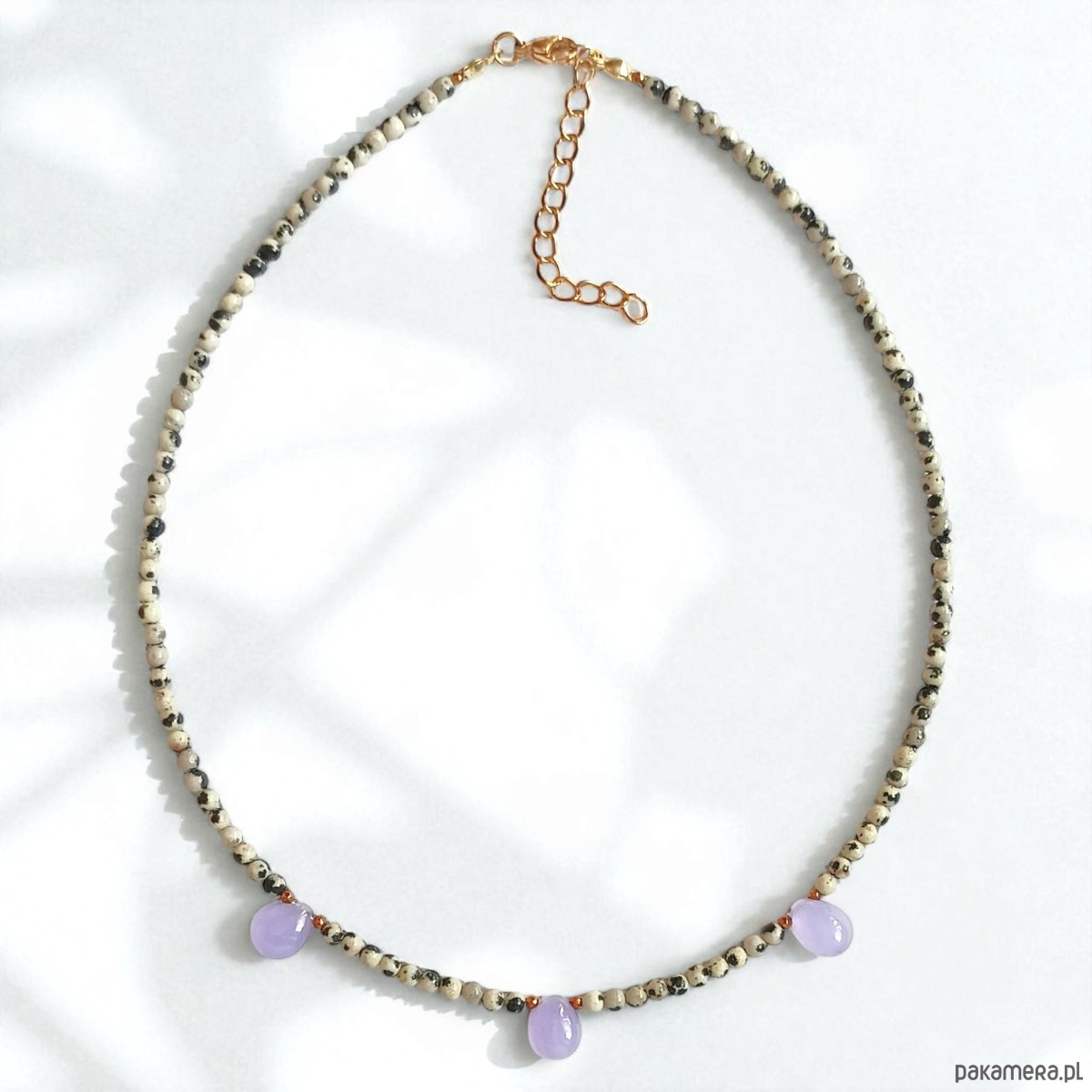 Naszyjnik na solidnej lince stalowej (miękkiej) - został wykonany z drobnych kuleczek jaspisu dalmatyńskiego ok. 3mm, trzech kropli fioletowego jadeitu ok.10mm oraz przekładek ze złotego hematytu.
