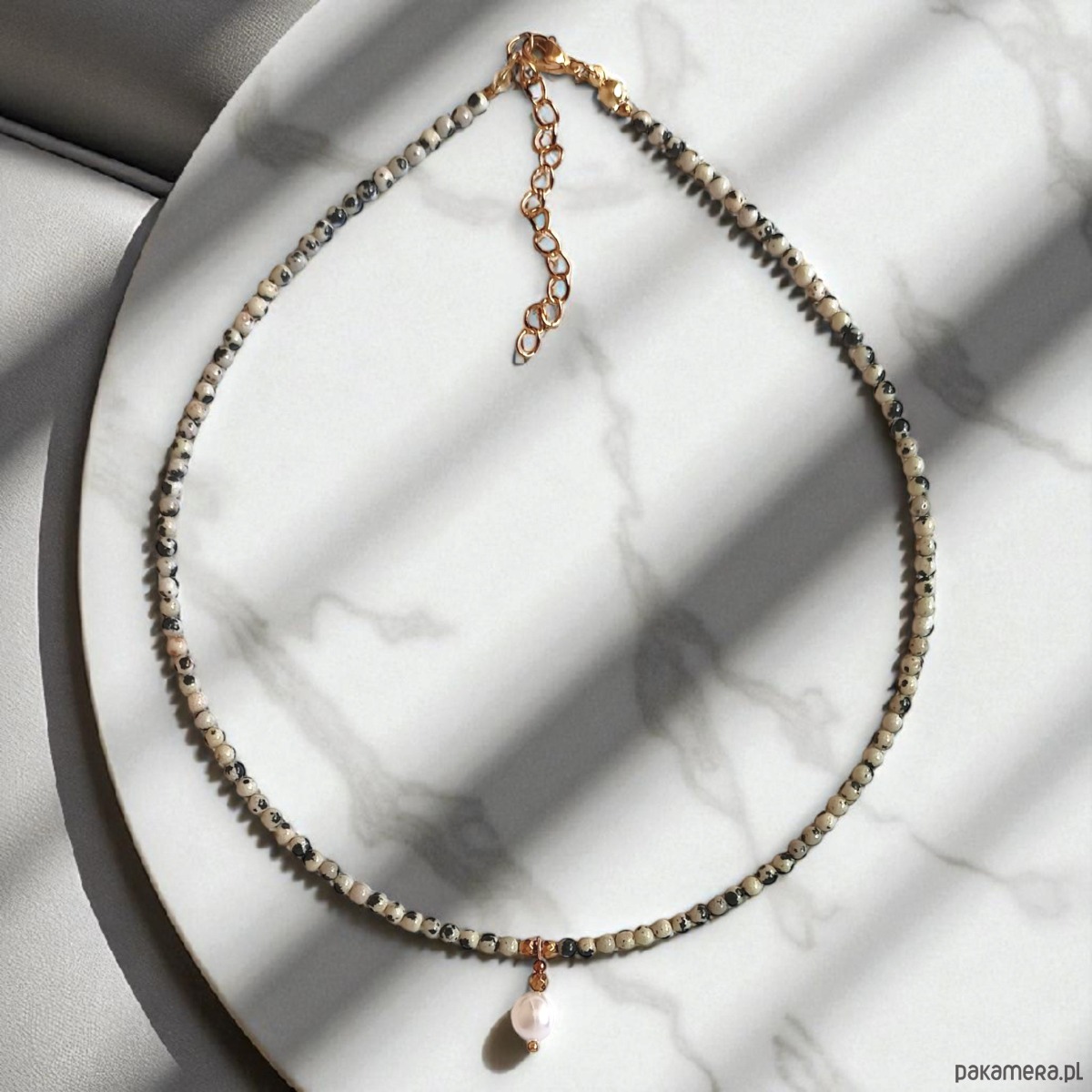 Naszyjnik na solidnej lince stalowej (miękkiej) - został wykonany z drobnych kuleczek jaspisu dalmatyńskiego ok. 3mm, dużej perły słodkowodnej ok.9mm oraz przekładek ze złotego hematytu.