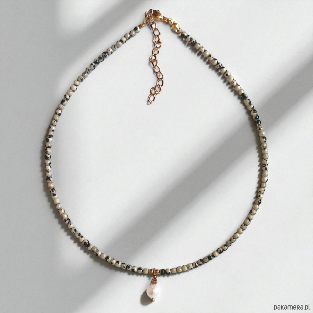Naszyjnik na solidnej lince stalowej (miękkiej) - został wykonany z drobnych kuleczek jaspisu dalmatyńskiego ok. 3mm, dużej perły słodkowodnej ok.9mm oraz przekładek ze złotego hematytu.