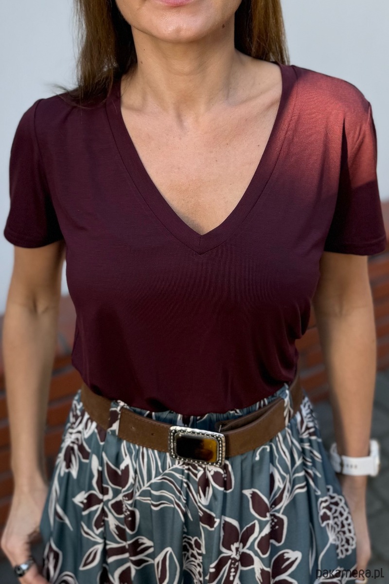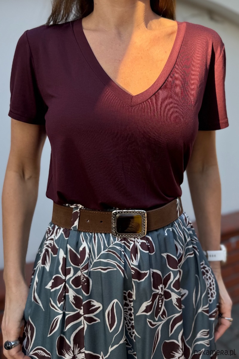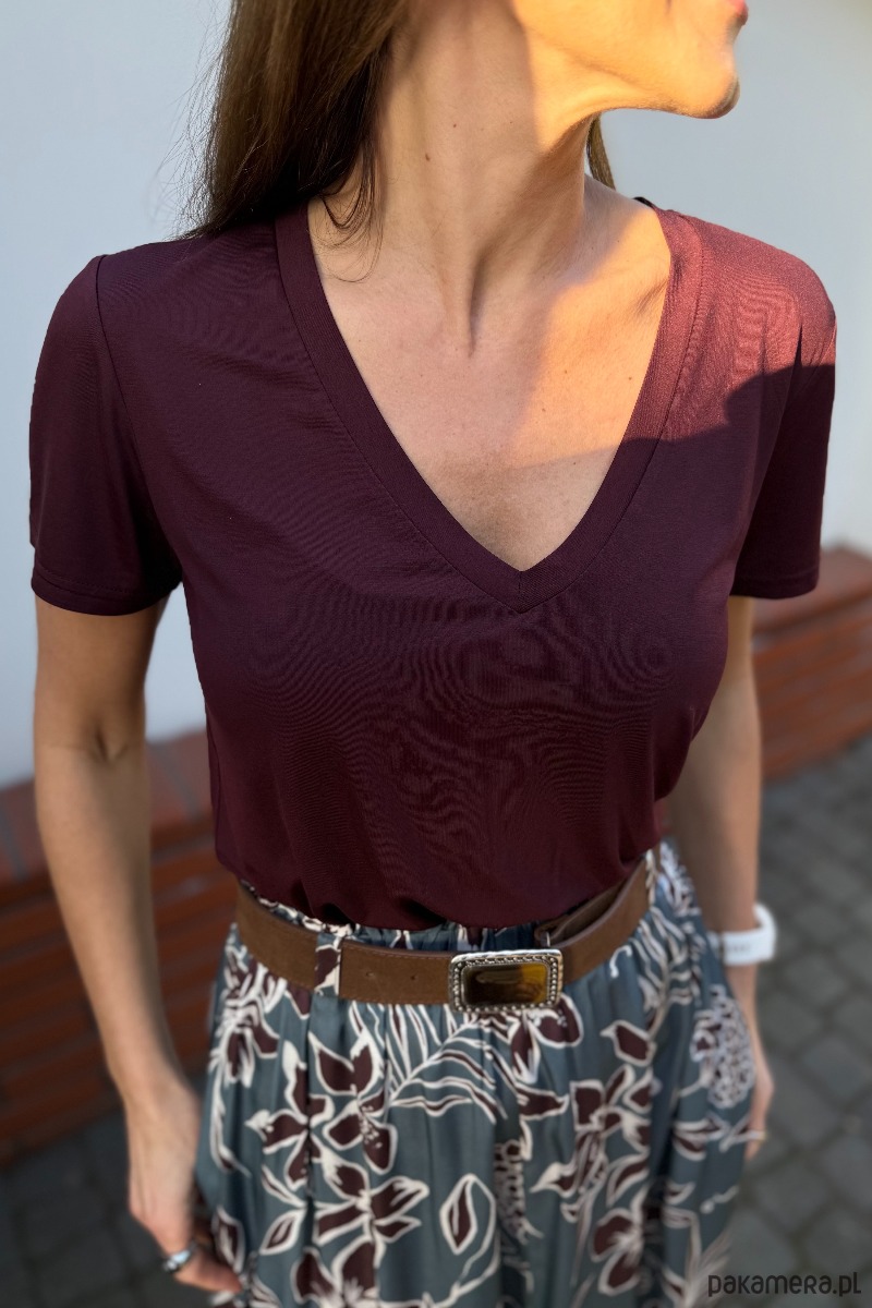 Klasyczny basic z krótkim rękawem o prostym, luźnym kroju w kolorze oberżyny wykonany z wysokiej jakości zwiewnego, satynowego modalu. Dekolt w serek optycznie wydłuża szyję. Must Have w każdej szafie. Dodatek elastanu sprawia, że idealnie dopasuje się do każdej sylwetki. Jest idealnym uzupełnieniem każdej stylizacji. Pasuje zarówno do spodni, jak i spódnic. Idealnie zaprezentuje się do marynarki. To model, który znakomicie prezentuje się z prostymi jeansami, jak i z rozkloszowaną spódnicą. Naturalny materiał sprawia, że bluzka perfekcyjnie nadaje się na każdą porę roku, a szczególnie na okres wiosenno/letni, ponieważ delikatny modal ma właściwości chłodzące. Występuje w trzech rozmiarach S, M i L. Wyprodukowany w Polsce, w kameralnej pracowni na warszawskiej Pradze.