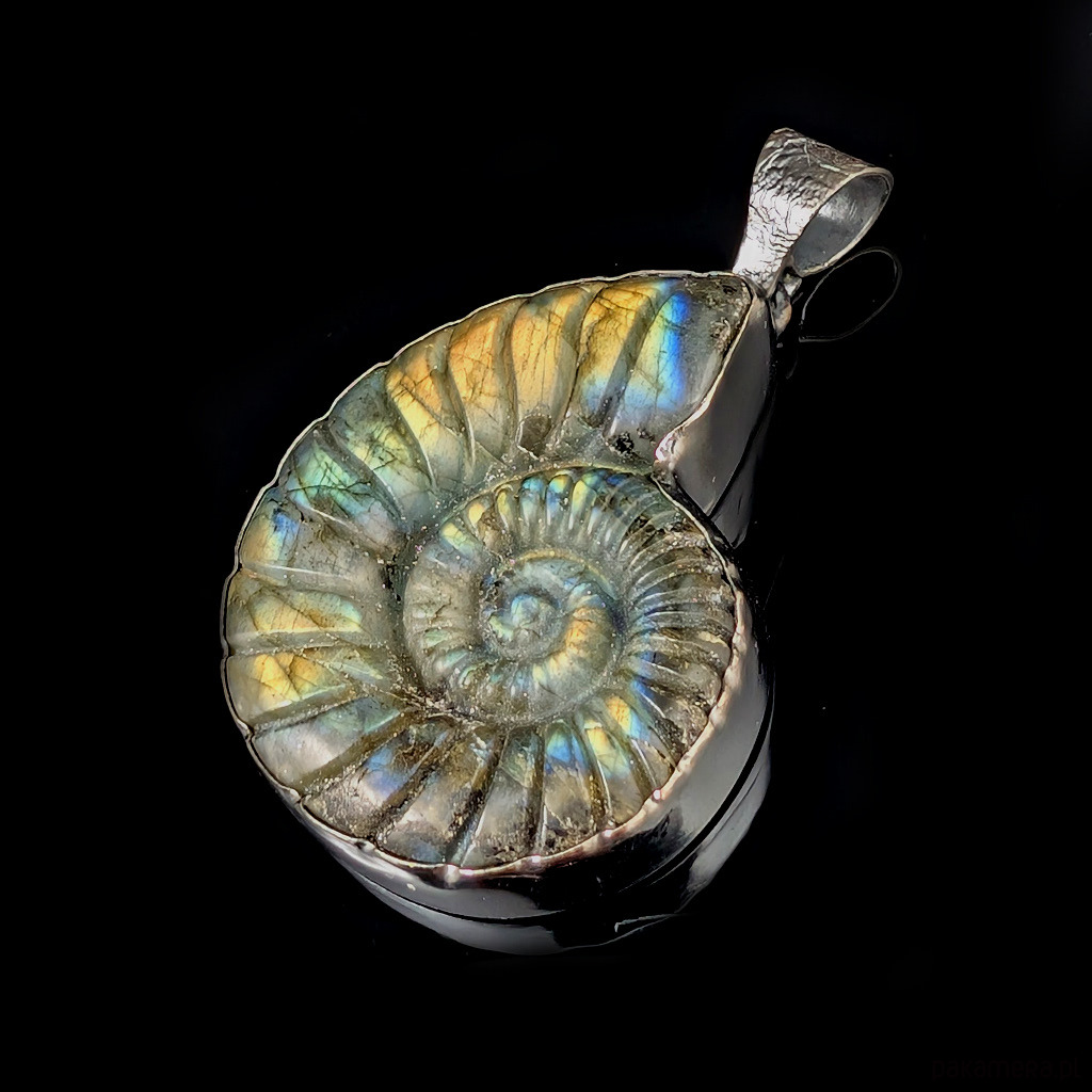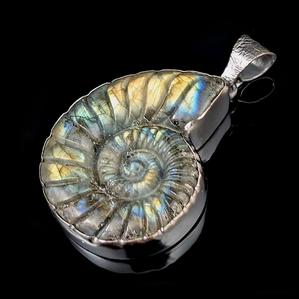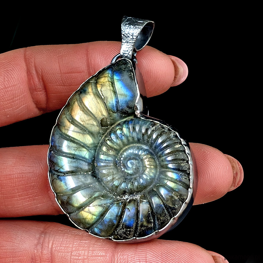 Bardzo okazały, pełen elegancji wisior z oksydowanego srebra próby 925 oraz labradorytu z wyrzeźbionym wzorem amonitu. Długość 60 mm. Wymiary 47 x 37 mm. Waga 31 g.Polecam, piękny kamien