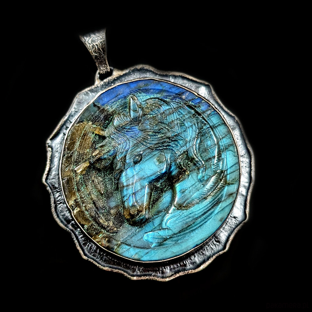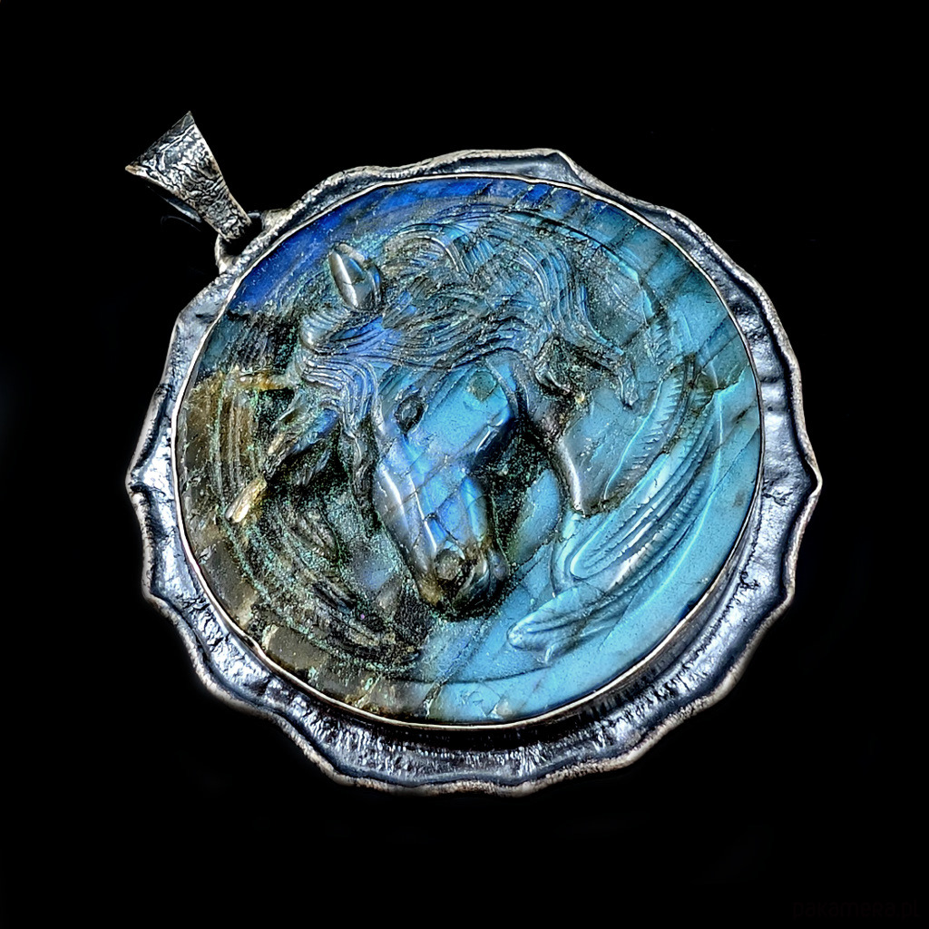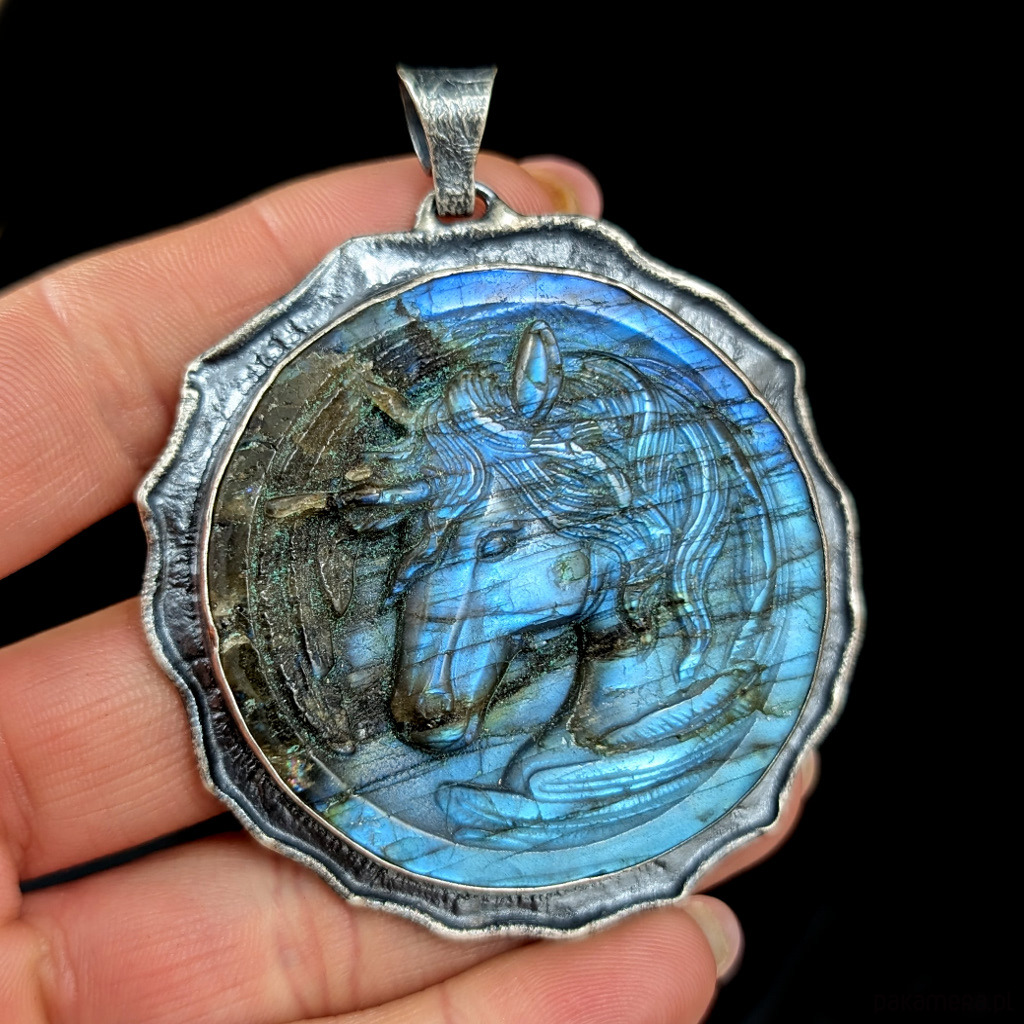 z oprawionym rzeźbionym w labradorycie przepięknym wizerunkiem eterycznego jednorożca.