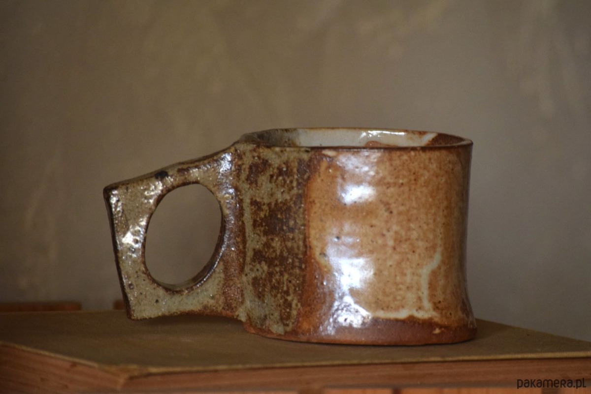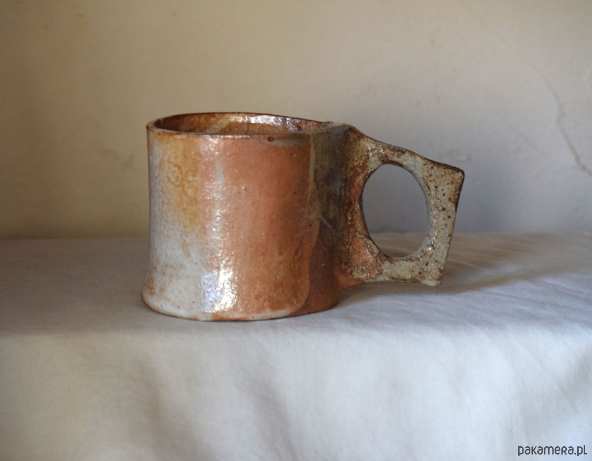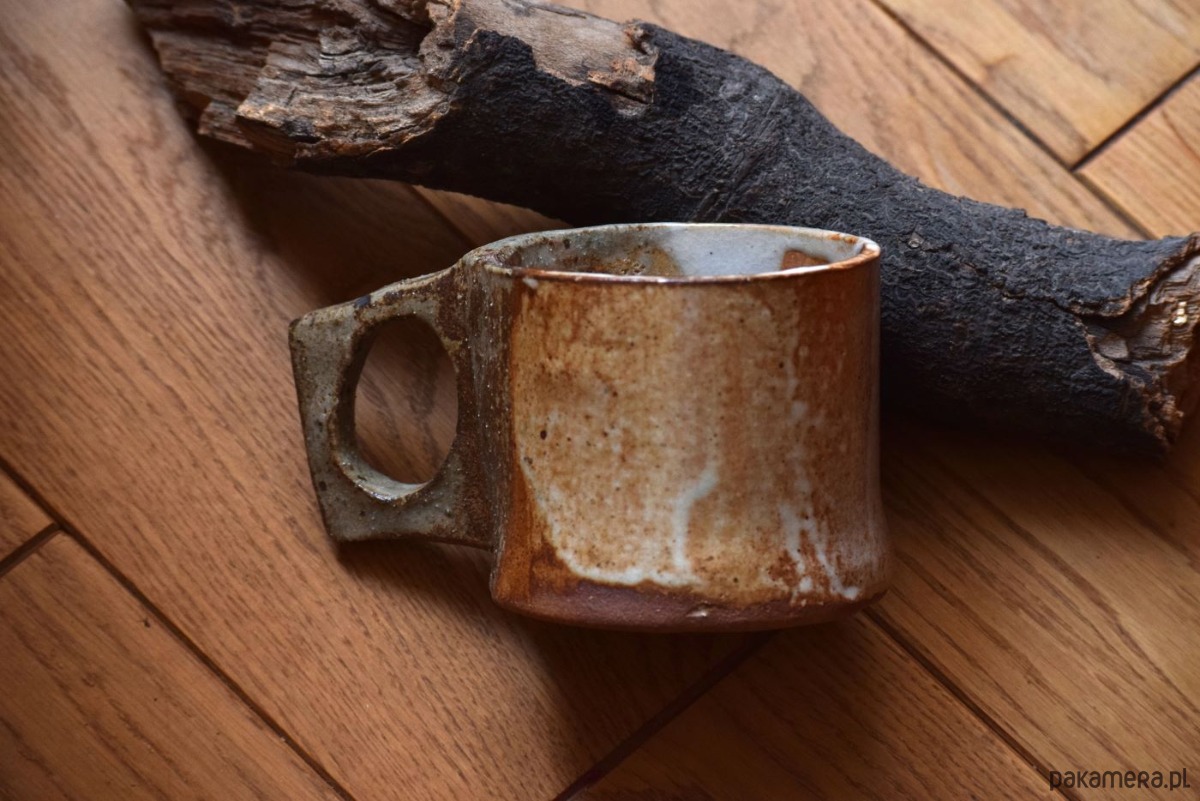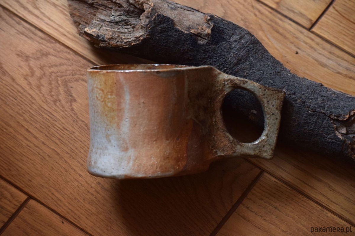 Celowo został pozbawiony idealnego owalu i idealnie prostego brzegu. To bowiem podkreśla jego prostotę i surowość. Wszystko czyni go bardziej naturalnym niż inne kubki handmade: •widoczność "ręki" w formie, •wypał w starodawnym piecu na drewno oraz •kolorystyka uzyskana z popiołu drzew.