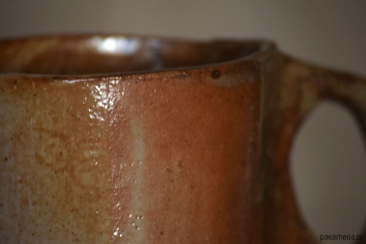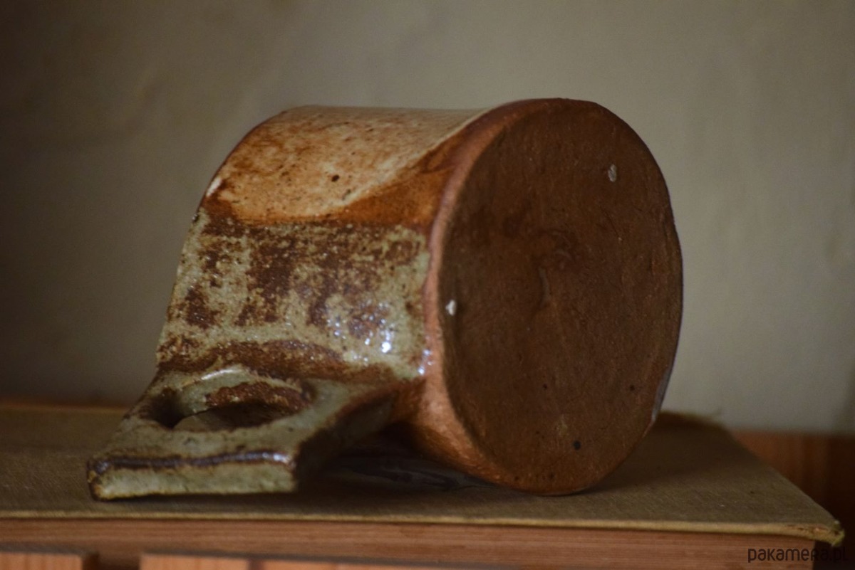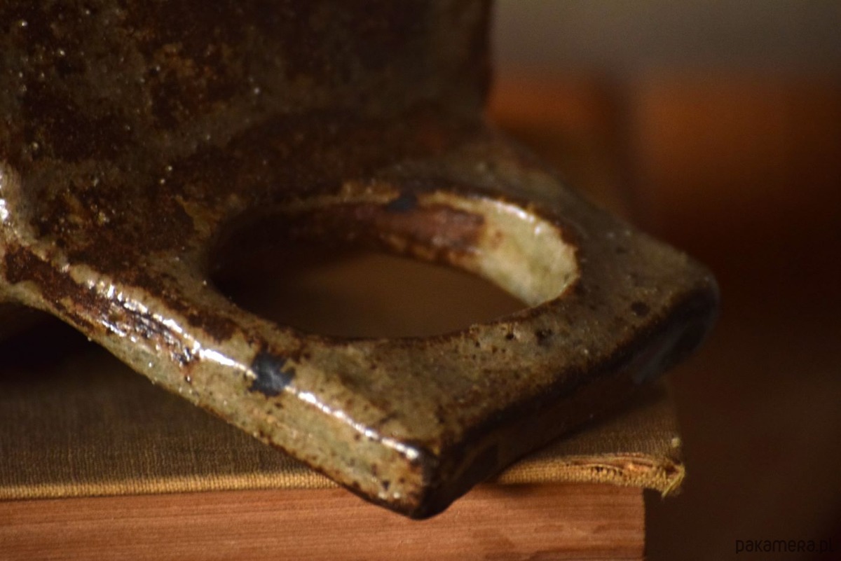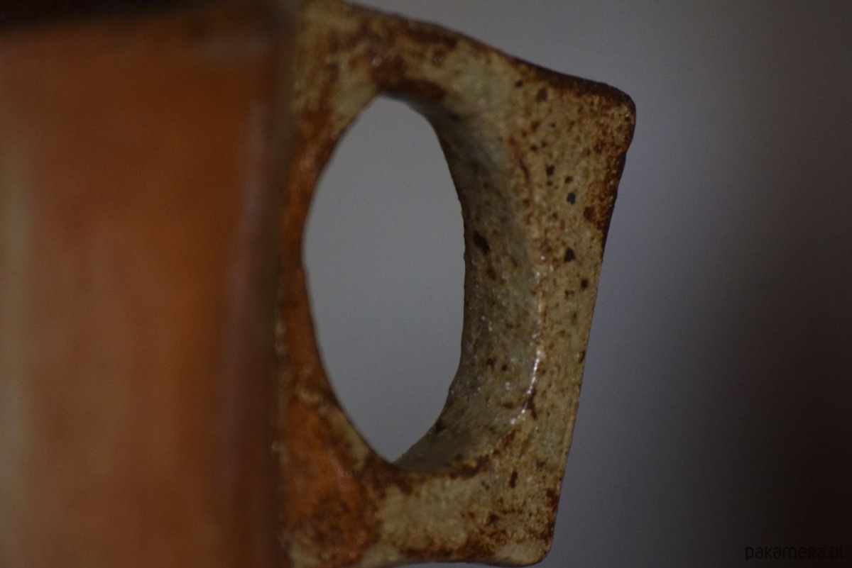 Celowo został pozbawiony idealnego owalu i idealnie prostego brzegu. To bowiem podkreśla jego prostotę i surowość. Wszystko czyni go bardziej naturalnym niż inne kubki handmade: •widoczność "ręki" w formie, •wypał w starodawnym piecu na drewno oraz •kolorystyka uzyskana z popiołu drzew.