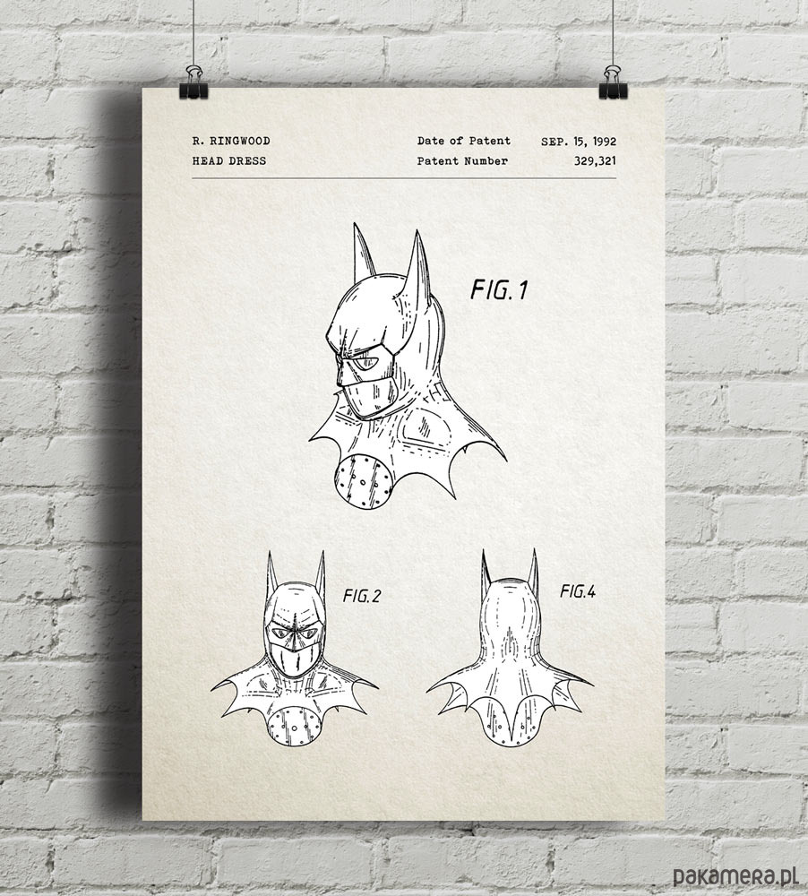 Plakat z reprodukcją patentu na maskę, wykorzystaną w filmie Powrót Batmana. Zaprojektowana przez R. Ringwood'a. Patent o numerze 329,321 został udzielony w 1992 roku przez Urząd Patentów i Znaków Towarowych Stanów Zjednoczonych.