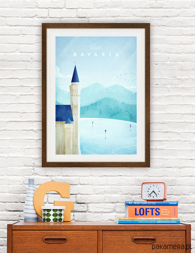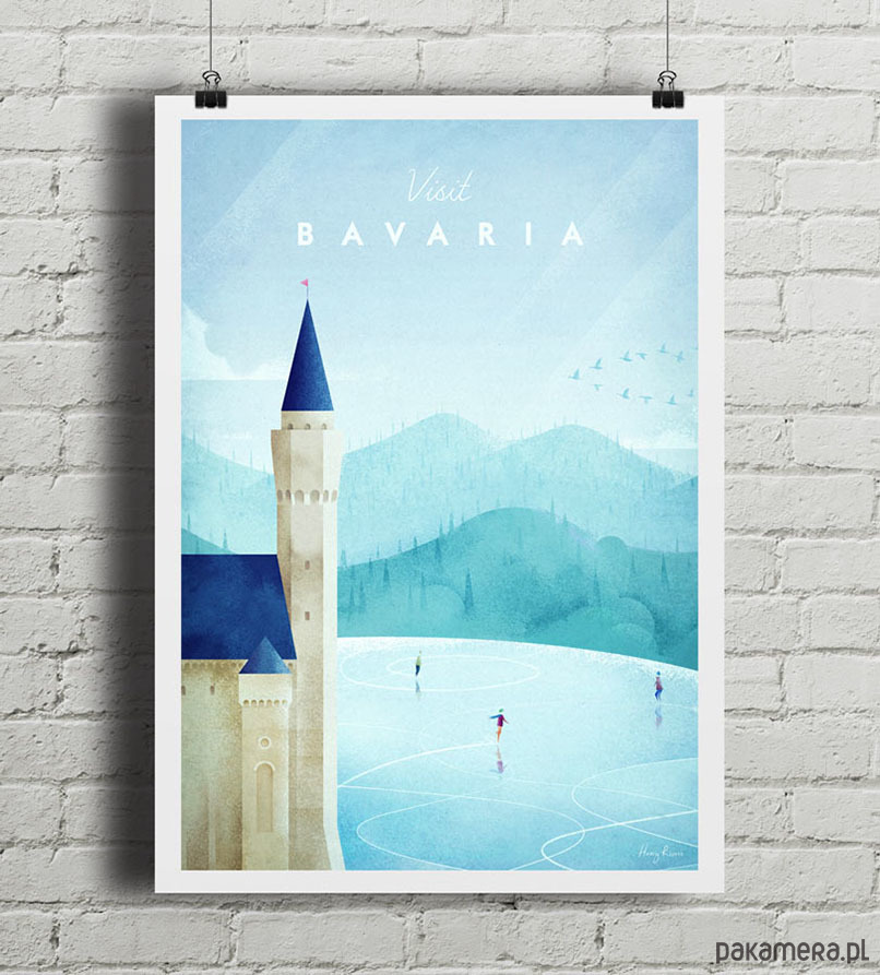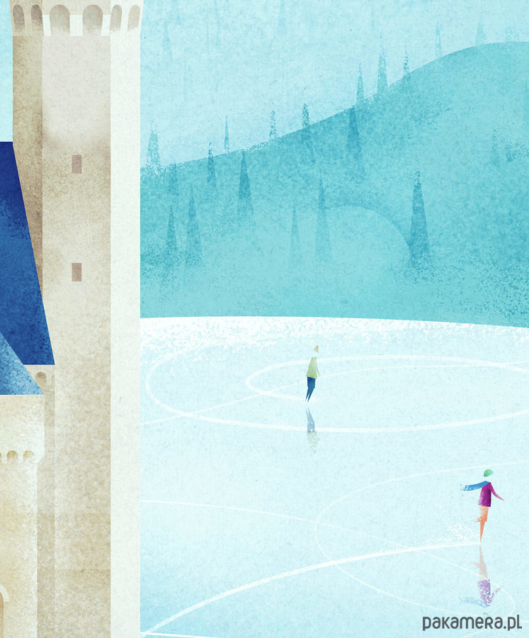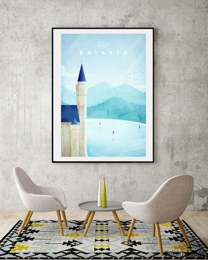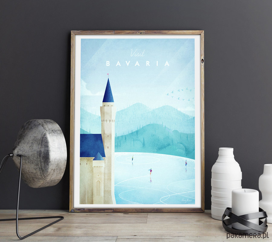 Plakat w stylu vintage przedstawiający zamek Neuschwanstein w Bawarii. Pod zamkowymi murami postacie jeżdżą na łyżwach po zamarzniętym jeziorze. W tle widać klucz gęsi przelatujący nad zalesionymi wzgórzami. Inspirowany plakatami podróżniczymi z lat 20-tych XX wieku.