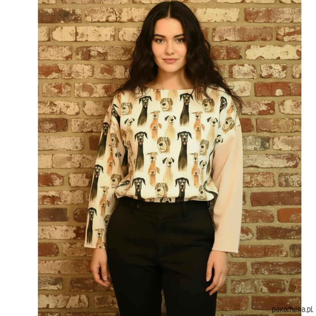 Ta nietypowa bluza bawełniana z nadrukiem śmiesznych psów to propozycja dla tych, którzy chcą połączyć wygodę z odrobiną humoru. Wzór przedstawiający zabawne psy w różnych pozach natychmiast przyciąga uwagę, a przy tym dodaje stylizacji lekkości i radości.