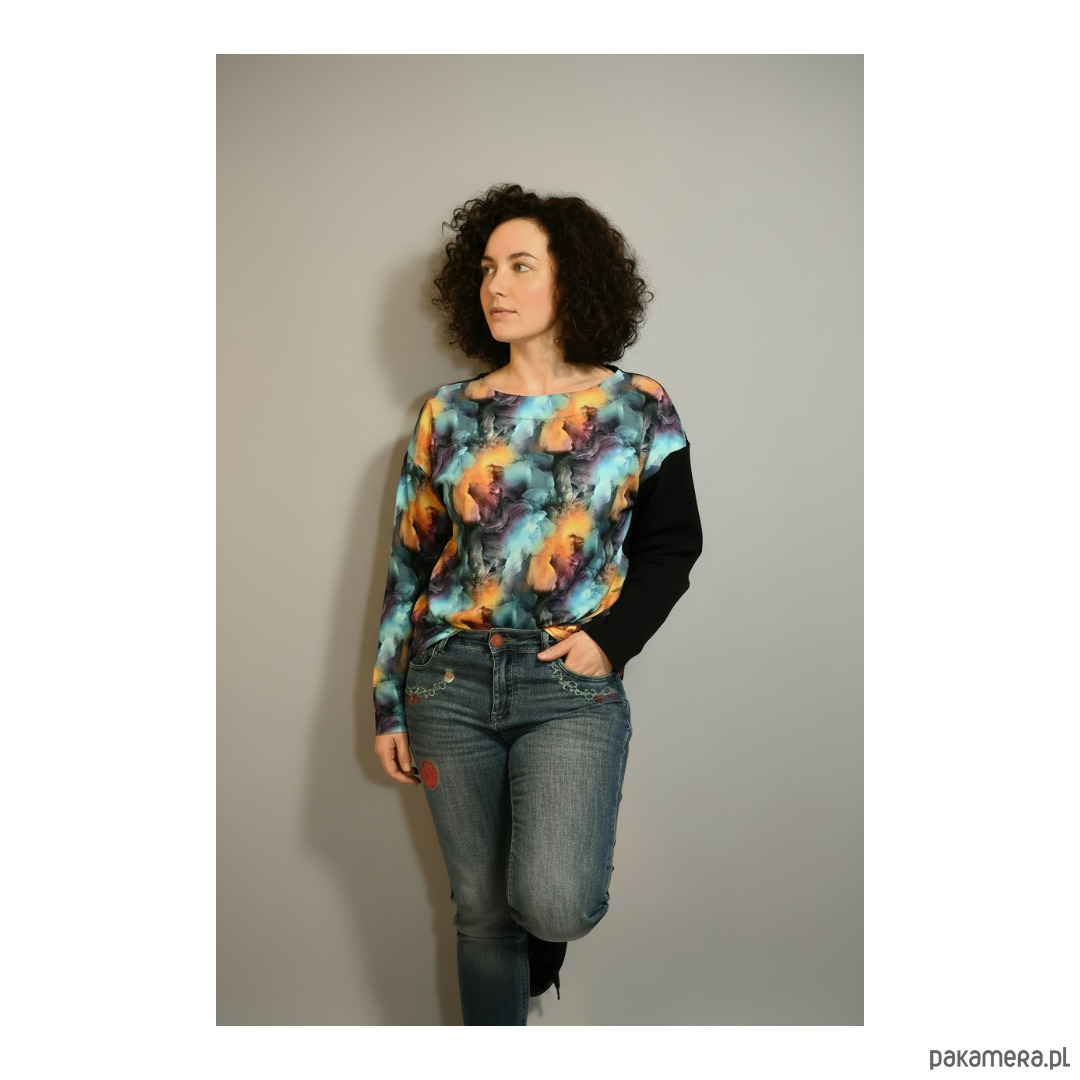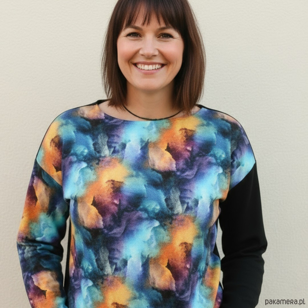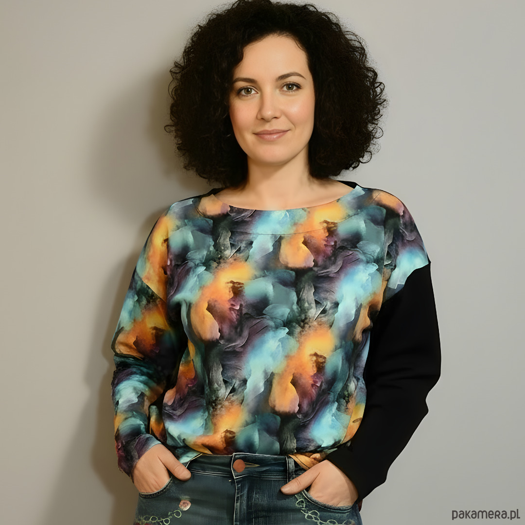 Nietypowa bluza bawełniana Kolorowy Dym to propozycja dla osób, które nie boją się podkreślać swojej indywidualności. Dzięki efektownej grafice przypominającej kolorowy dym w odcieniach błękitu, pomarańczu i fioletu, ubranie zyskuje wyjątkowy, artystyczny charakter. Co więcej, kontrastowy czarny rękaw dodaje całości wyrazistości, tworząc intrygujące połączenie barw i form. To nie tylko bluza – to sposób, by wyrazić siebie.