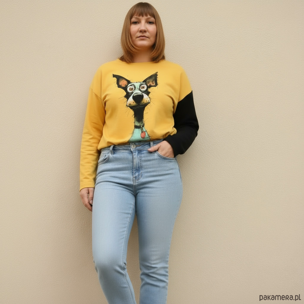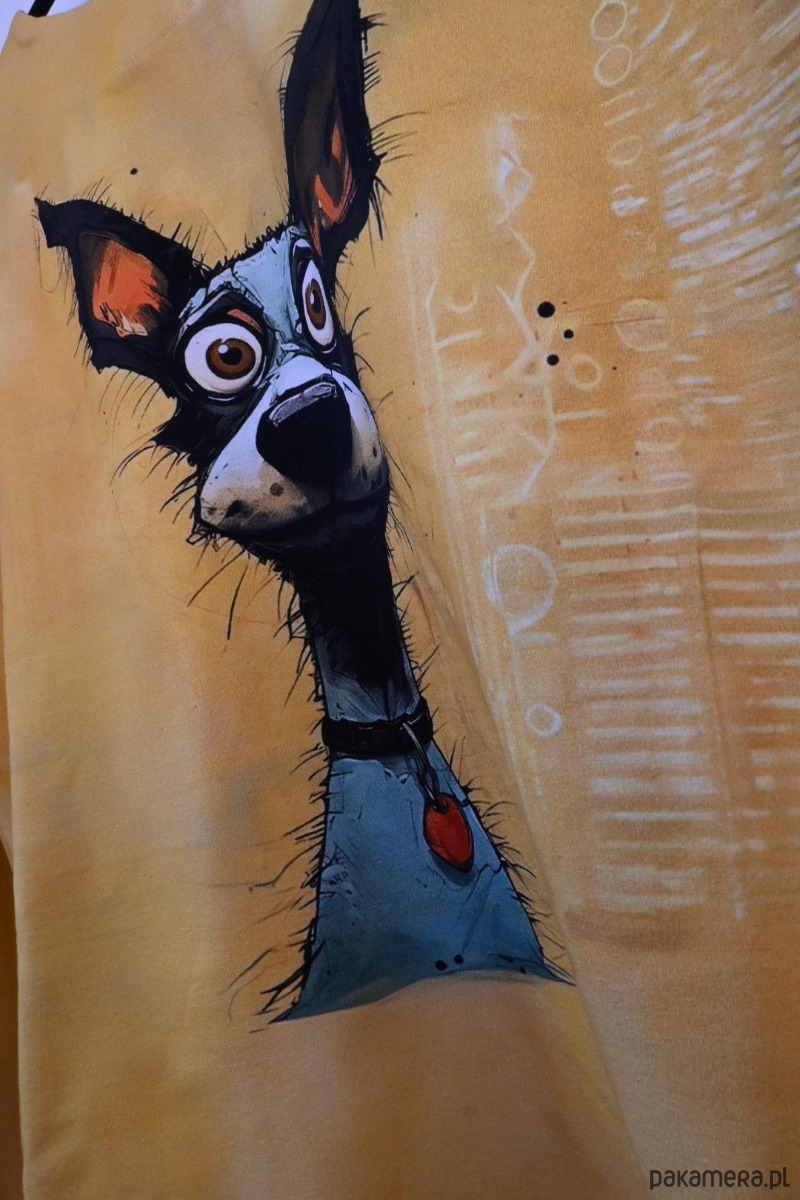 Jeśli szukasz czegoś wyrazistego, z charakterem i dużą dawką dobrego humoru – ta bluza jest dla Ciebie. Nietypowa bluza bawełniana Zwariowany Pies to połączenie intensywnego żółtego koloru, kontrastowego czarnego rękawa oraz nadruku, który od razu poprawia nastrój. Wesoły psiak z szaloną miną nie tylko przyciąga wzrok, ale też wywołuje uśmiech – Twój i każdego, kto spojrzy.