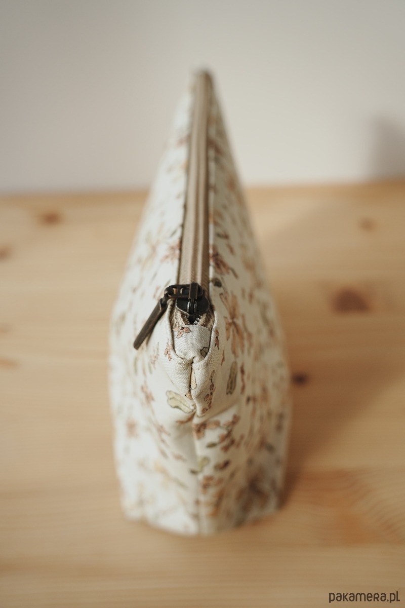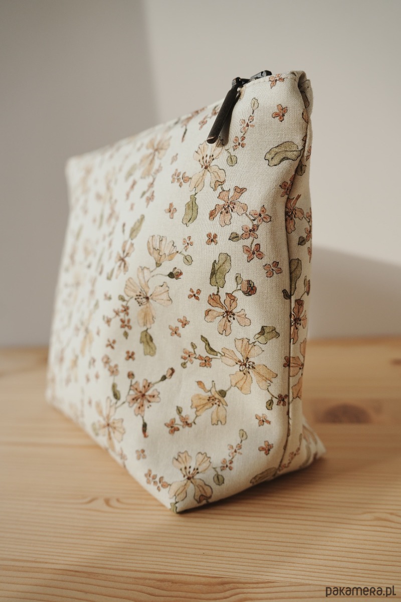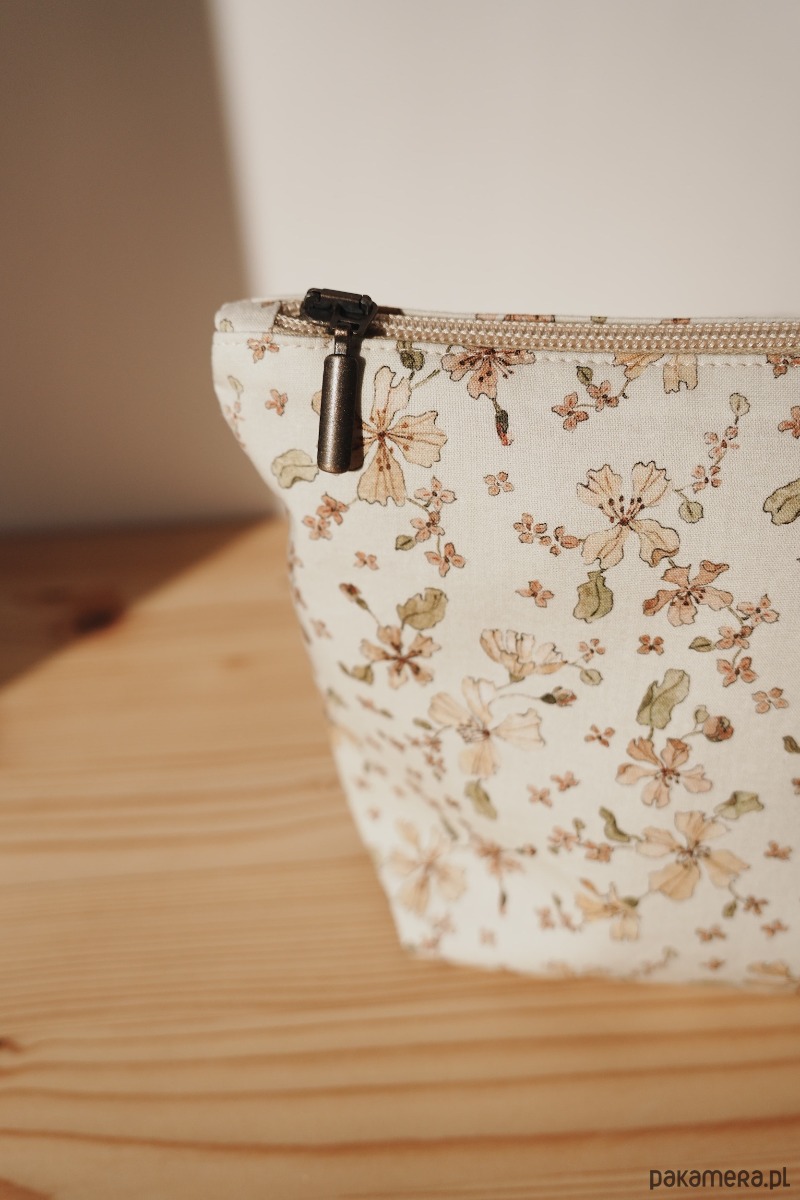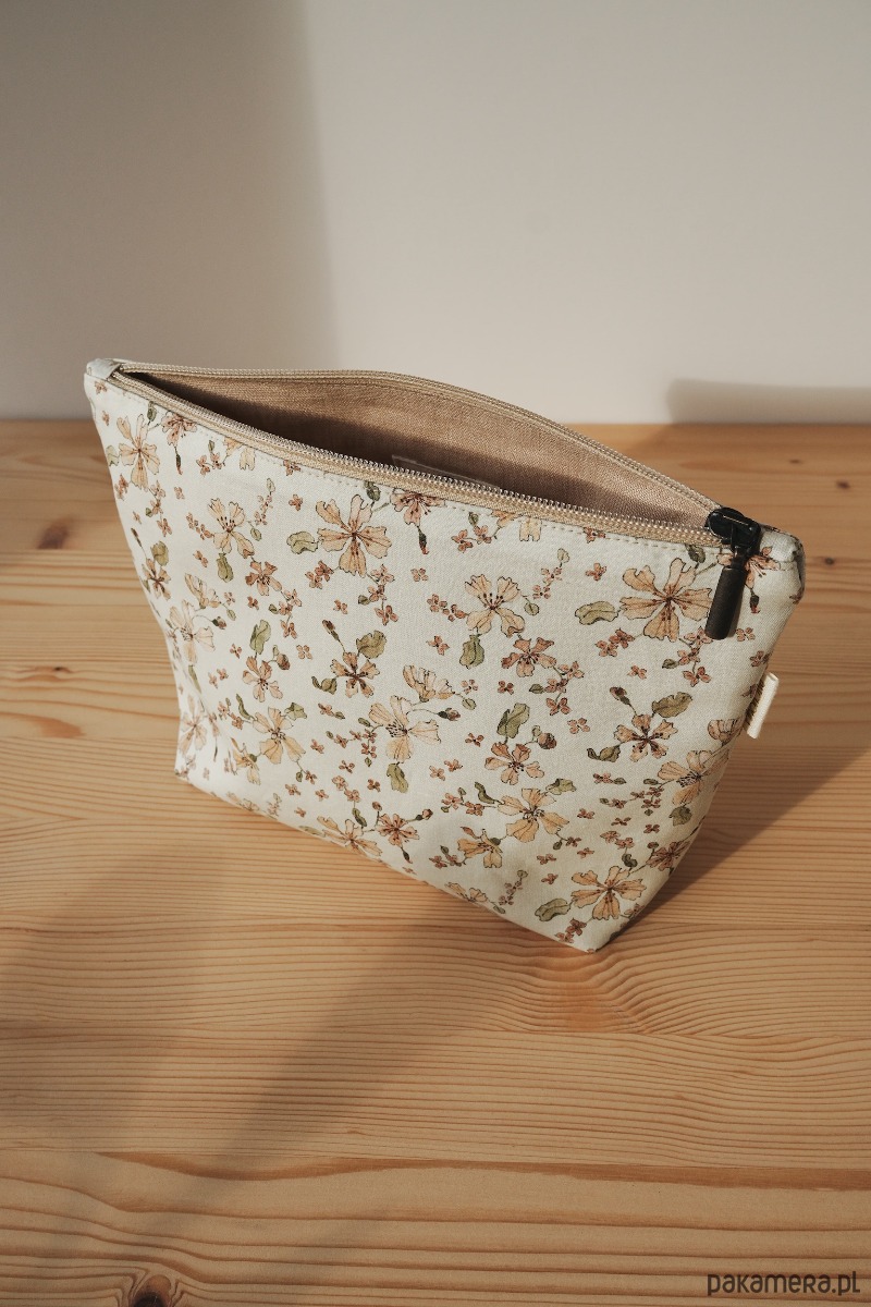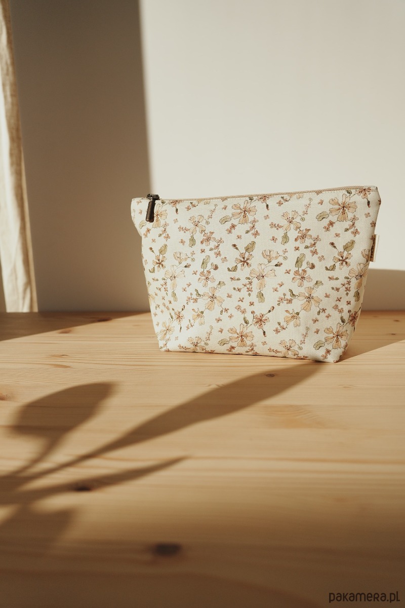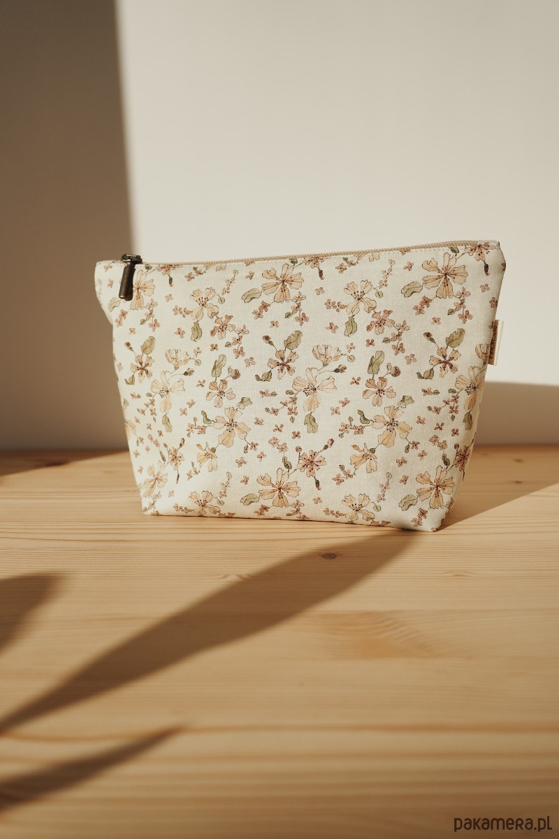 Na zewnątrz bawełniana tkanina z kwiatowym motywem. Ten unikalny wzór został ręcznie namalowany przy użyciu farb akwarelowych, a następnie wydrukowany cyfrowo przy użyciu nietoksycznych pigmentów na bazie wody. Wewnątrz lniana delikatna podszewka w kolorze piaskowym. Całość dopełniona retro zamkiem. W środku bawełniana metka z logo marki.