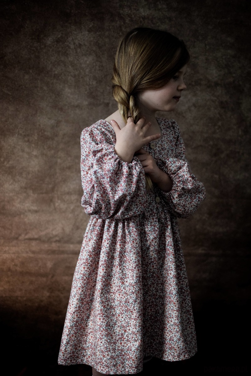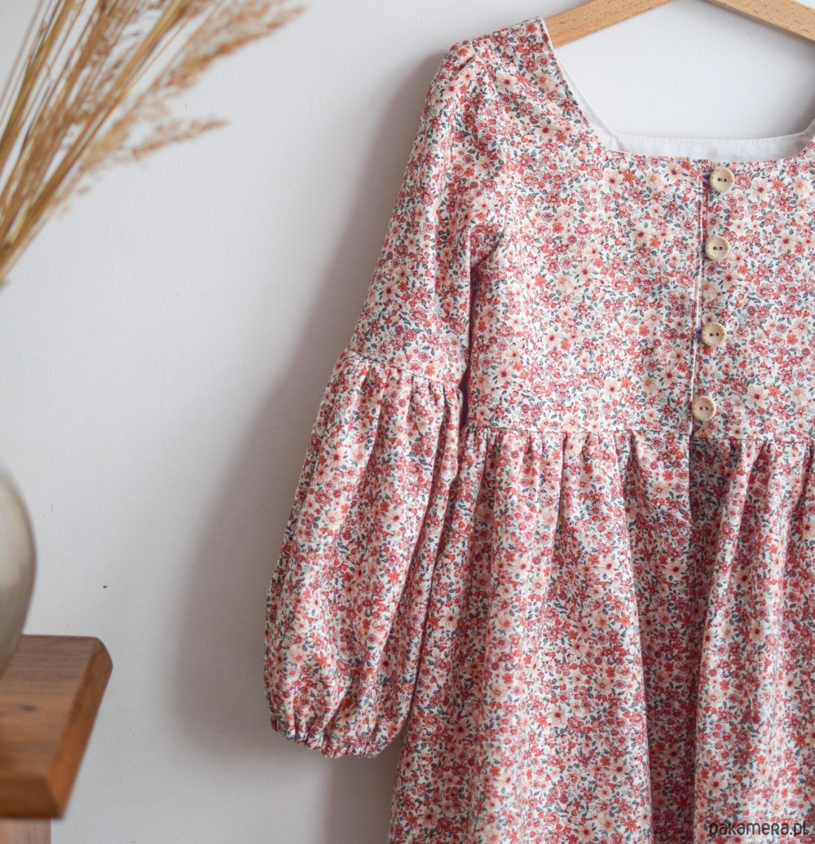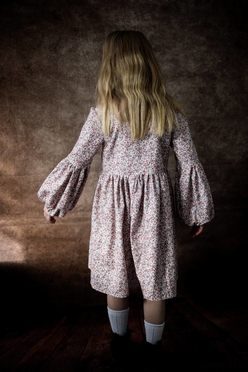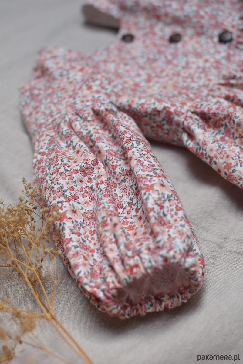 Sukienka uszyta z bawełny organicznej w kwiatowy print. Zapinana z przodu na kokosowe guziki. Sukienka ma piękne bufiaste rękawy.