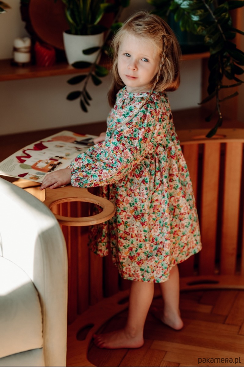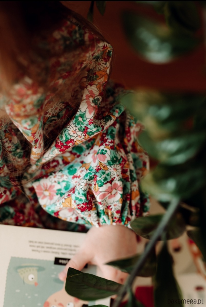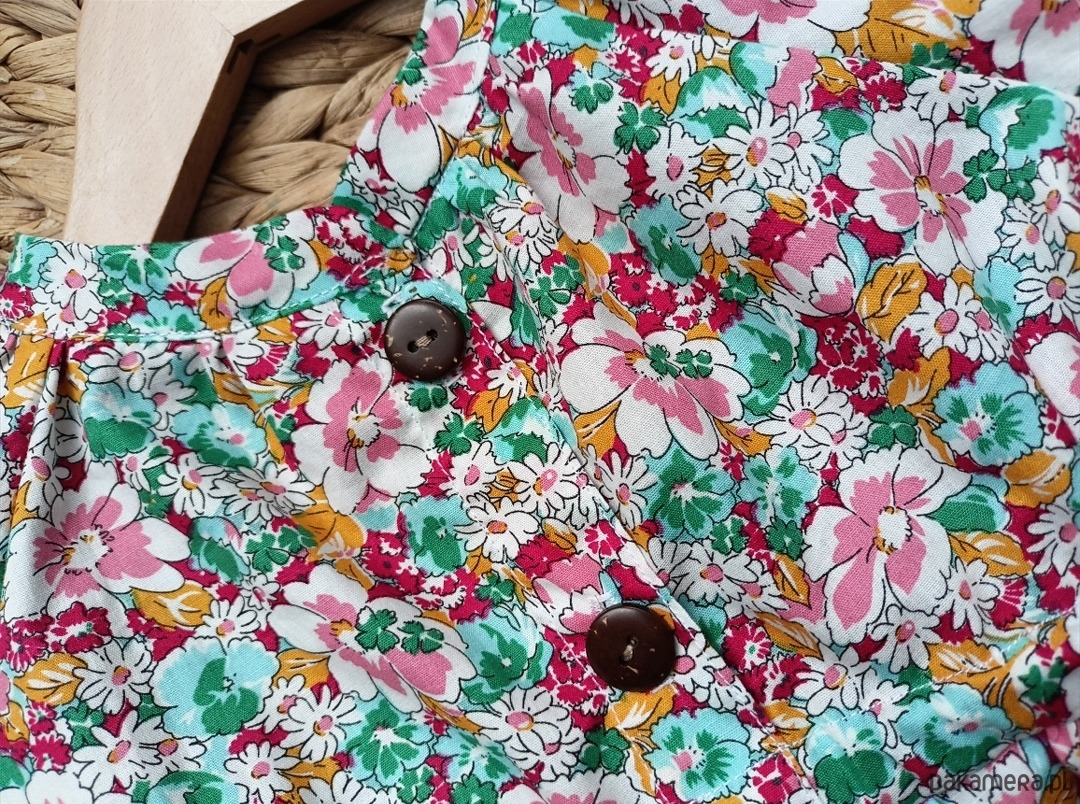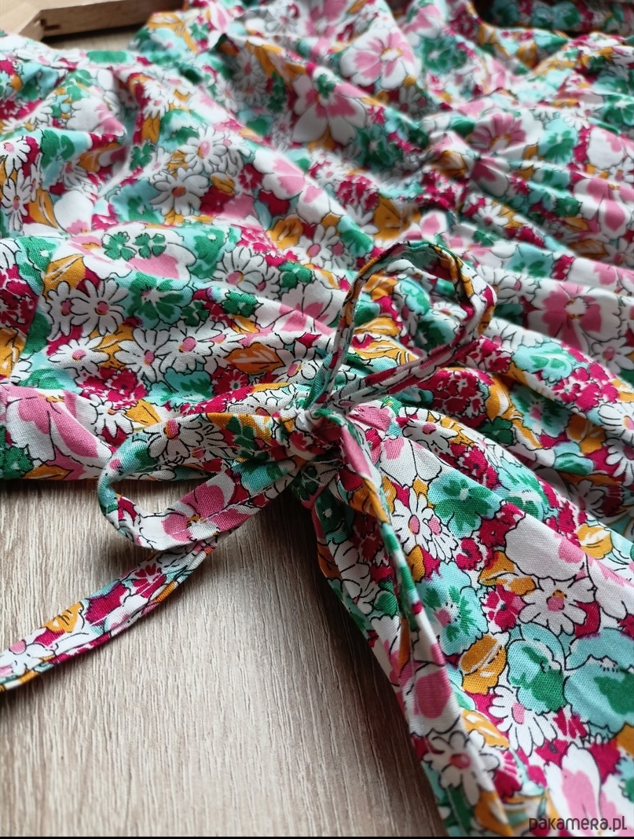 Sukienka uszyta z bawełny w piękny kwiatowy print. Wiązana na bokach. Z tyłu zapinana na guziki. Szerokie rękawy, wykończone nieuciskającą gumką.