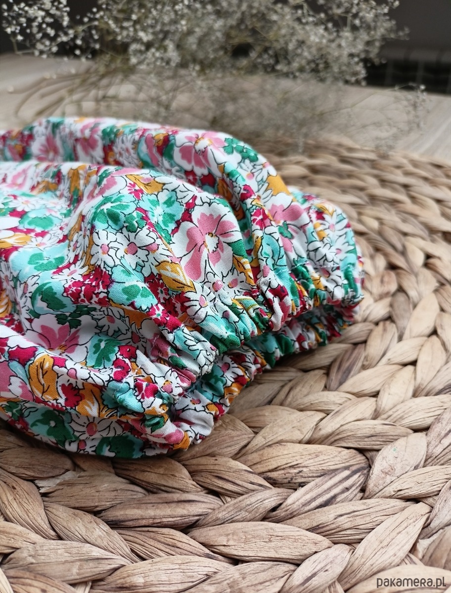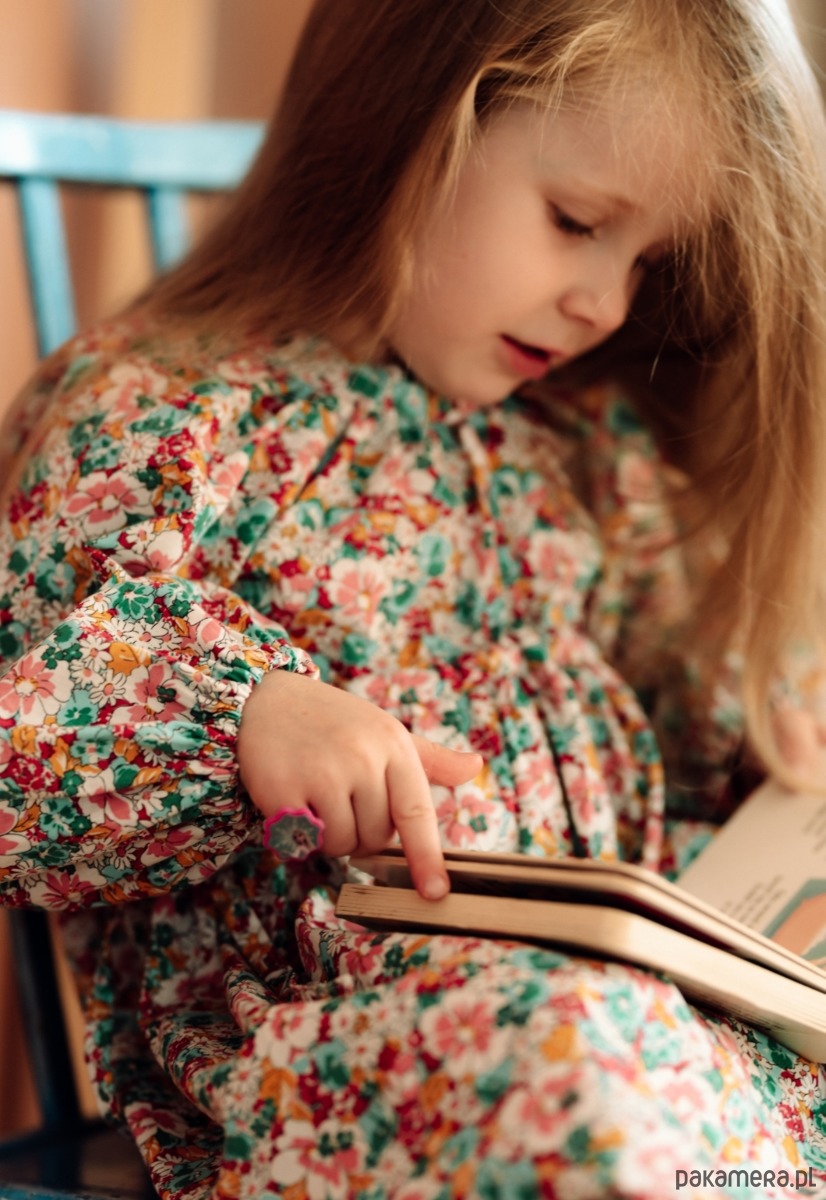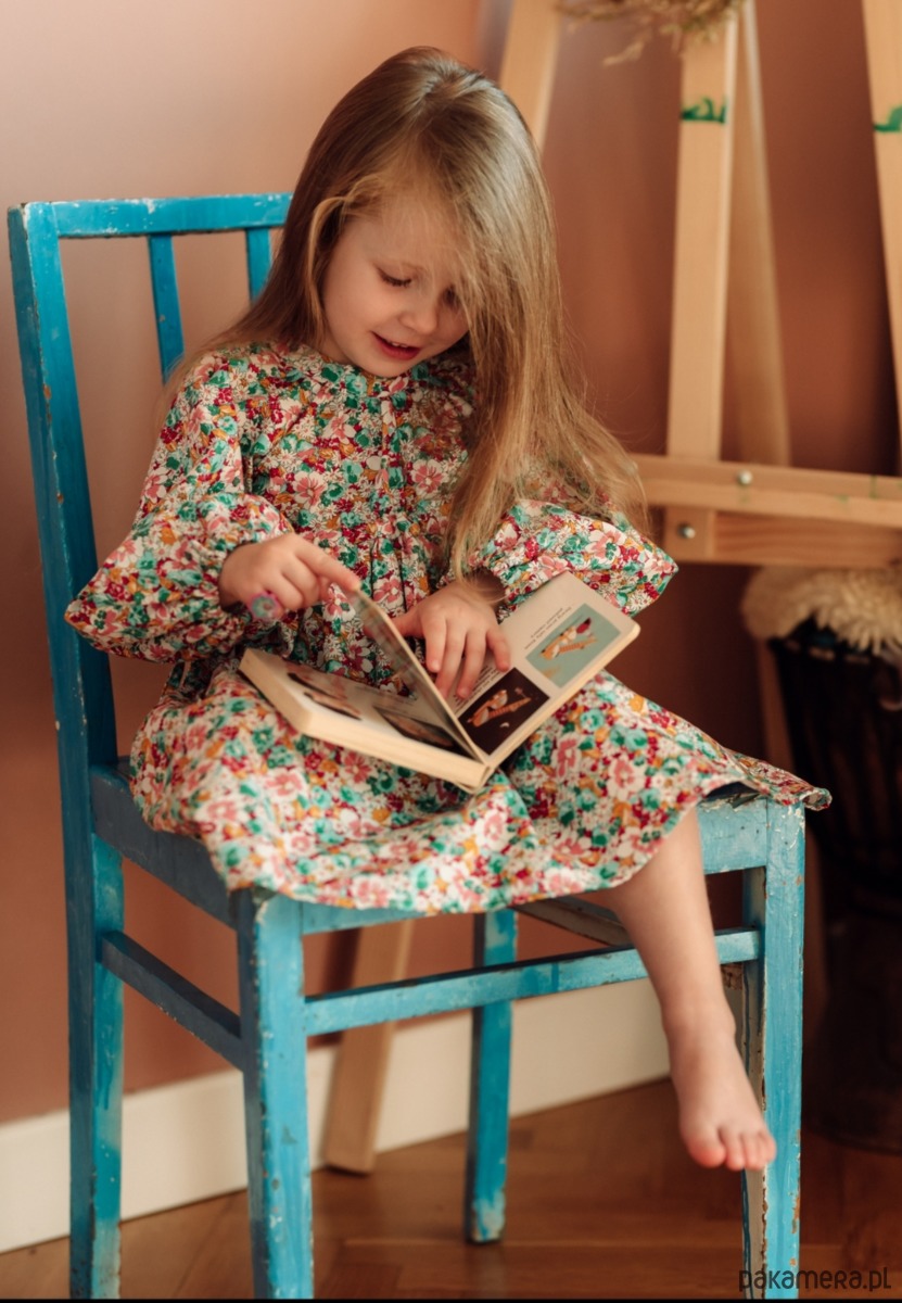 Sukienka uszyta z bawełny w piękny kwiatowy print. Wiązana na bokach. Z tyłu zapinana na guziki. Szerokie rękawy, wykończone nieuciskającą gumką.